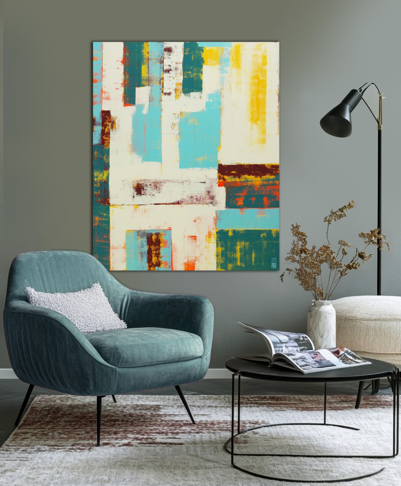This abstract artwork is a vibrant tapestry of geometric shapes and bold colors. Dominating the palette are rich blues and yellows, punctuated by stark white and deep reds. The composition is a masterful interplay of vertical and horizontal rectangles, each layer adding depth and intrigue. Brushstrokes are both assertive and textured, providing a tactile element to the visual experience. The balance of color and form suggests a dynamic yet harmonious atmosphere, inviting viewers to explore its complexity. Unique in its ability to evoke emotion through minimalism, the piece captures a sense of movement and energy. The juxtaposition of warm and cool tones enhances its modern aesthetic, making it a striking example of contemporary abstract art. This work is a testament to the power of color and form to communicate beyond words.