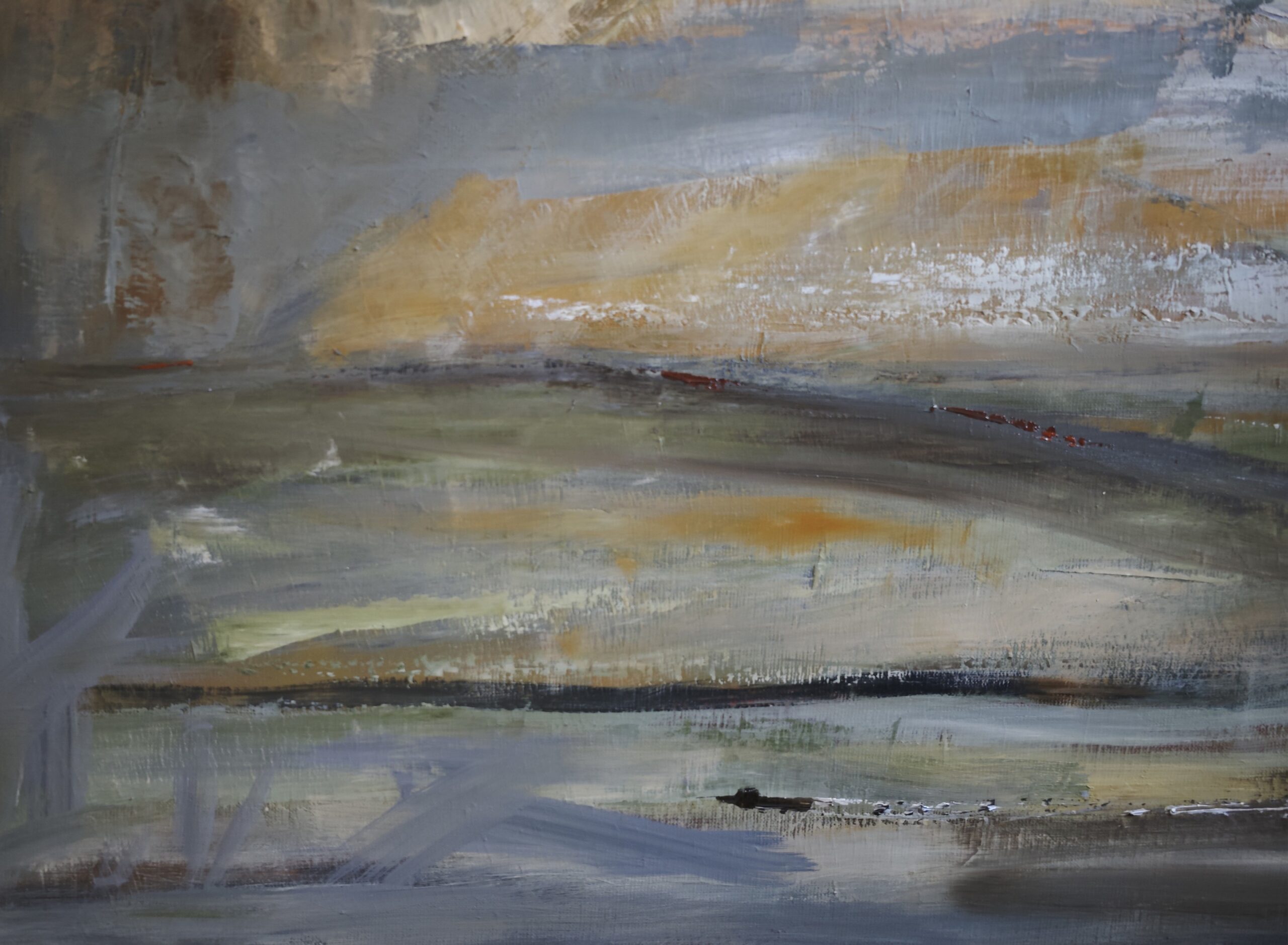 The deliberately restrained palette blends nuanced greys, patinated whites, and muted tones, punctuated by warmer ochre passages that anchor the surface without disrupting its balance. These chromatic accents act like breaths, creating a subtle tension within a calm and controlled whole.