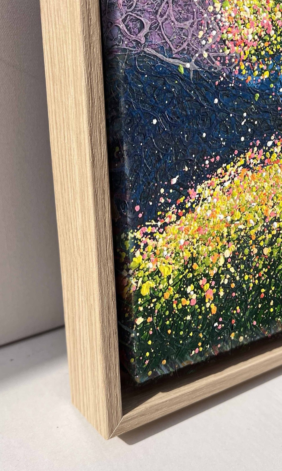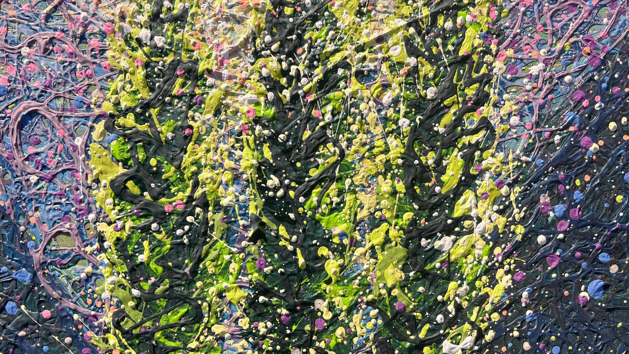 This painting guides you toward that inner space, where textures bloom, light dances, and calm turns into joy. Painted in soft greens, airy blues, and radiant white, with spontaneous Pollock-style splashes, the artwork embodies the freedom, warmth, and playful energy of summer. It celebrates life in motion — open, alive, and endlessly inspiring.