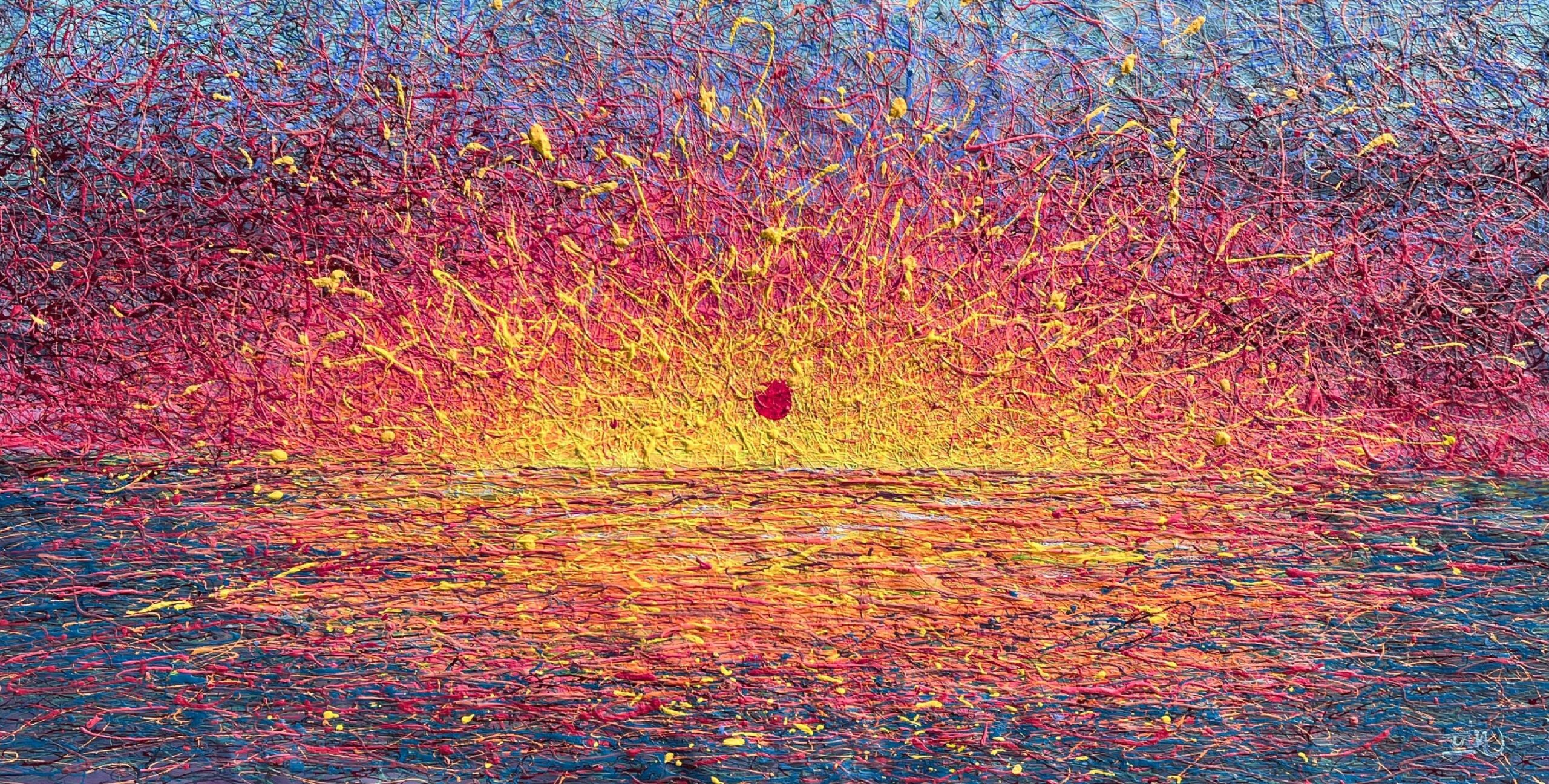 This textured sunset painting captures a vivid pink, yellow, and orange sky glowing over the ocean, created with a unique multi-layer “threads of paint” technique.