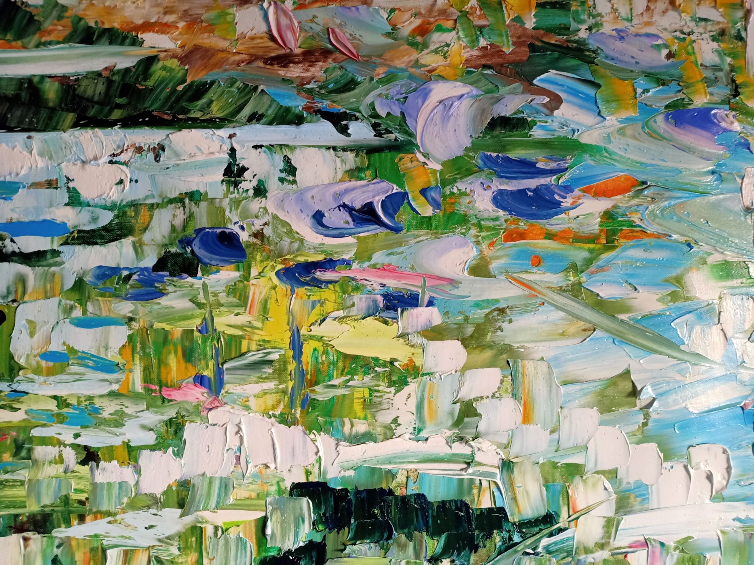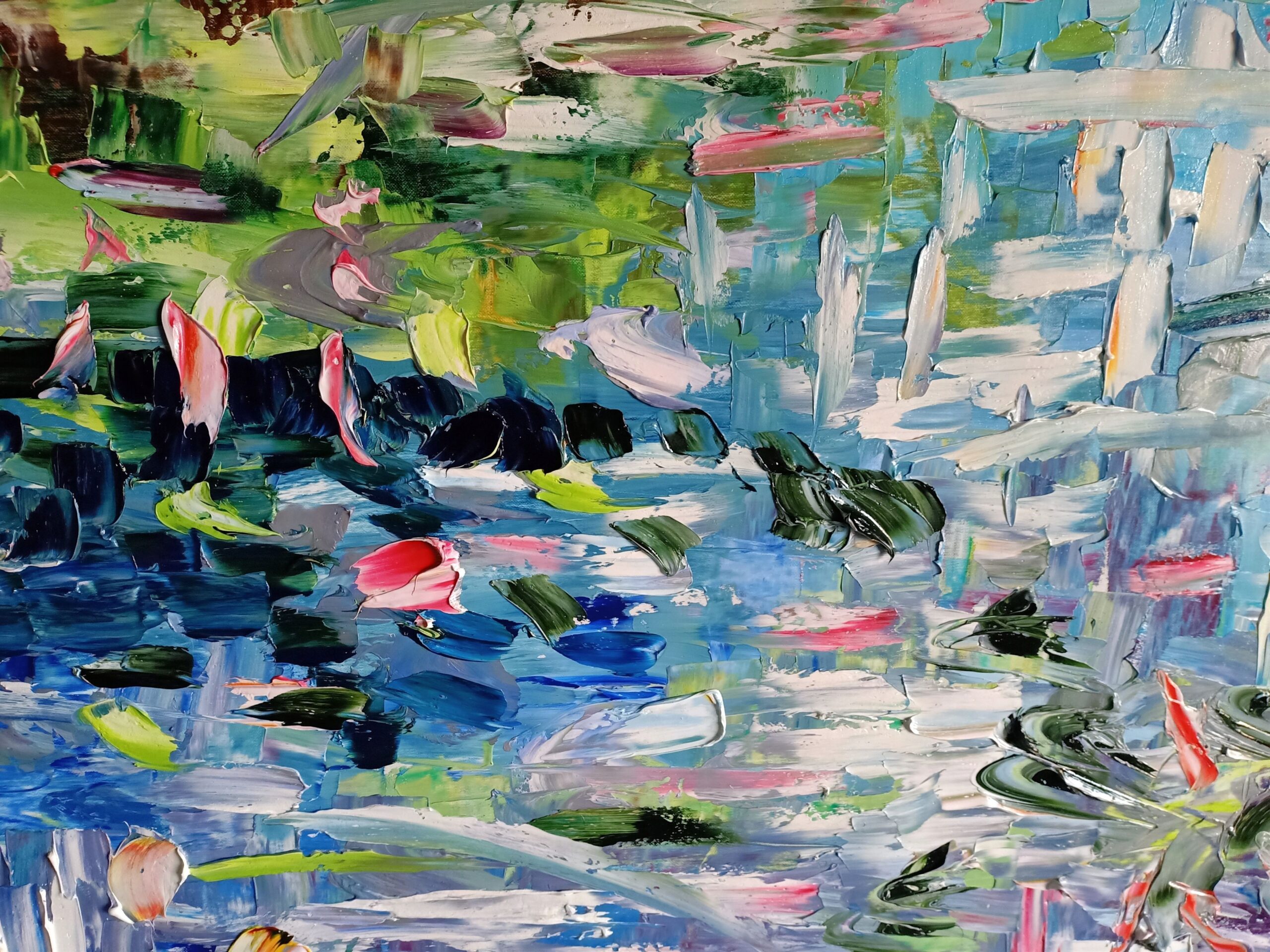 Le ninfe emergono tra i fiori, evocando un senso di mistero ed eleganza. La tavolozza dei colori ricorda i capolavori impressionisti, mentre la tecnica divisionista permette di cogliere i riflessi sull’acqua con estrema precisione. L’opera invita lo spettatore a immergersi in un mondo di bellezza e serenità, facendolo desiderare di possedere il dipinto per poterlo ammirare ogni giorno nella propria casa.