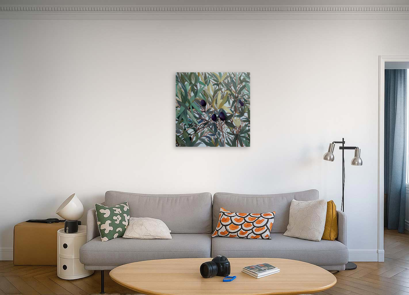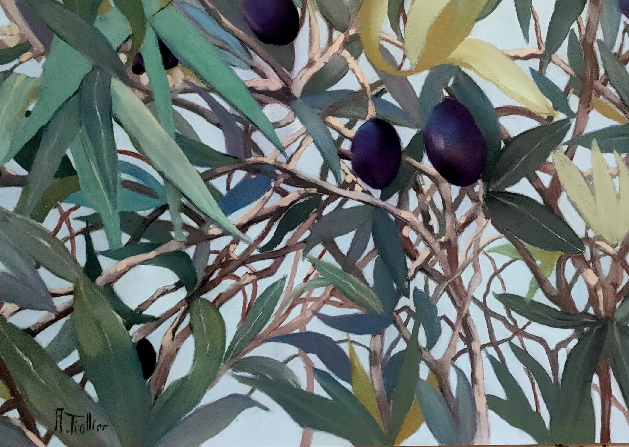 This work depicts a lush olive tree, its green and silver leaves blending into a dense, vibrant tapestry. The olives, a deep, striking purple, stand out against the foliage, adding an intense and contrasting touch. Every detail is meticulously rendered, from the texture of the leaves to the subtle reflections on the fruit. The intricate composition of the branches creates a sense of movement and vitality, transporting the viewer to the heart of exuberant nature. The light seems to softly filter through the leaves, giving the whole a peaceful and serene ambiance. The artist masterfully captures the beauty and richness of this iconic tree, symbolizing both peace and longevity. The harmony of colors and the precision of the line make this work a remarkable piece that invites contemplation.