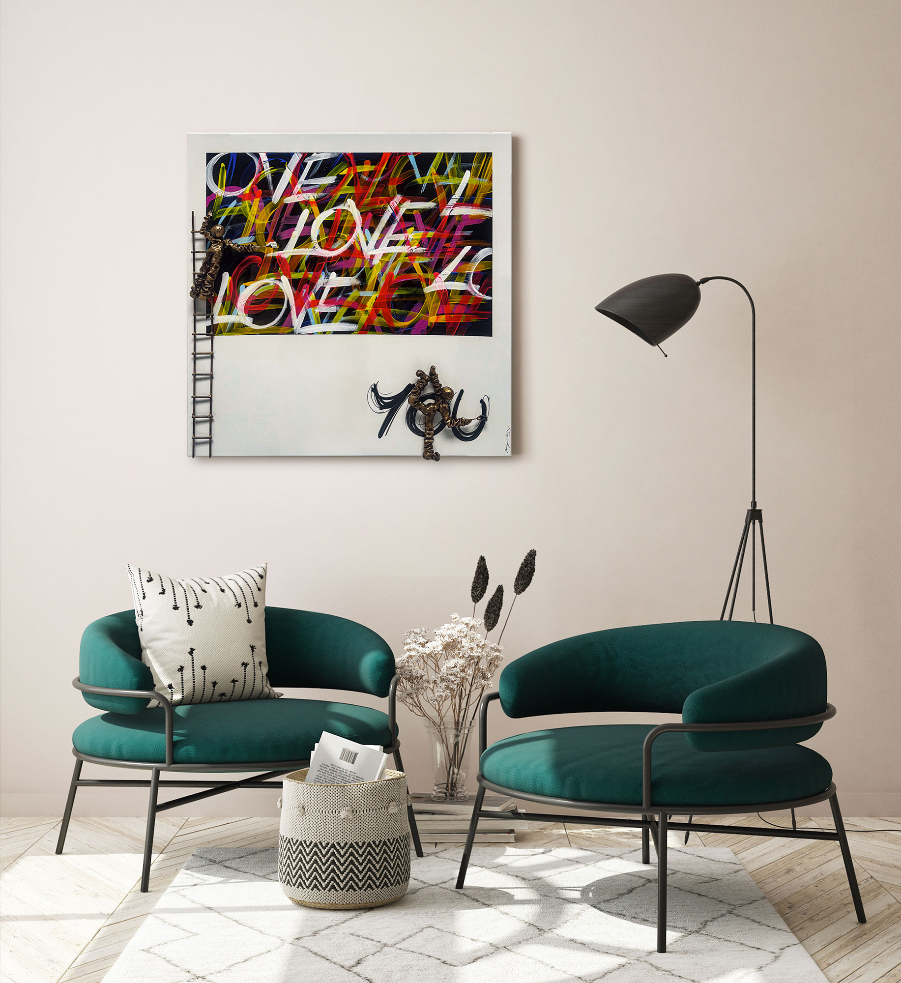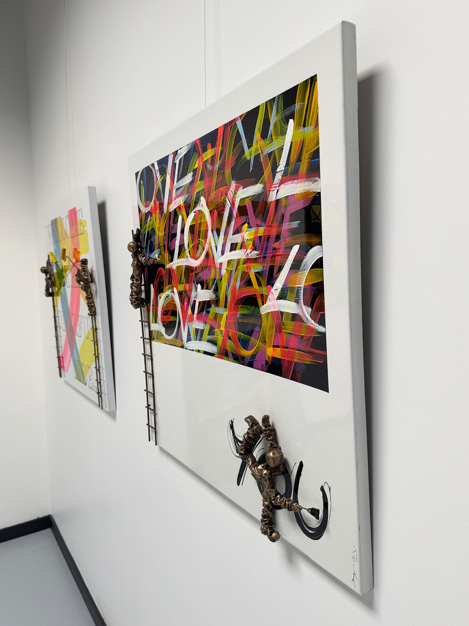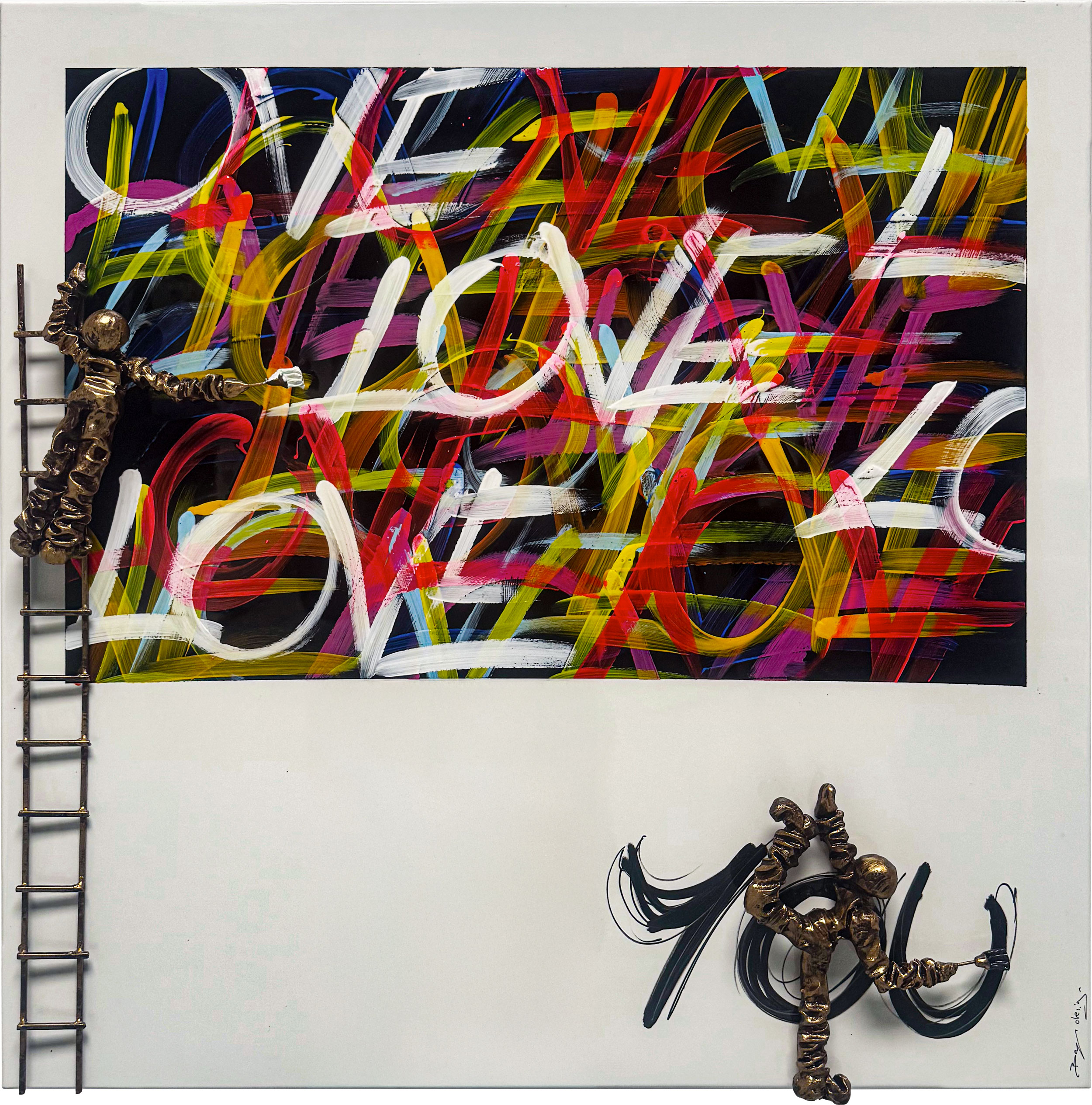 Het woord "LOVE" staat prominent in vetgedrukte, overlappende stijlen. De achtergrond pulseert met een ingewikkeld samenspel van kleuren - rood, blauw, geel en wit - waardoor een levendig tapijt ontstaat dat de aandacht trekt. Het toevoegen van een uniek driedimensionaal element, ingewikkeld bewerkte figuren lijken te interageren met het stuk. Eén figuur, die een ladder beklimt, toont de ambitie en nieuwsgierigheid om zich bezig te houden met het woord "LOVE", terwijl een andere figuur onderaan gevangen is in een moment van expressieve actie, schijnbaar gevormd door vloeiende, lintachtige vormen. Deze sculpturale elementen introduceren textuur en diepte, en overbruggen de ruimte tussen de kijker en het levendige doek. De harmonie van gemengde media en gedurfde beelden verheft het werk, waardoor het zowel een visueel spektakel wordt als een conceptuele verkenning van de veelzijdige aard van de liefde.