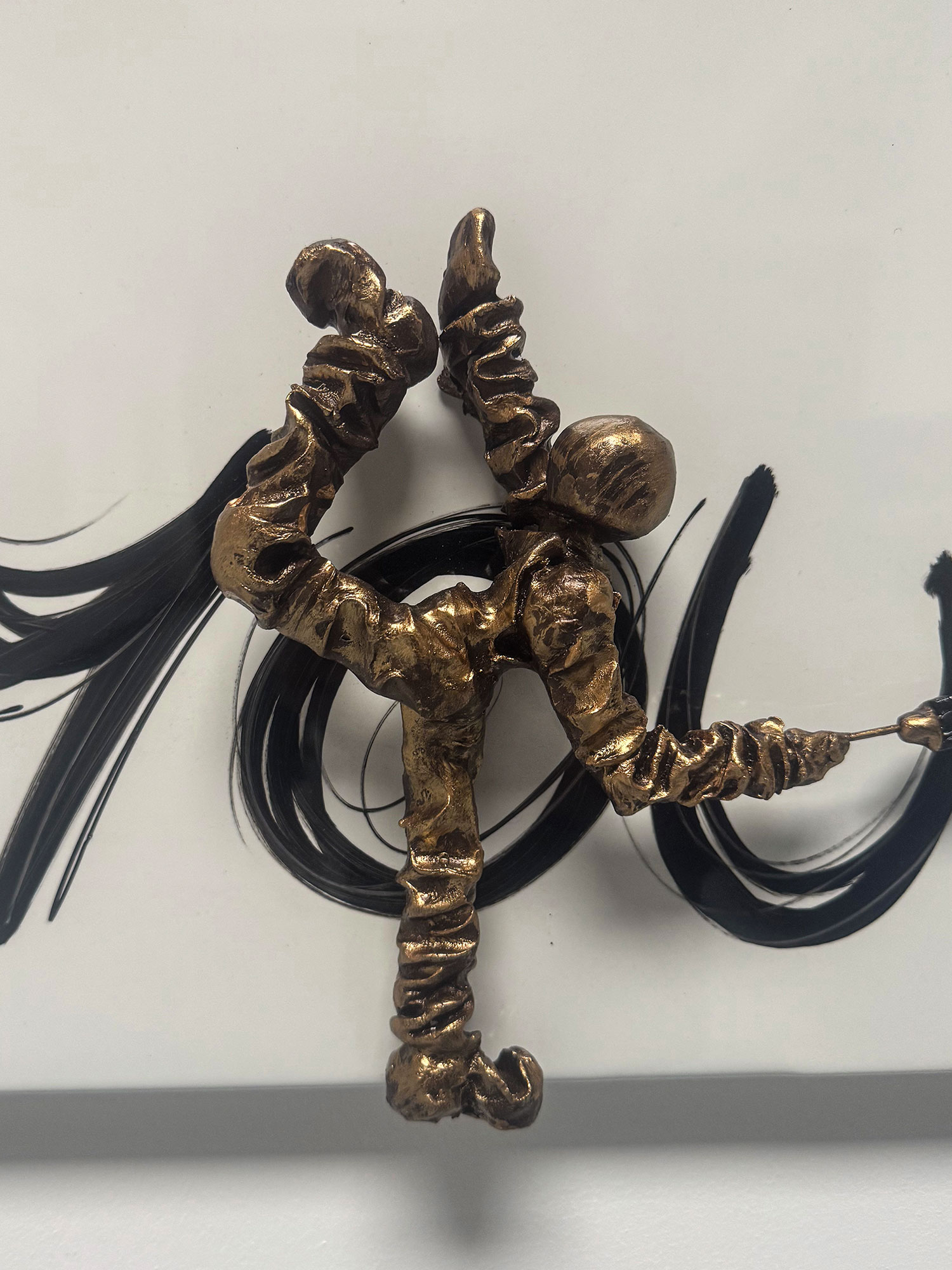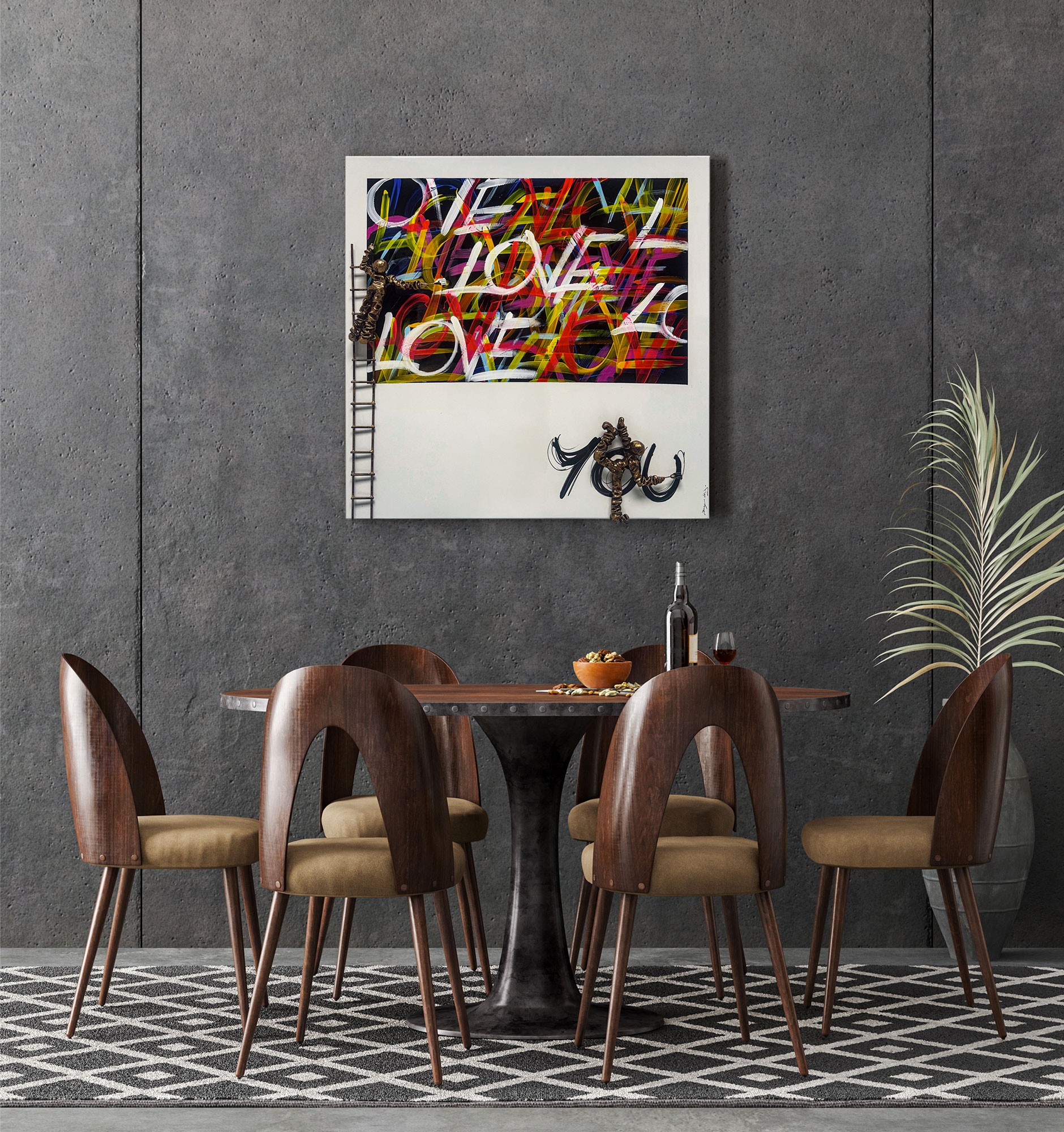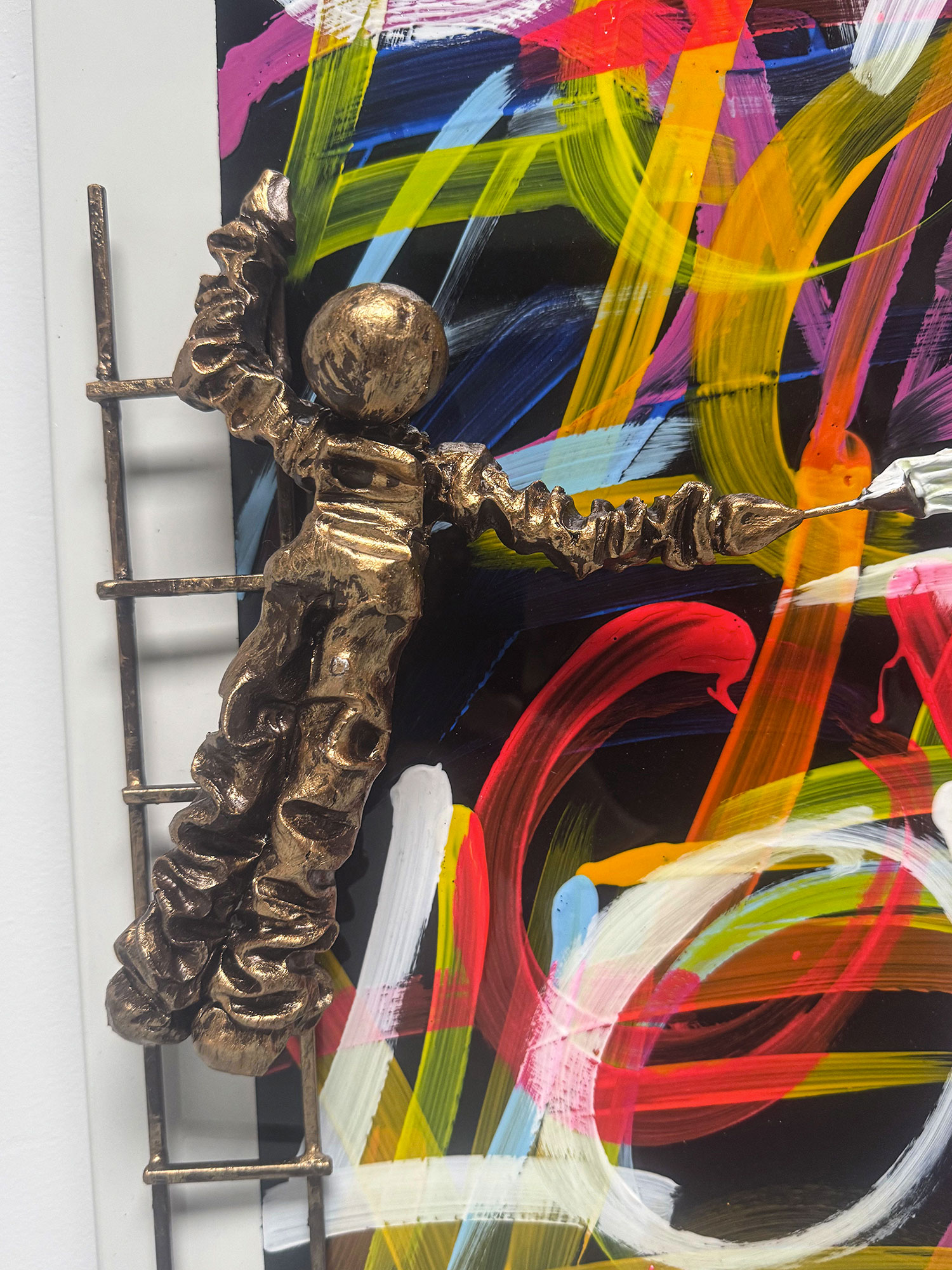Het woord "LOVE" staat prominent in vetgedrukte, overlappende stijlen. De achtergrond pulseert met een ingewikkeld samenspel van kleuren - rood, blauw, geel en wit - waardoor een levendig tapijt ontstaat dat de aandacht trekt. Het toevoegen van een uniek driedimensionaal element, ingewikkeld bewerkte figuren lijken te interageren met het stuk. Eén figuur, die een ladder beklimt, toont de ambitie en nieuwsgierigheid om zich bezig te houden met het woord "LOVE", terwijl een andere figuur onderaan gevangen is in een moment van expressieve actie, schijnbaar gevormd door vloeiende, lintachtige vormen. Deze sculpturale elementen introduceren textuur en diepte, en overbruggen de ruimte tussen de kijker en het levendige doek. De harmonie van gemengde media en gedurfde beelden verheft het werk, waardoor het zowel een visueel spektakel wordt als een conceptuele verkenning van de veelzijdige aard van de liefde.