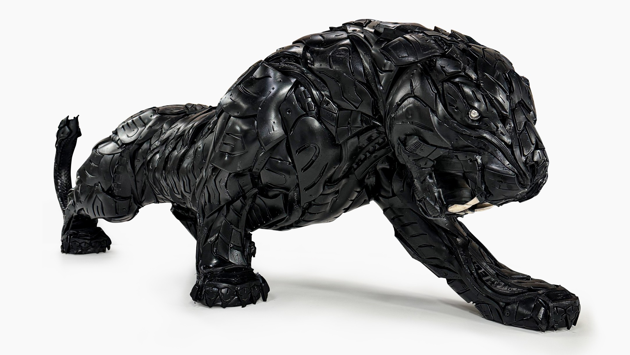 Iwi's zwarte pantersculptuur, ingenieus gemaakt van gerecyclede autobanden, belichaamt zijn kunstenaarschap en milieubewuste benadering. De slanke, krachtige vorm vangt de essentie van de panter met opmerkelijke precisie en toont Lahcen's meesterschap in het transformeren van onconventionele materialen in fascinerende kunst. Met deze creatie toont hij niet alleen uitzonderlijk vakmanschap, maar benadrukt hij ook zijn inzet voor een duurzaam milieu op een visueel opvallende manier.