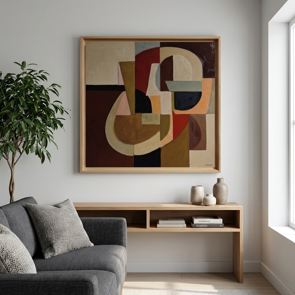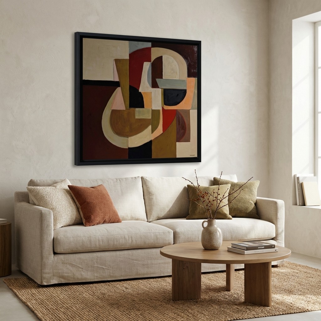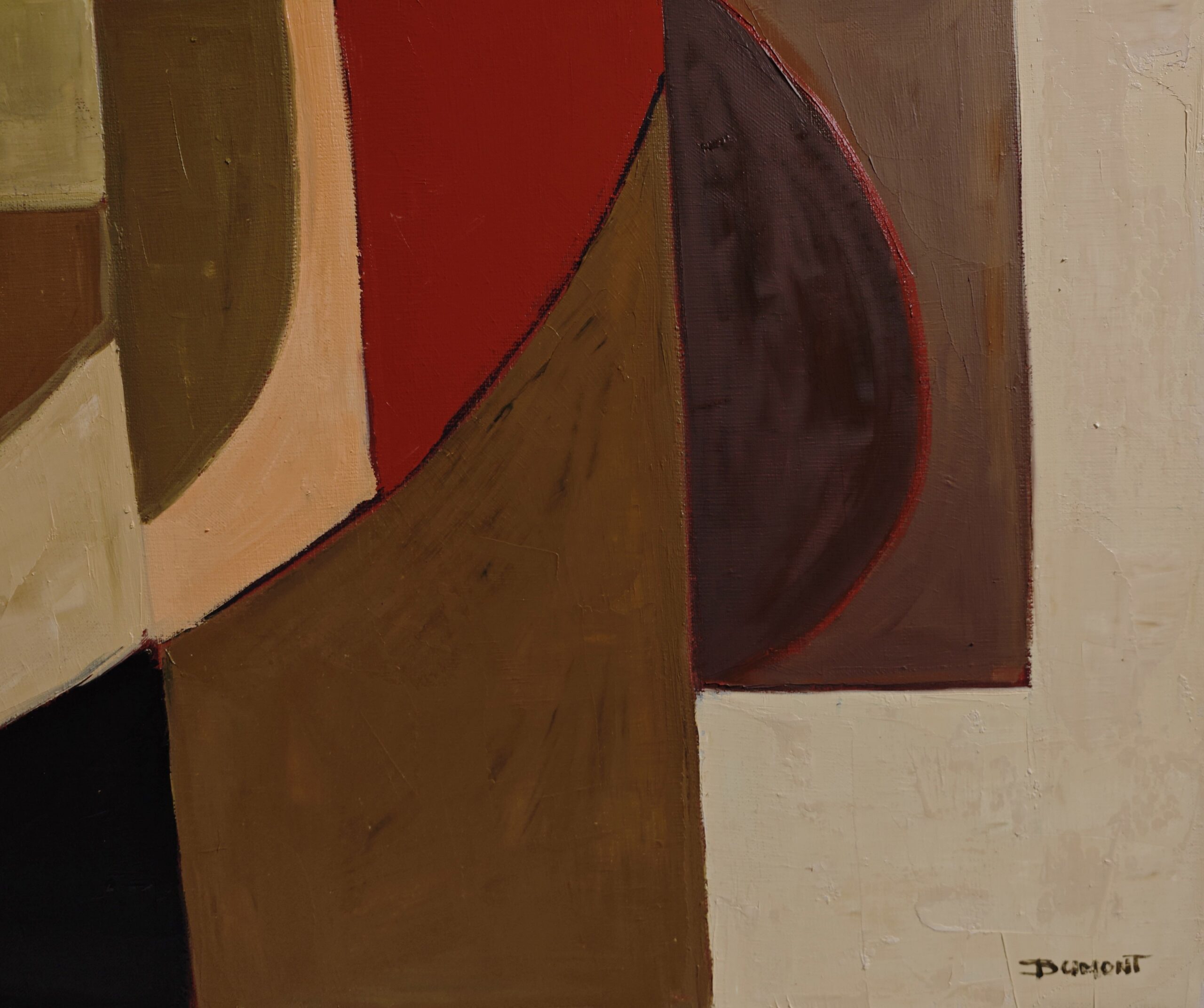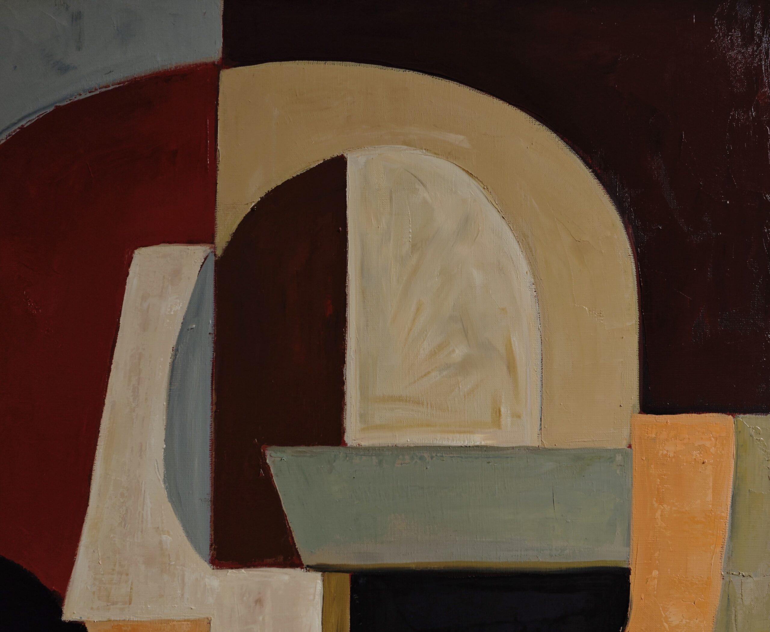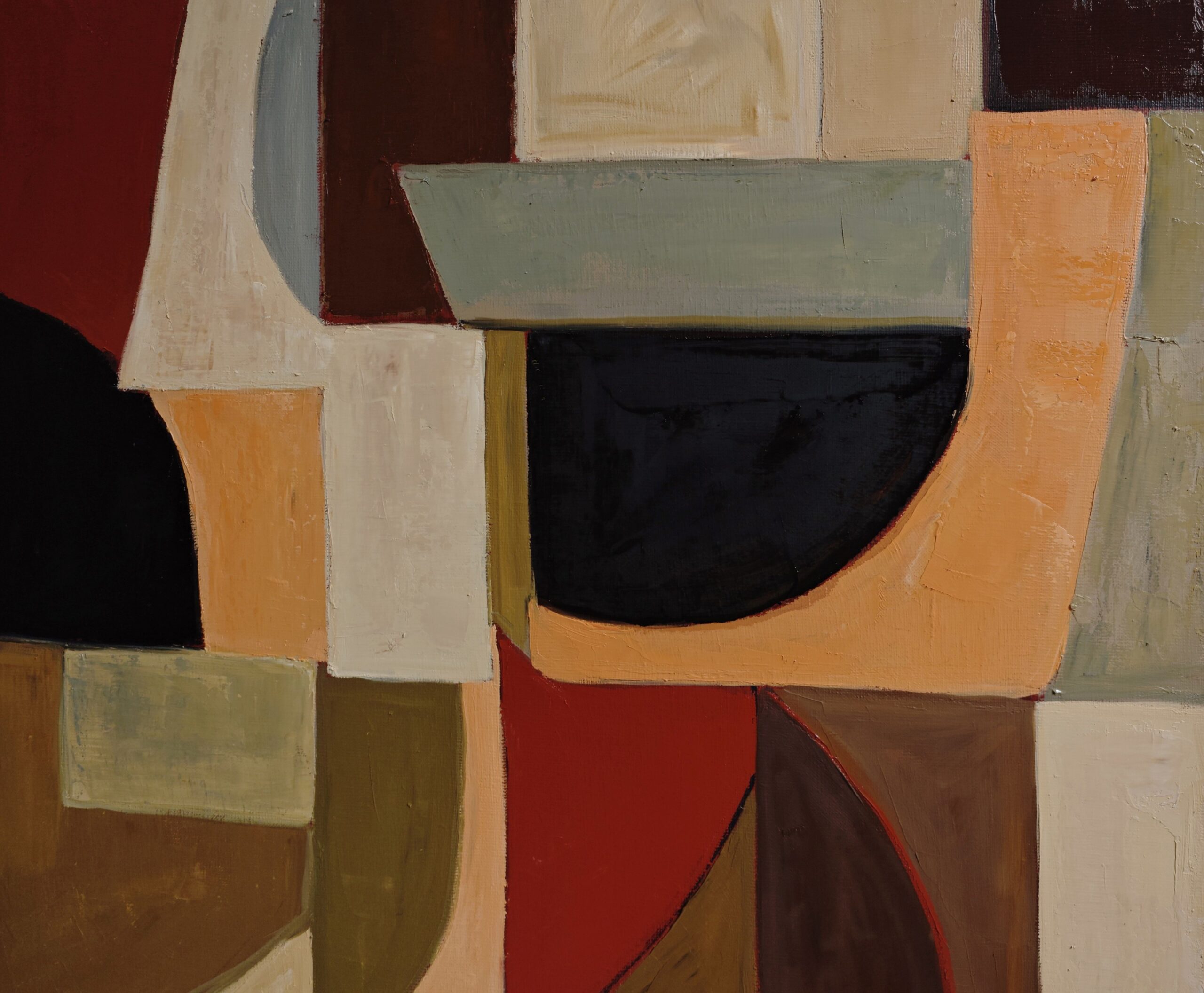 The palette, dominated by deep reds, ochres, brown earths, and luminous beiges, establishes a dense and structured atmosphere. Each form seems to lean upon the others, in a delicate balance where nothing is left to chance. The paint, applied in successive layers of oil, retains a subtle vibrancy that gives the surface a truly physical presence.