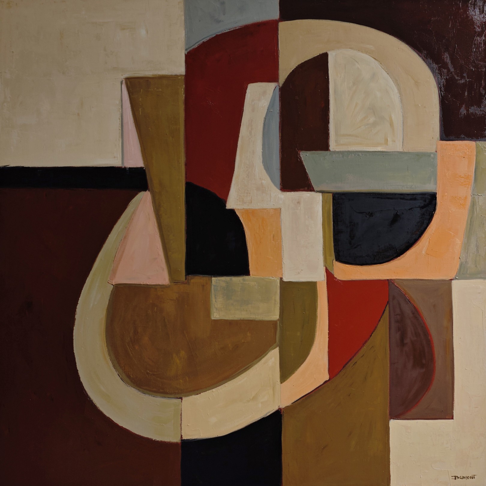 This 100 x 100 cm oil on canvas is an exploration by Sophie Dumont of the interplay between architectural masses and organic lines. Generous curves intertwine with vertical and horizontal structures, creating a controlled tension between stability and movement.
