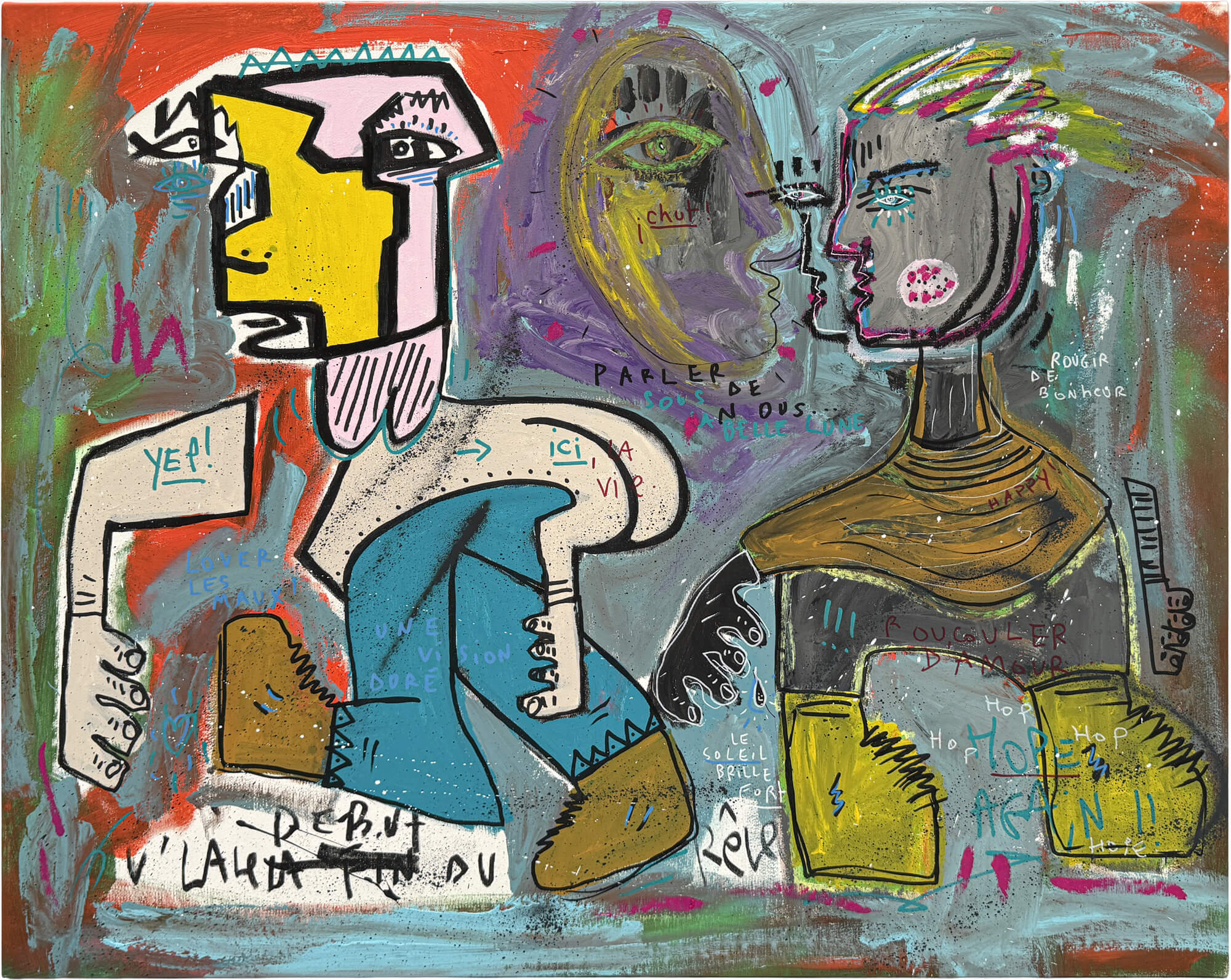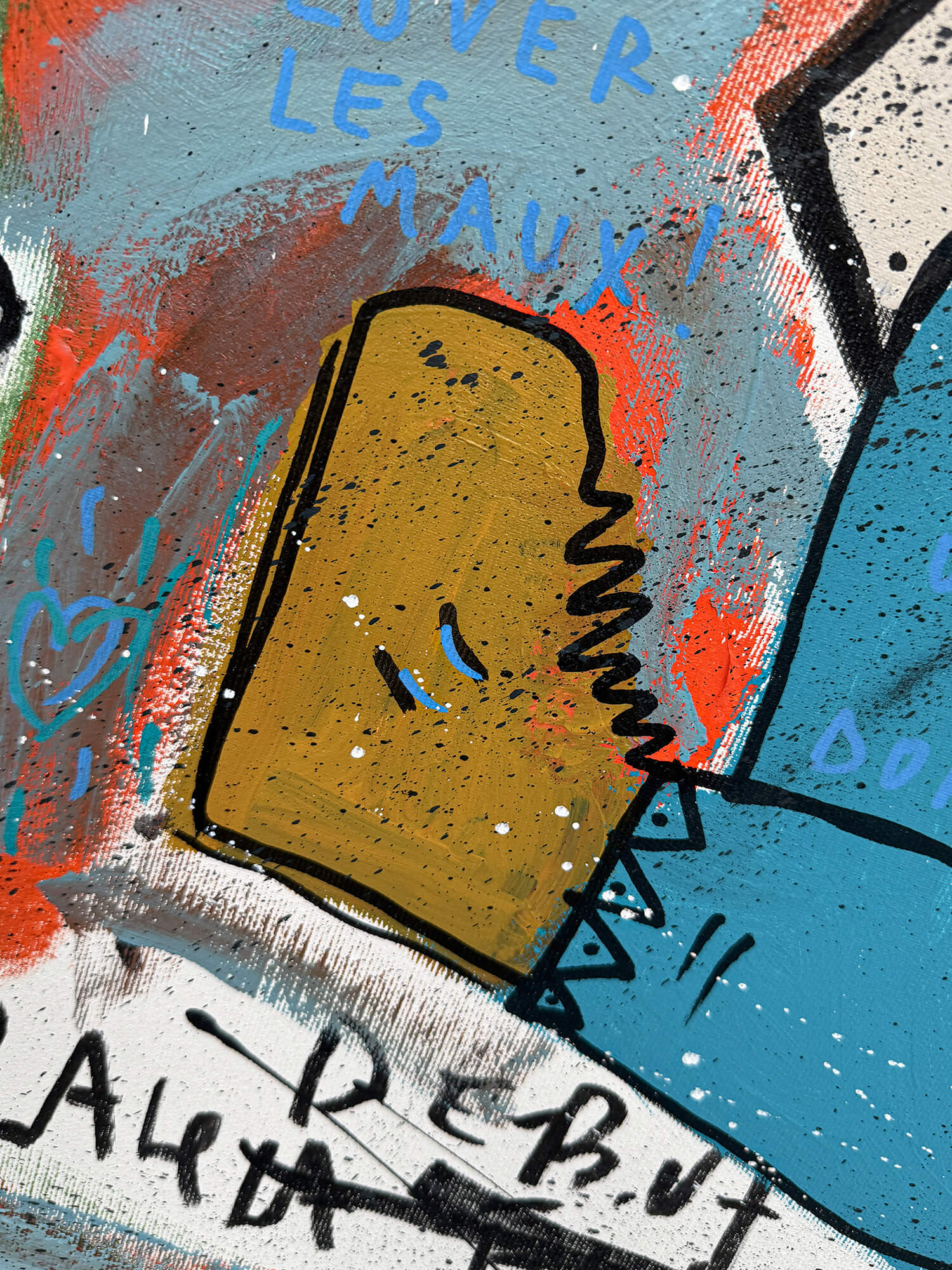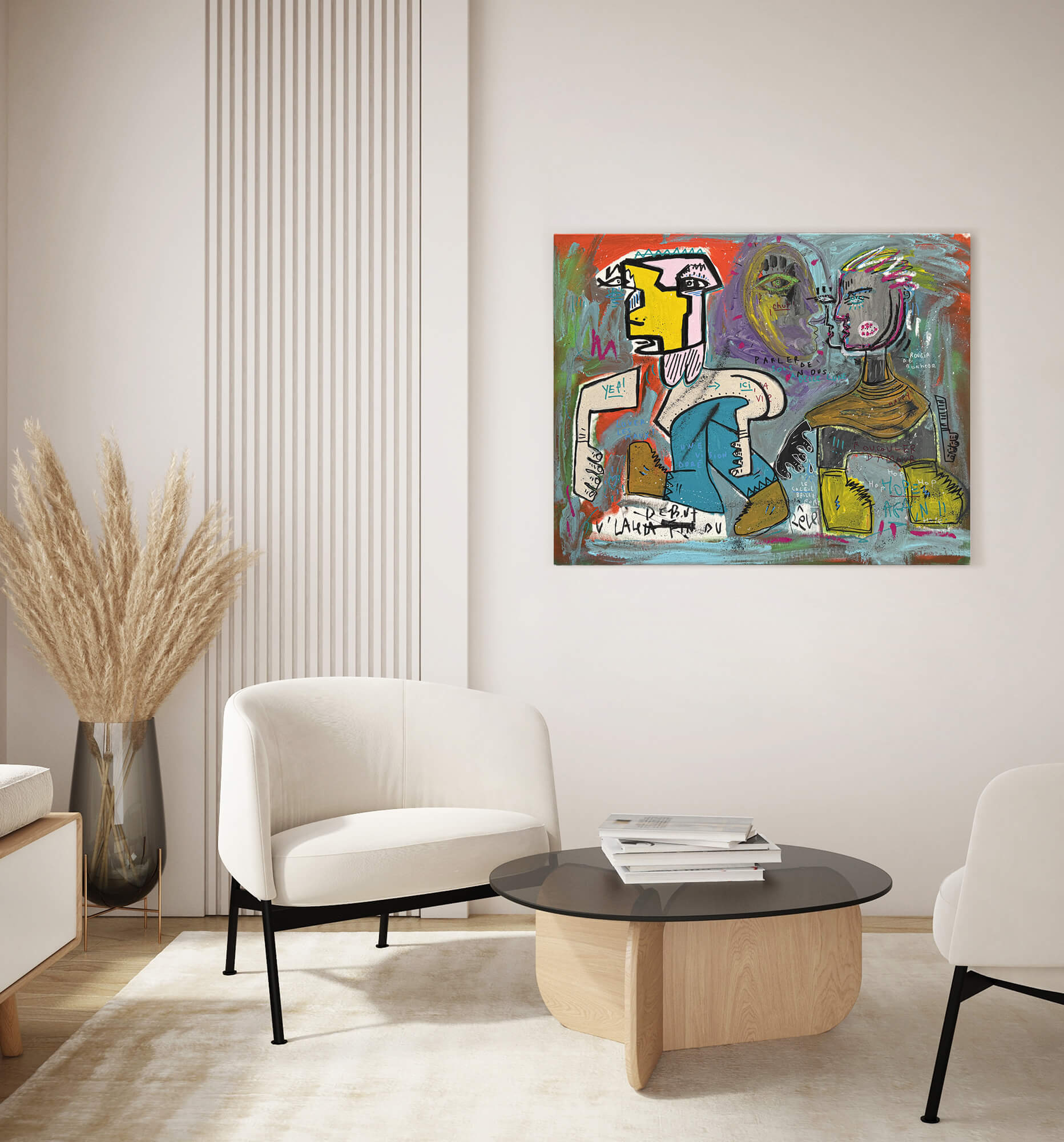 This artwork (Début de nouveaux rêves by Jazzu) is an explosive fusion of color and form, capturing the viewer with its bold abstractions and striking use of vibrant hues. Dominated by two abstract figures, the piece juxtaposes geometric shapes with fluid, expressive lines. The figures, outlined in sharp black lines, exude a dynamic energy, while their patchwork of colors—yellows, blues, and pinks—creates a vibrant contrast against the chaotic background. Text elements, including “YES!” and “LAUDA,” add a layer of intrigue and narrative ambiguity. The background is a rich tapestry of swirling colors and textured patterns, incorporating faint suggestions of eyes and faces that add depth and complexity. This artwork masterfully merges elements of surrealism and graffiti, challenging traditional boundaries and showcasing the artist’s bold creativity. Its powerful visual language speaks to themes of identity and communication, ensuring it captivates and engages on both intellectual and emotional levels.