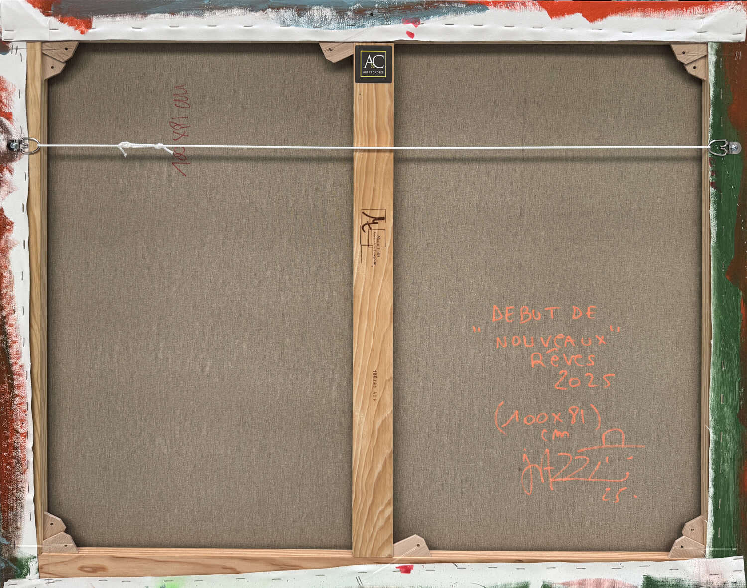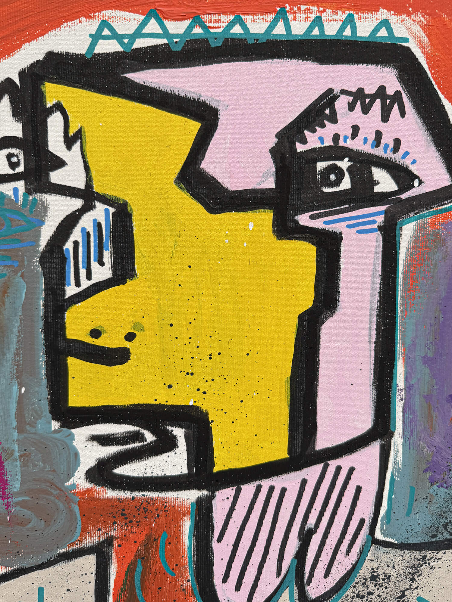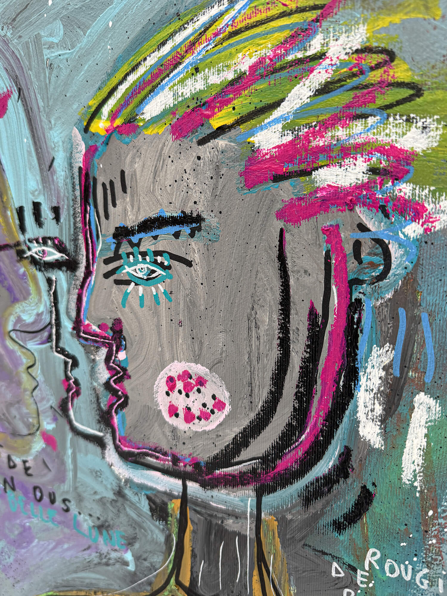 This artwork (Début de nouveaux rêves by Jazzu) is an explosive fusion of color and form, capturing the viewer with its bold abstractions and striking use of vibrant hues. Dominated by two abstract figures, the piece juxtaposes geometric shapes with fluid, expressive lines. The figures, outlined in sharp black lines, exude a dynamic energy, while their patchwork of colors—yellows, blues, and pinks—creates a vibrant contrast against the chaotic background. Text elements, including “YES!” and “LAUDA,” add a layer of intrigue and narrative ambiguity. The background is a rich tapestry of swirling colors and textured patterns, incorporating faint suggestions of eyes and faces that add depth and complexity. This artwork masterfully merges elements of surrealism and graffiti, challenging traditional boundaries and showcasing the artist’s bold creativity. Its powerful visual language speaks to themes of identity and communication, ensuring it captivates and engages on both intellectual and emotional levels.