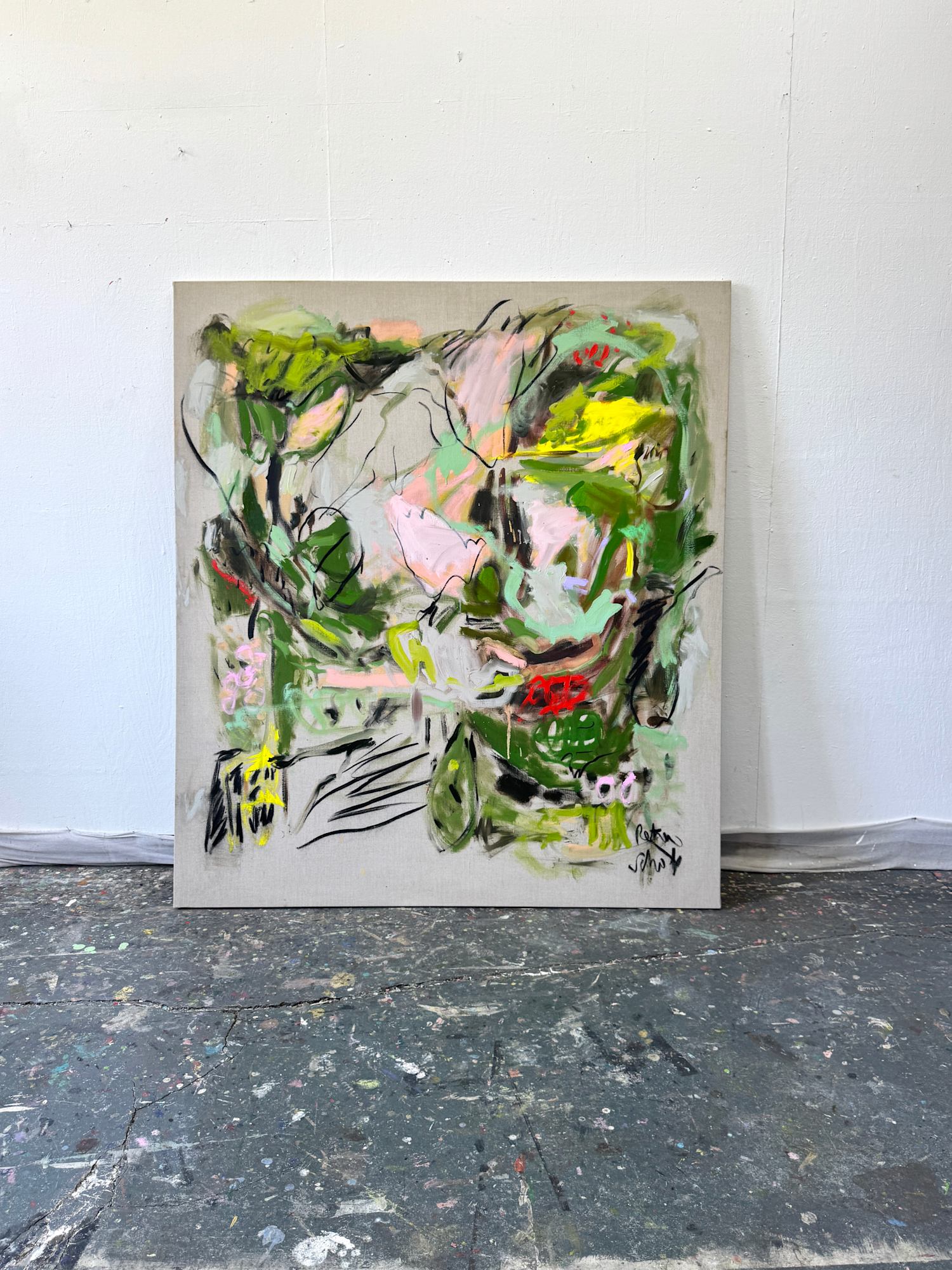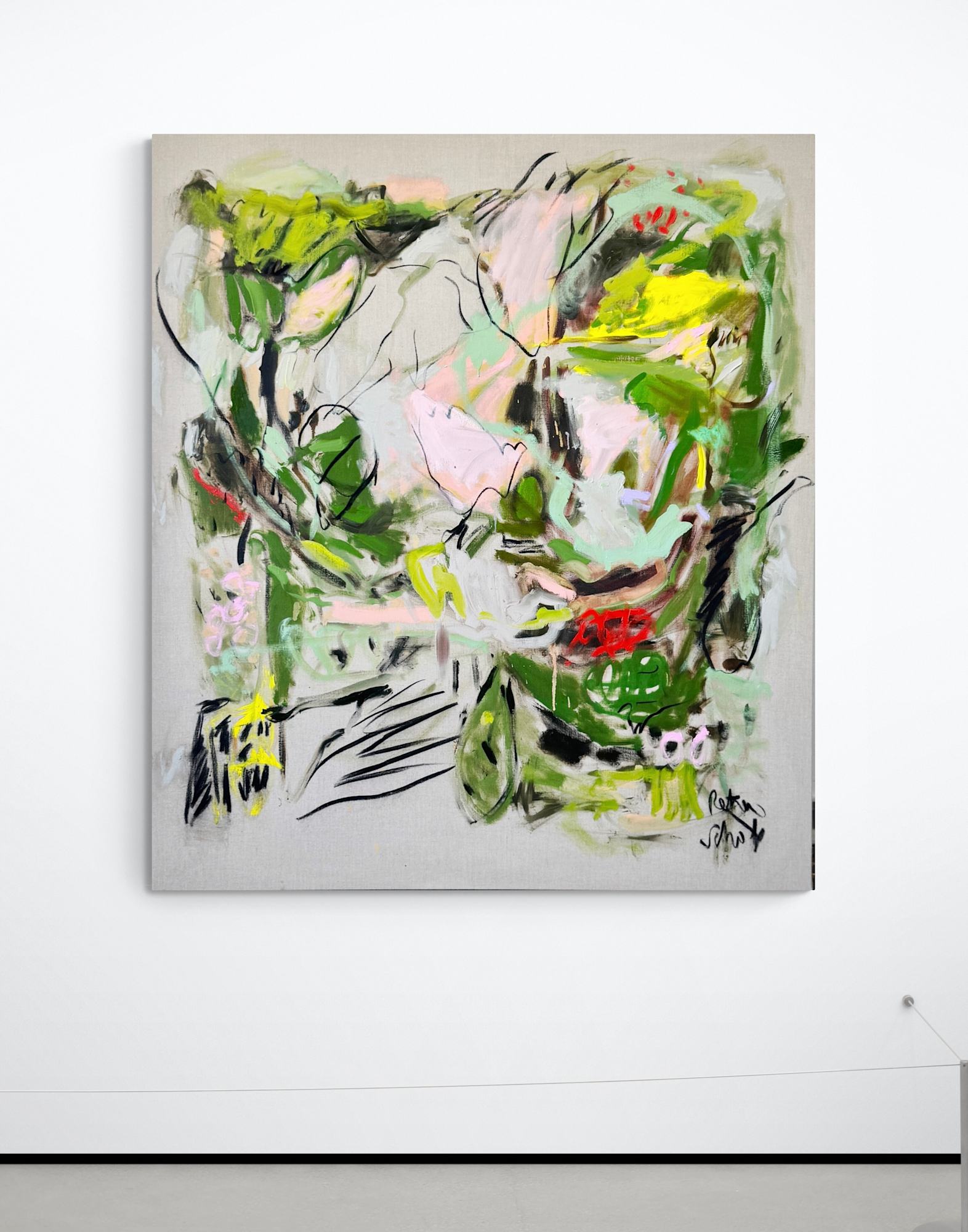 This artwork (Deep Into The Gardens V by Petra Schott) is a striking abstraction, pulsating with verdant energy. Dominated by lush greens and earthy tones, it showcases a vibrant interplay of colors, evoking the essence of a lively, untamed garden. Bold, expressive brushstrokes dance across the canvas, blending shades of lime, moss, and emerald with dashes of pink, red, and yellow, creating a dynamic visual narrative. The composition is filled with swirling forms and organic shapes, hinting at foliage and blossoms, yet remaining delightfully untethered to any specific imagery. The layering of the colors and textures invites viewers to explore its depth, encouraging a sense of discovery with each glance. This piece uniquely captivates with its chaotic harmony, making it an evocative celebration of nature’s abstract beauty.