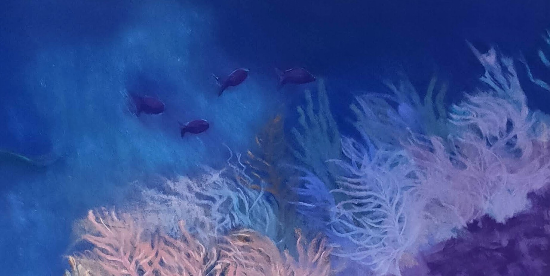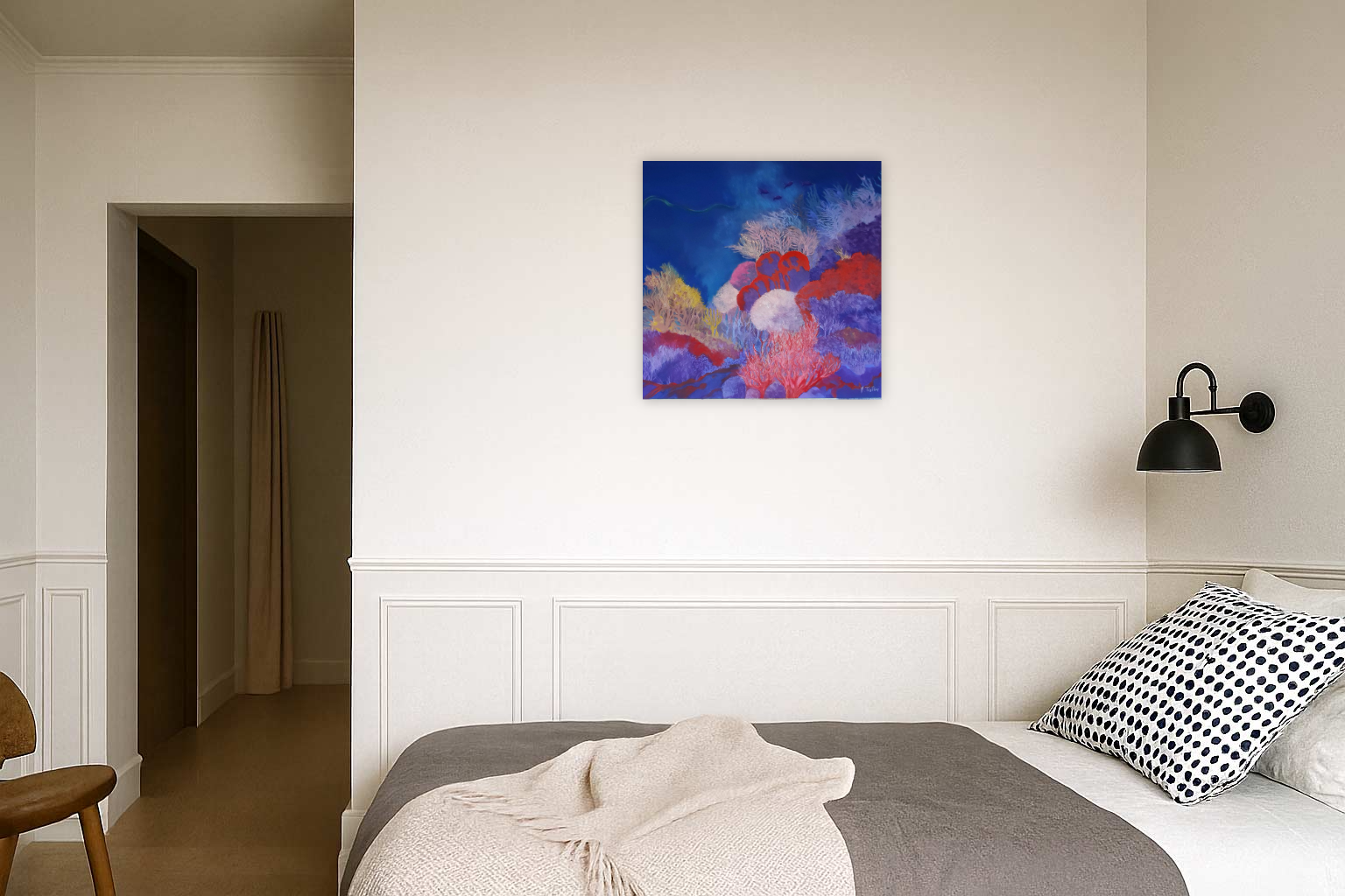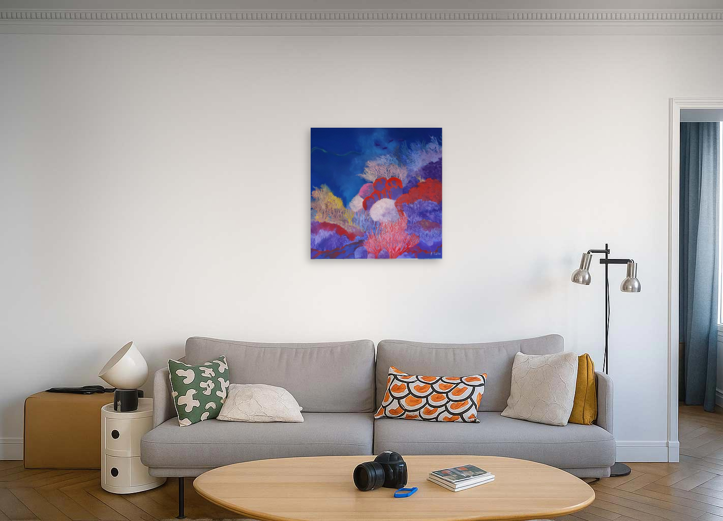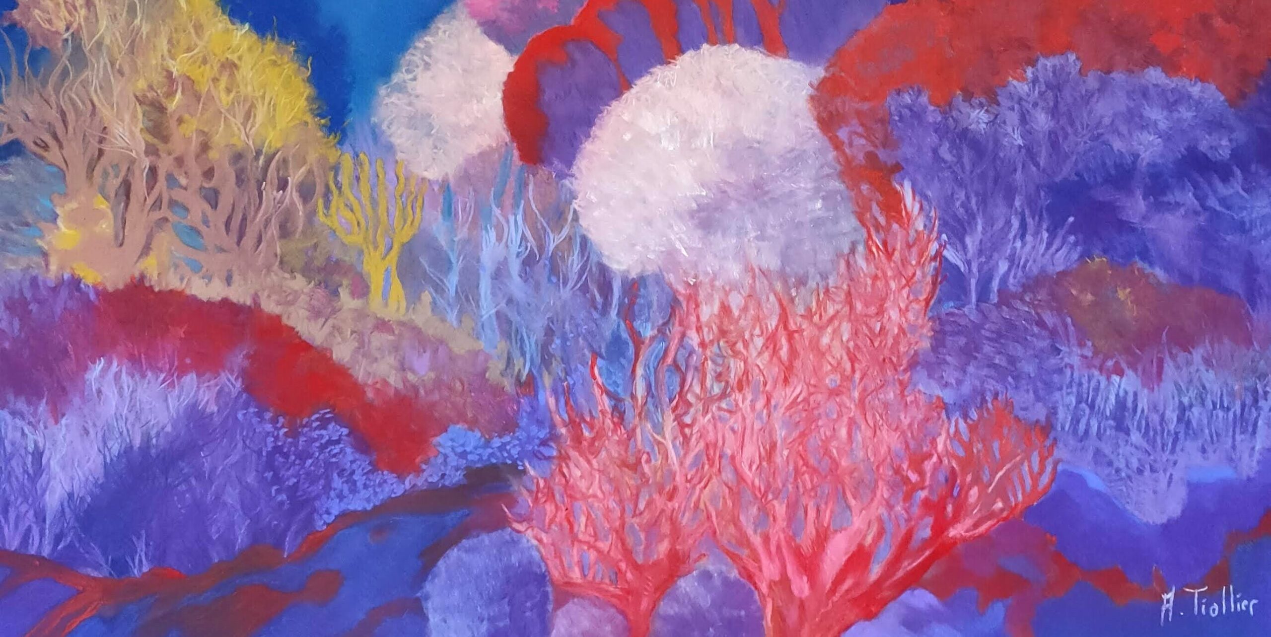 This artwork depicts a vibrant and enchanting underwater landscape. The dazzling color palette, ranging from deep blues to vivid reds and luminous yellows, immediately captures the viewer’s attention. The delicately formed and varied corals spread out like a living garden, evoking a harmonious dance of nature. Subtle shades of purple and pink add depth and texture, creating an almost three-dimensional effect. Above, shimmering shadows suggest the mysterious presence of a marine creature. The interplay of light and color creates an immersive atmosphere, transporting the viewer into an intense sensory experience. The artwork, with its skillful juxtaposition of warm and cool tones, underscores the richness and diversity of ocean life while inspiring a sense of wonder and contemplation.