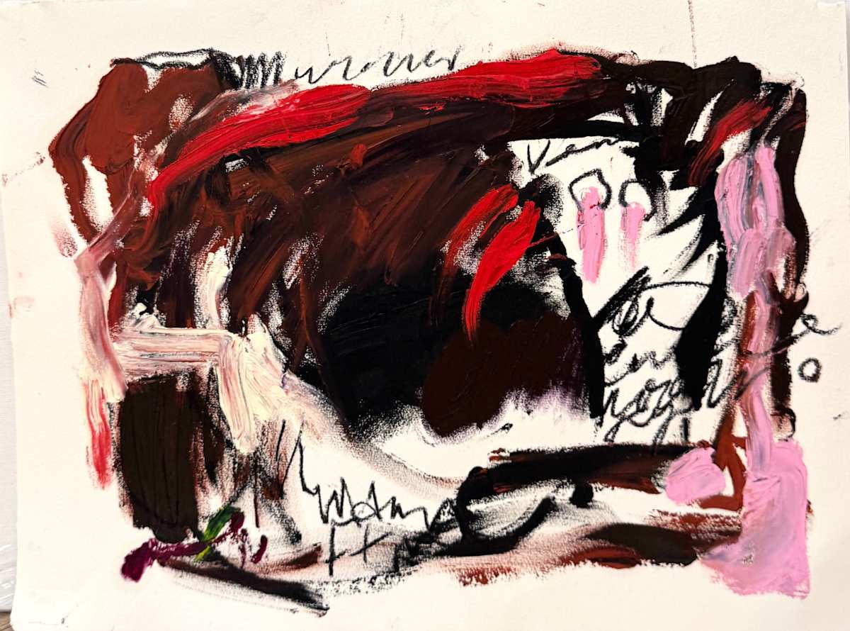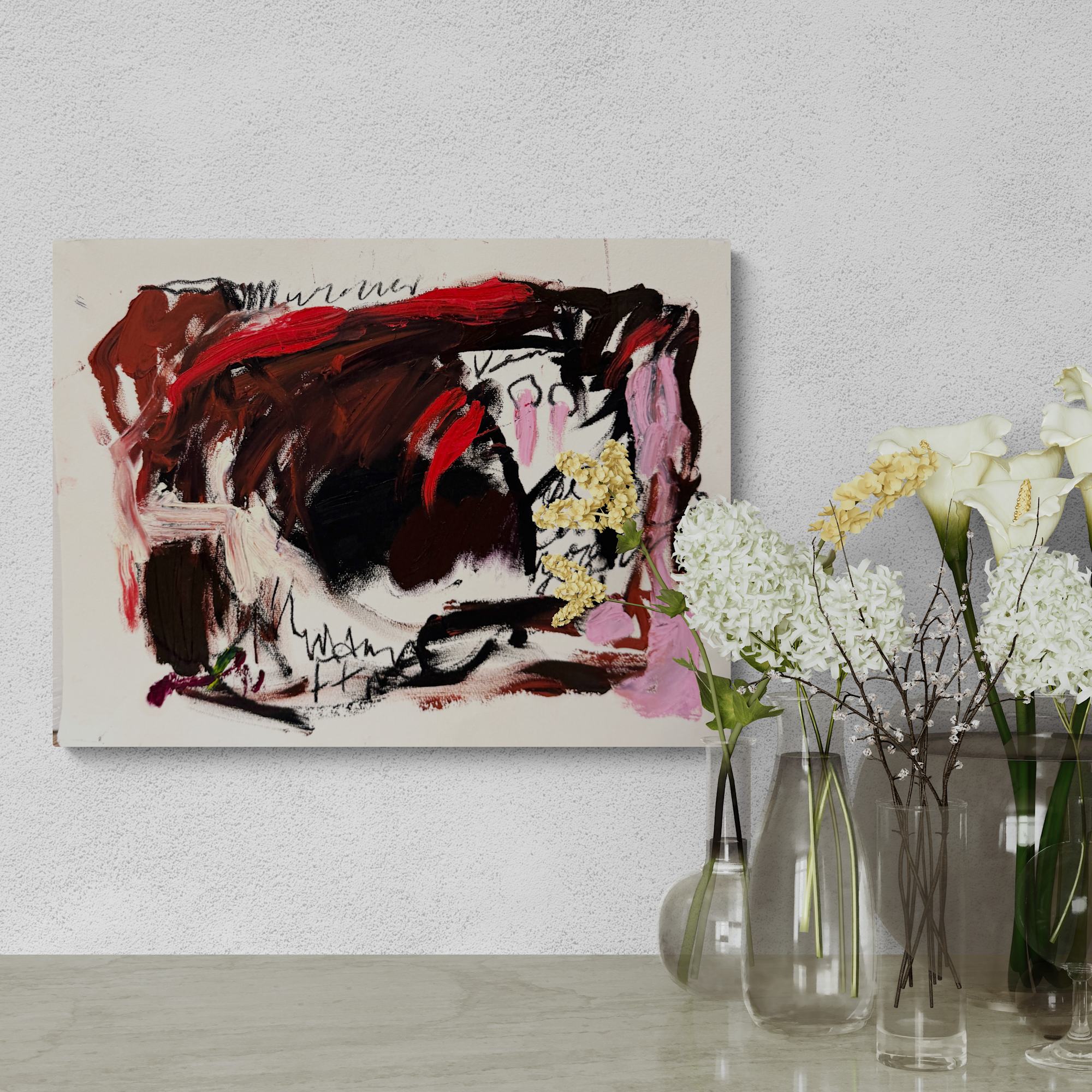 This dynamic artwork (Getting Ready For The Dance by Petra Schott) captivates with its bold use of color and energetic brushstrokes, creating a visceral experience for the viewer. Dominated by deep reds, blacks, and splashes of white, the piece exudes raw emotion and intensity. There is a sense of drama conveyed through the chaotic interplay of colors, with shades of pink adding subtle contrasts. The abstract forms are layered with expressive lines, some resembling hurried script, suggesting an underlying narrative or personal expression. The composition is balanced yet deliberately unrefined, emphasizing movement and spontaneity. Its intriguing texture and layered complexity invite viewers to explore deeper meanings within its bold abstractions. This artwork stands out for its vibrant vitality and the powerful emotions it evokes, making it a striking testament to the freedom of abstract expressionism.
