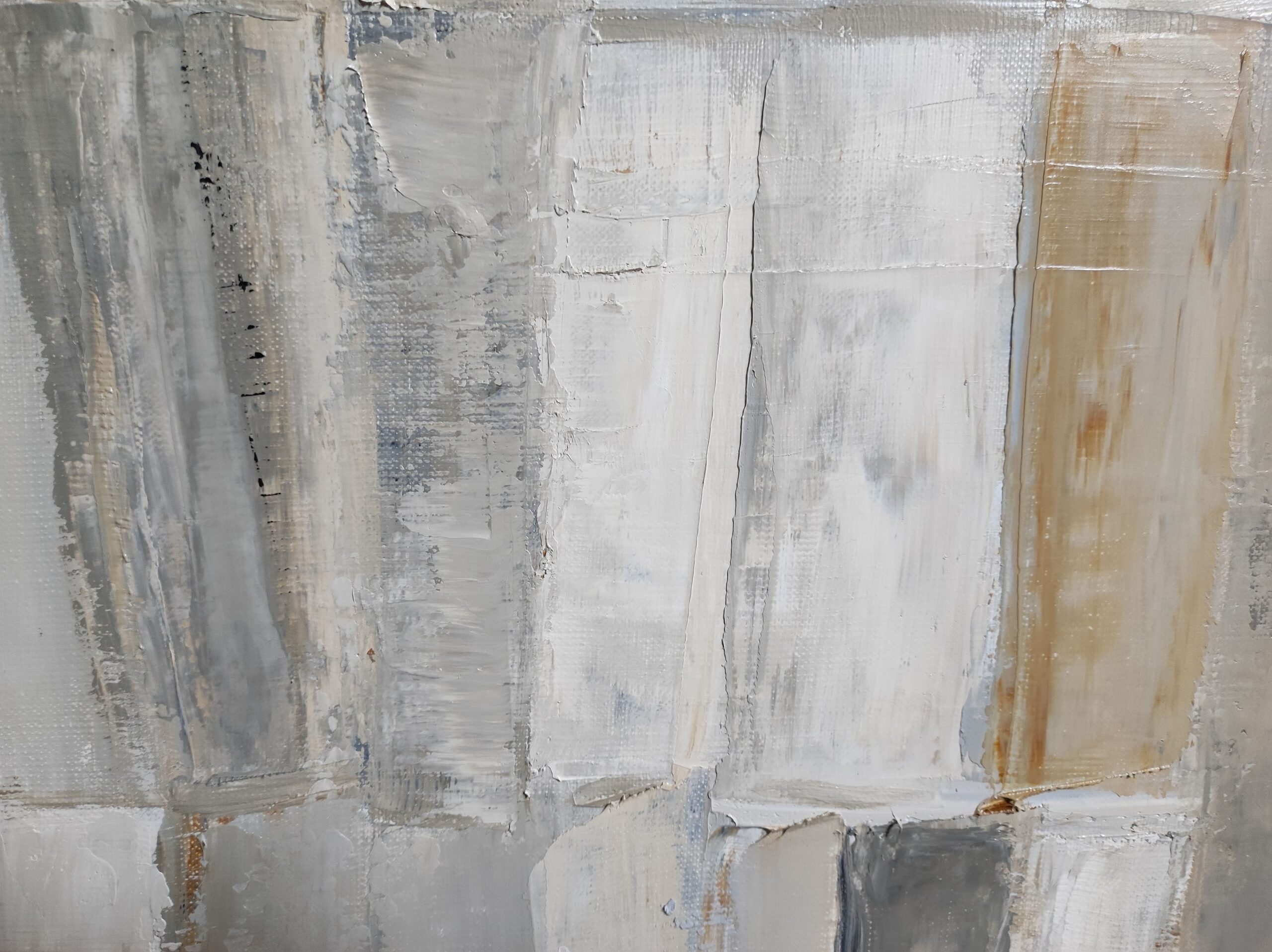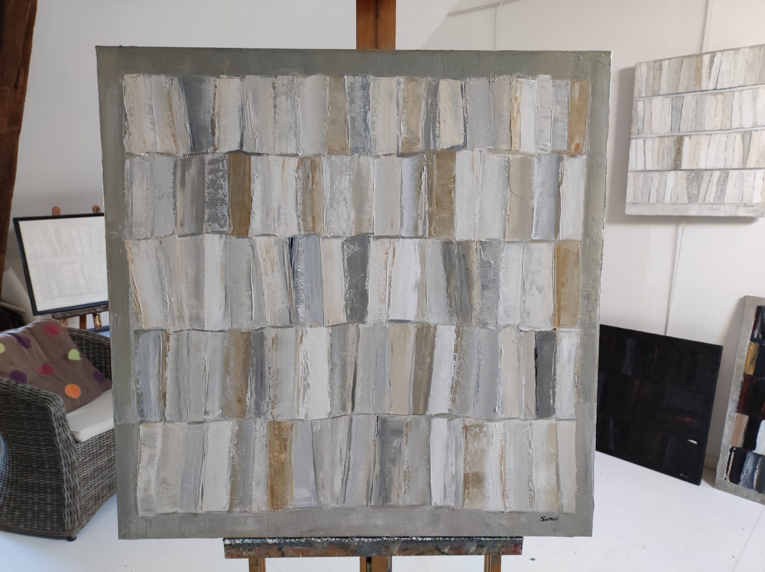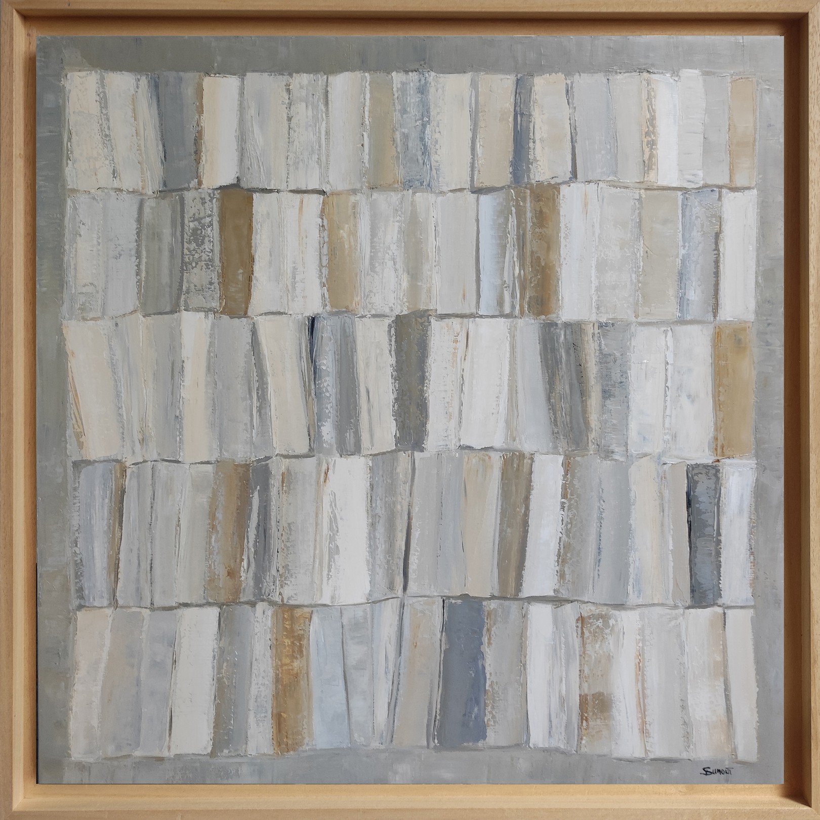 Table of a library with white books. Close to geometric abstraction, books remain very present. As always the canvas is worked with a multitude of layers. Libraries series.