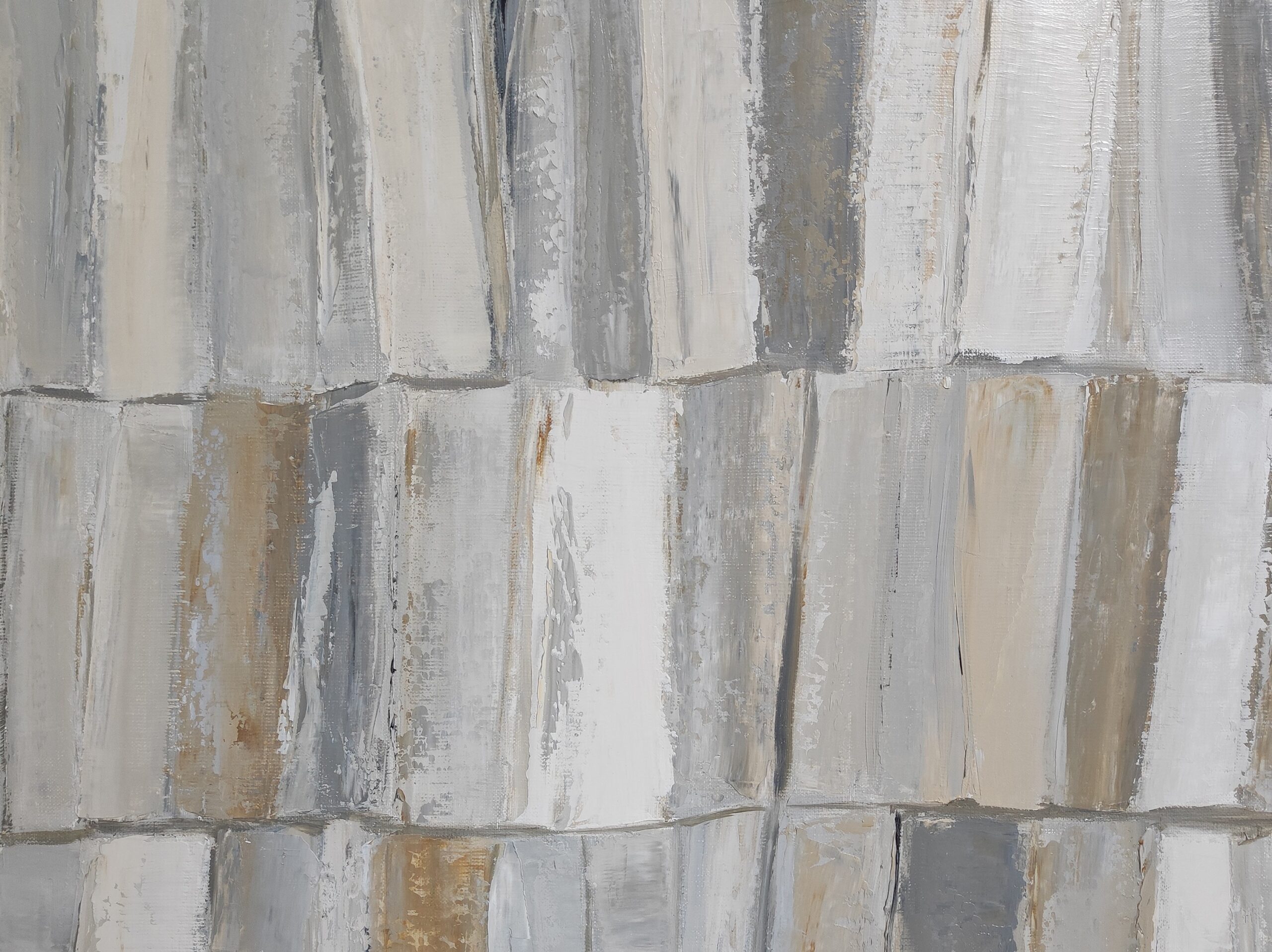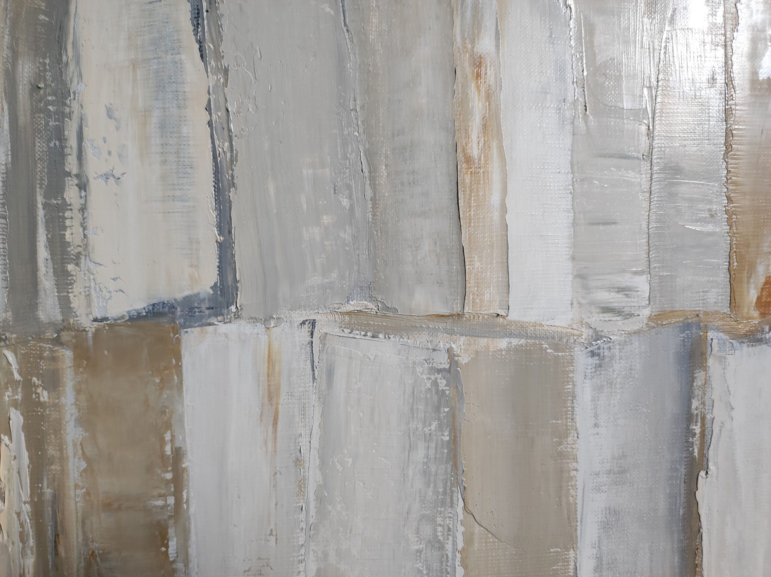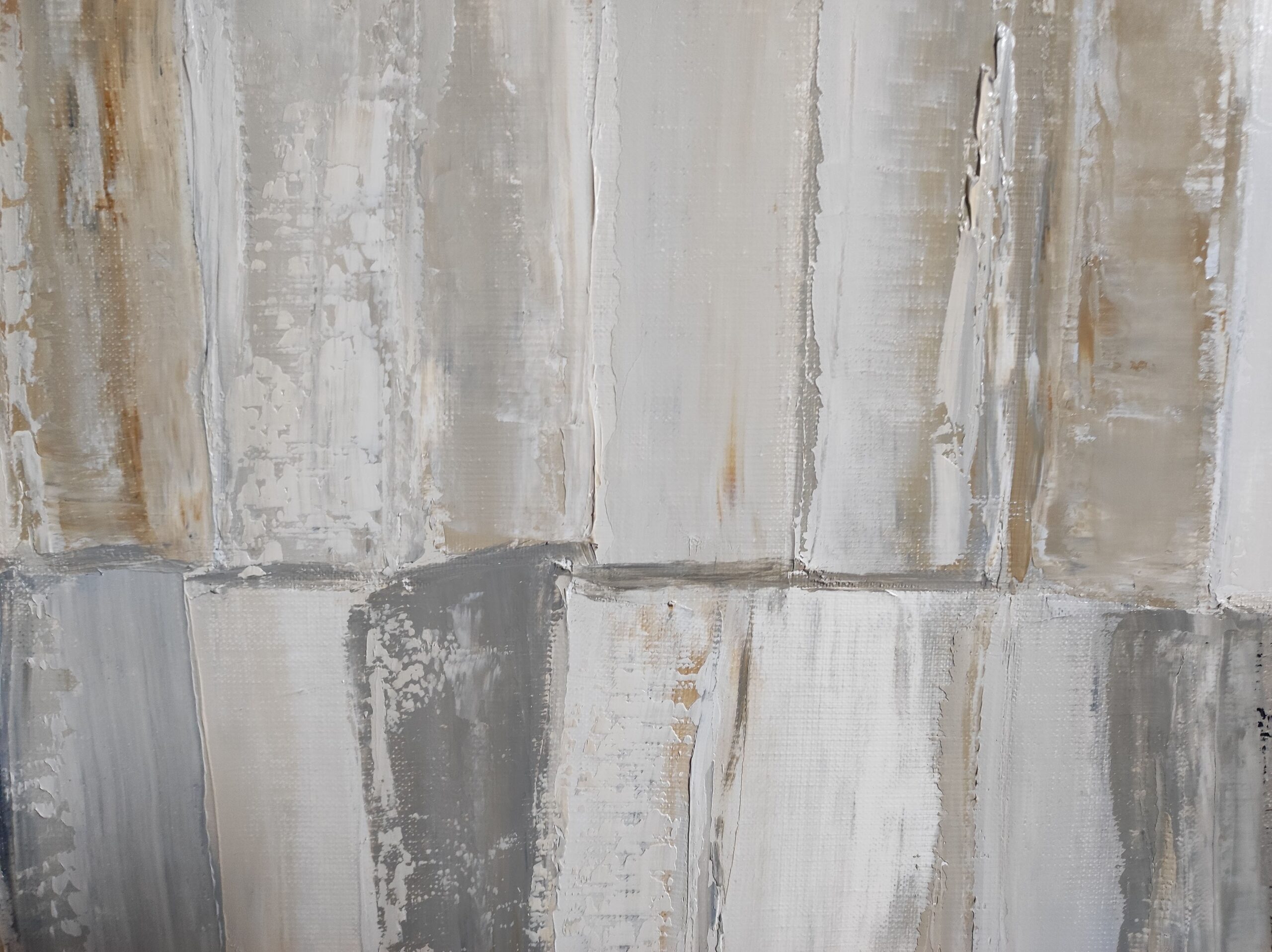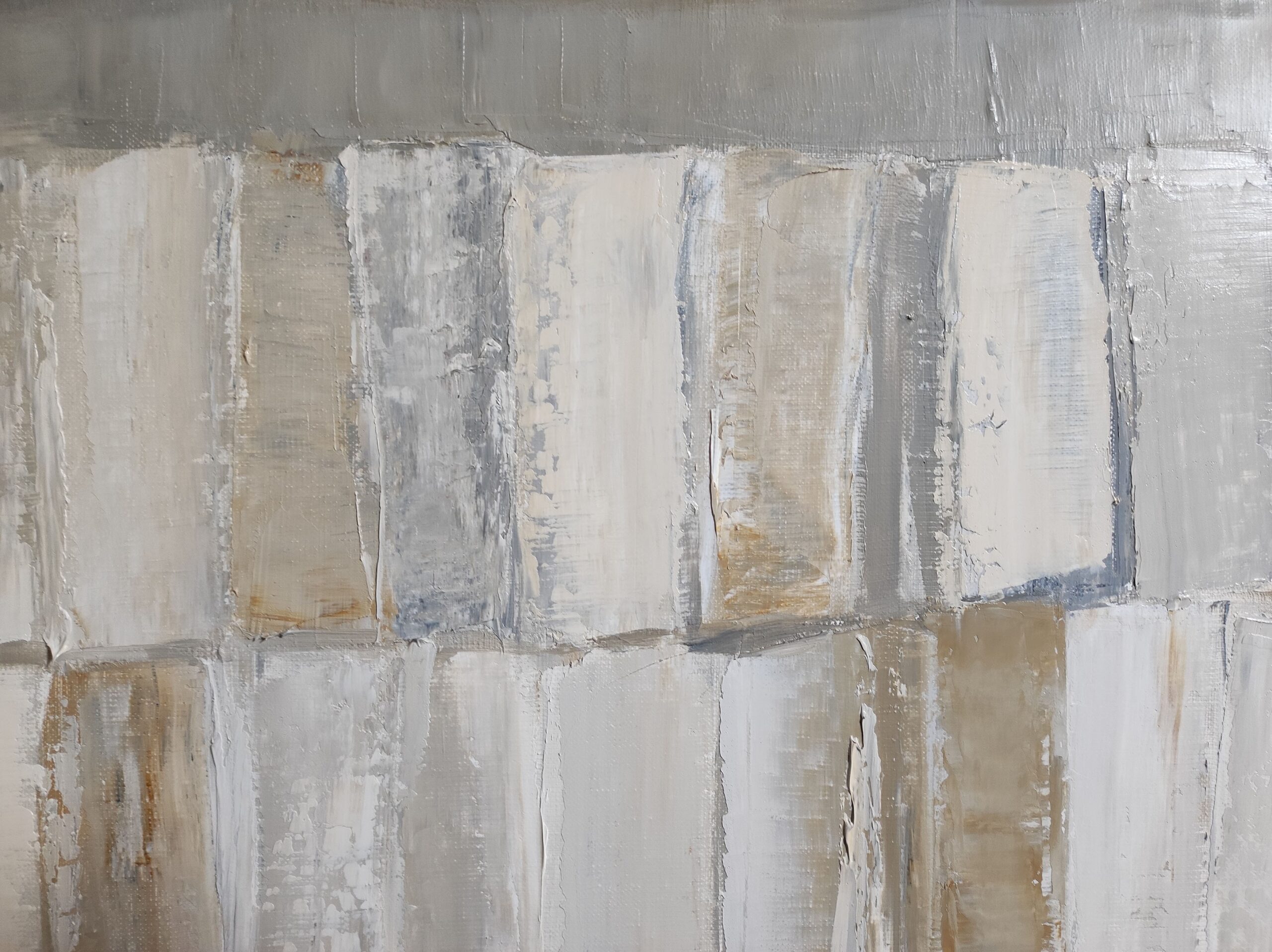 Table of a library with white books. Close to geometric abstraction, books remain very present. As always the canvas is worked with a multitude of layers. Libraries series.