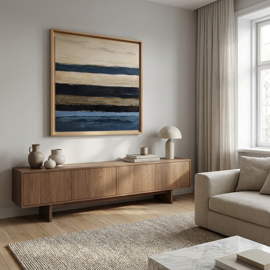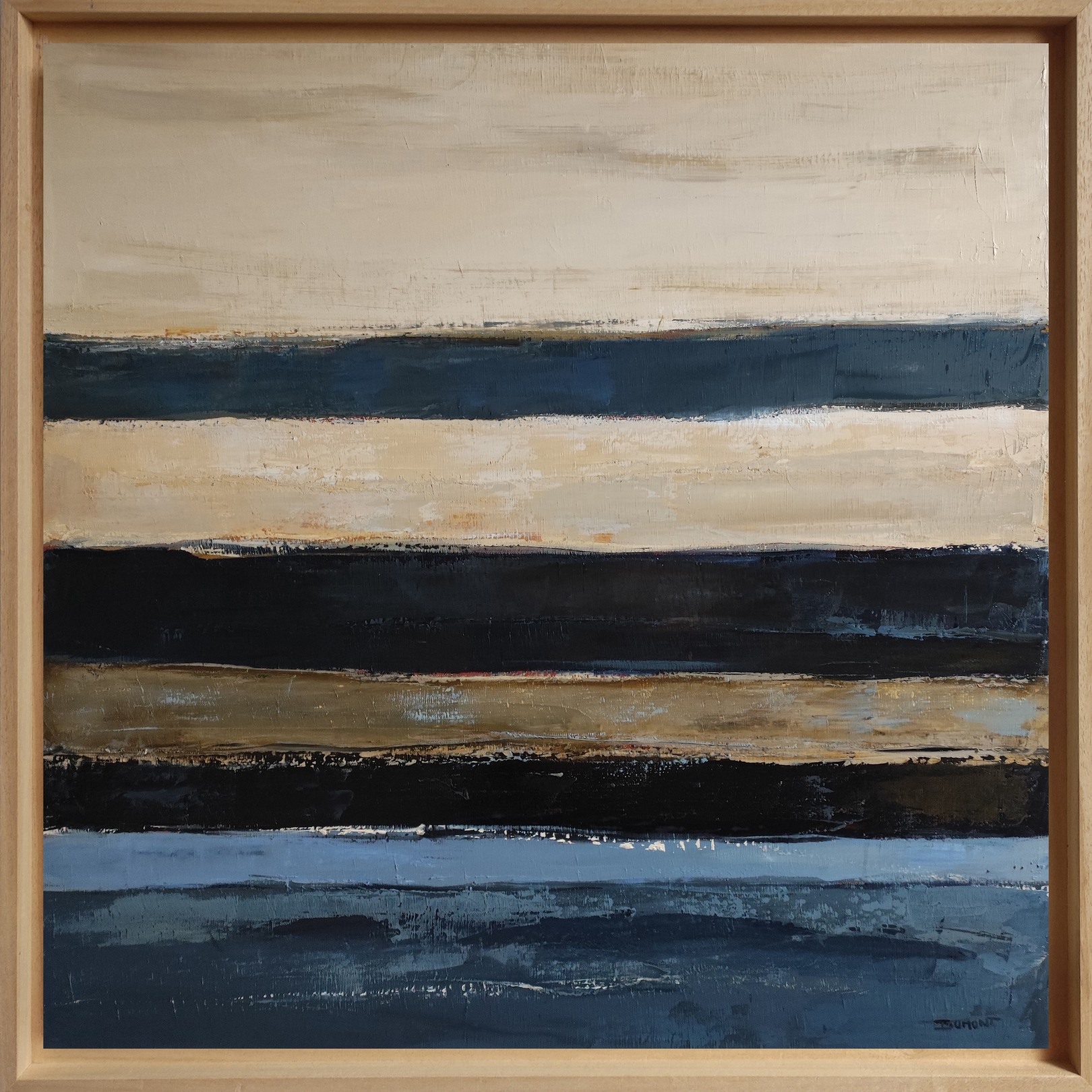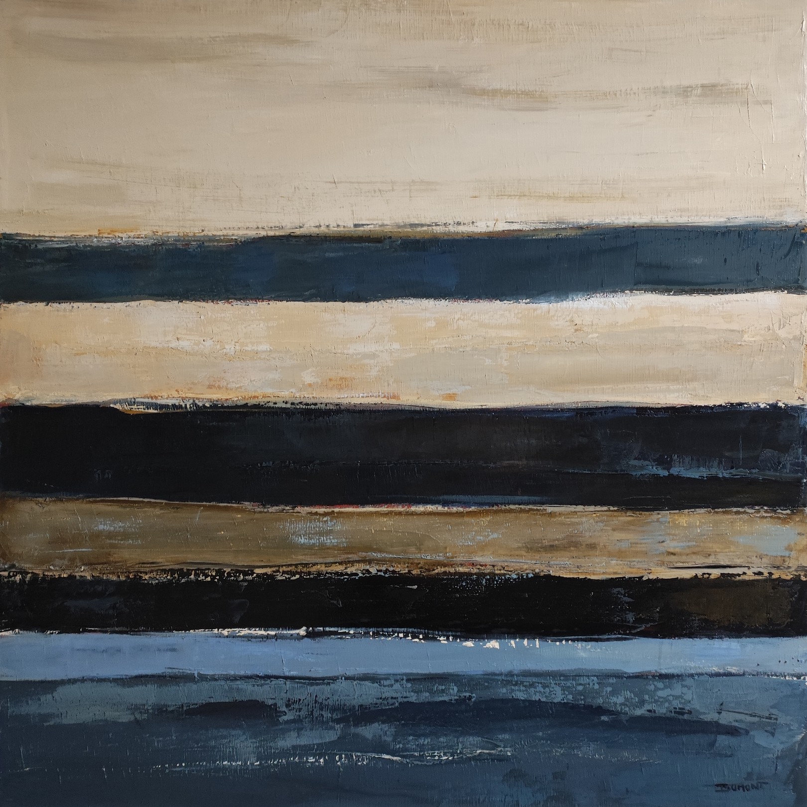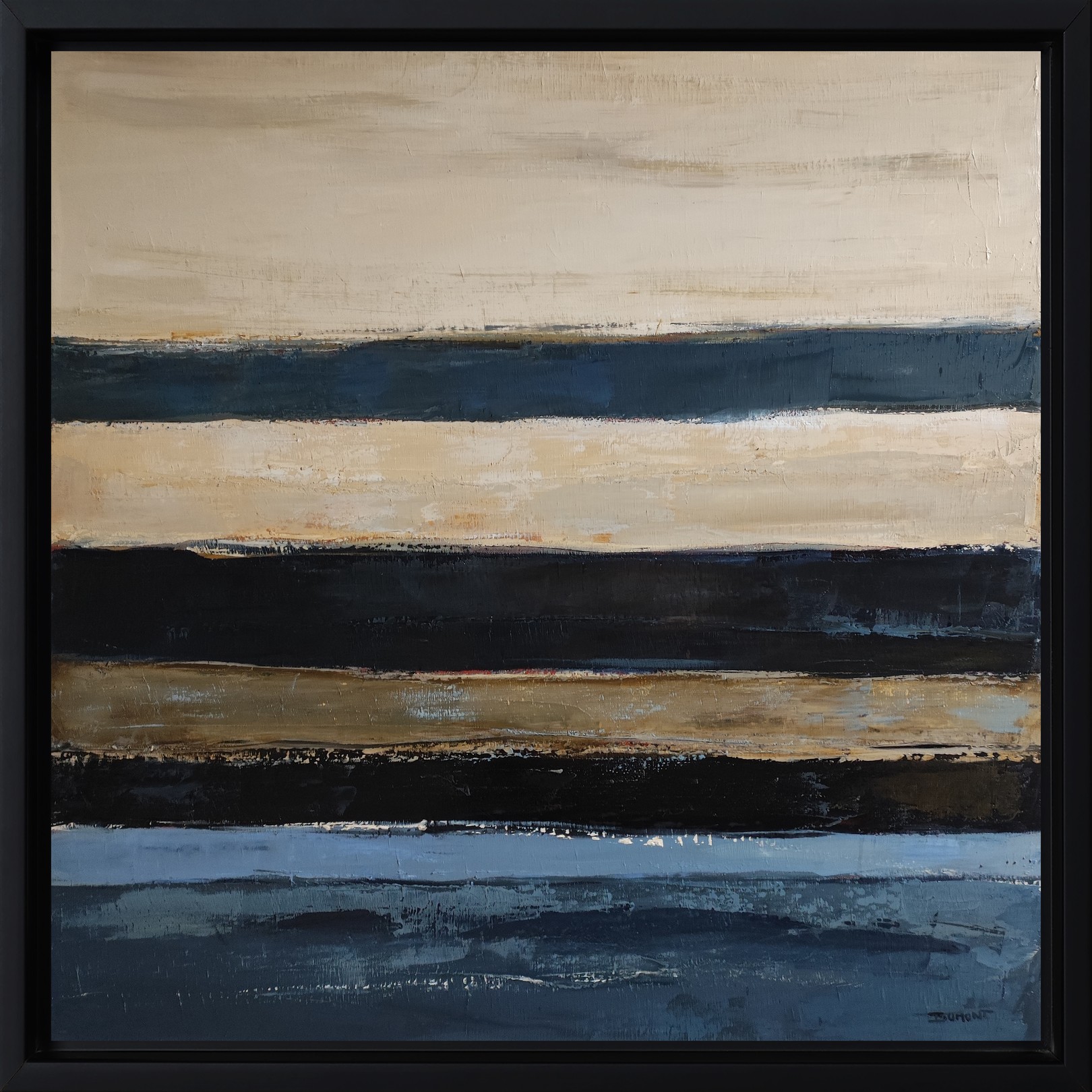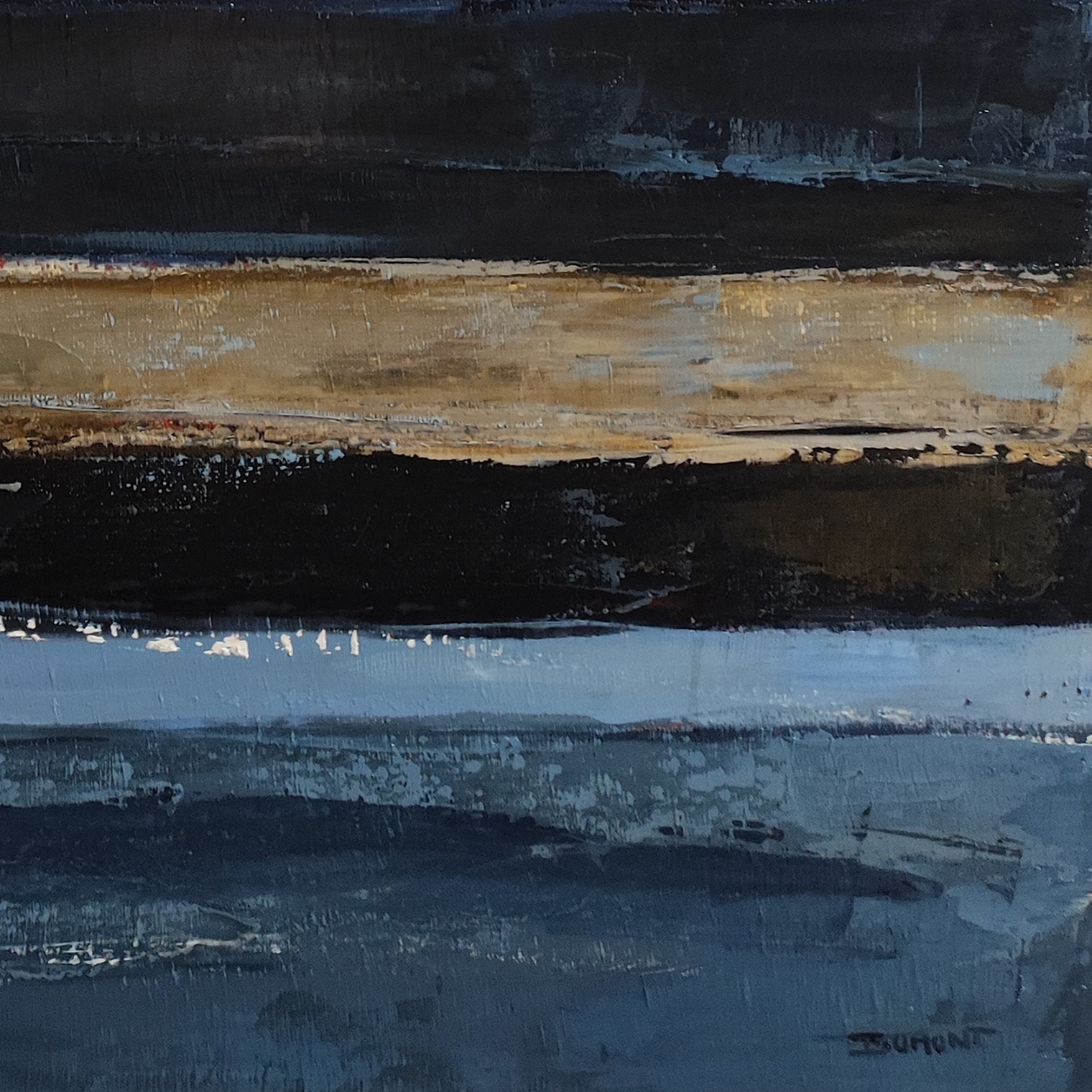 Latent Horizons is part of Sophie Dumont’s pictorial research around the inner landscape and the memory of the gaze. The composition is built up through successive horizontal layers, like so many superimposed lines of time, where the colors — deep blues, velvety blacks, mineral beiges and muted ochres — converse in a silent tension.