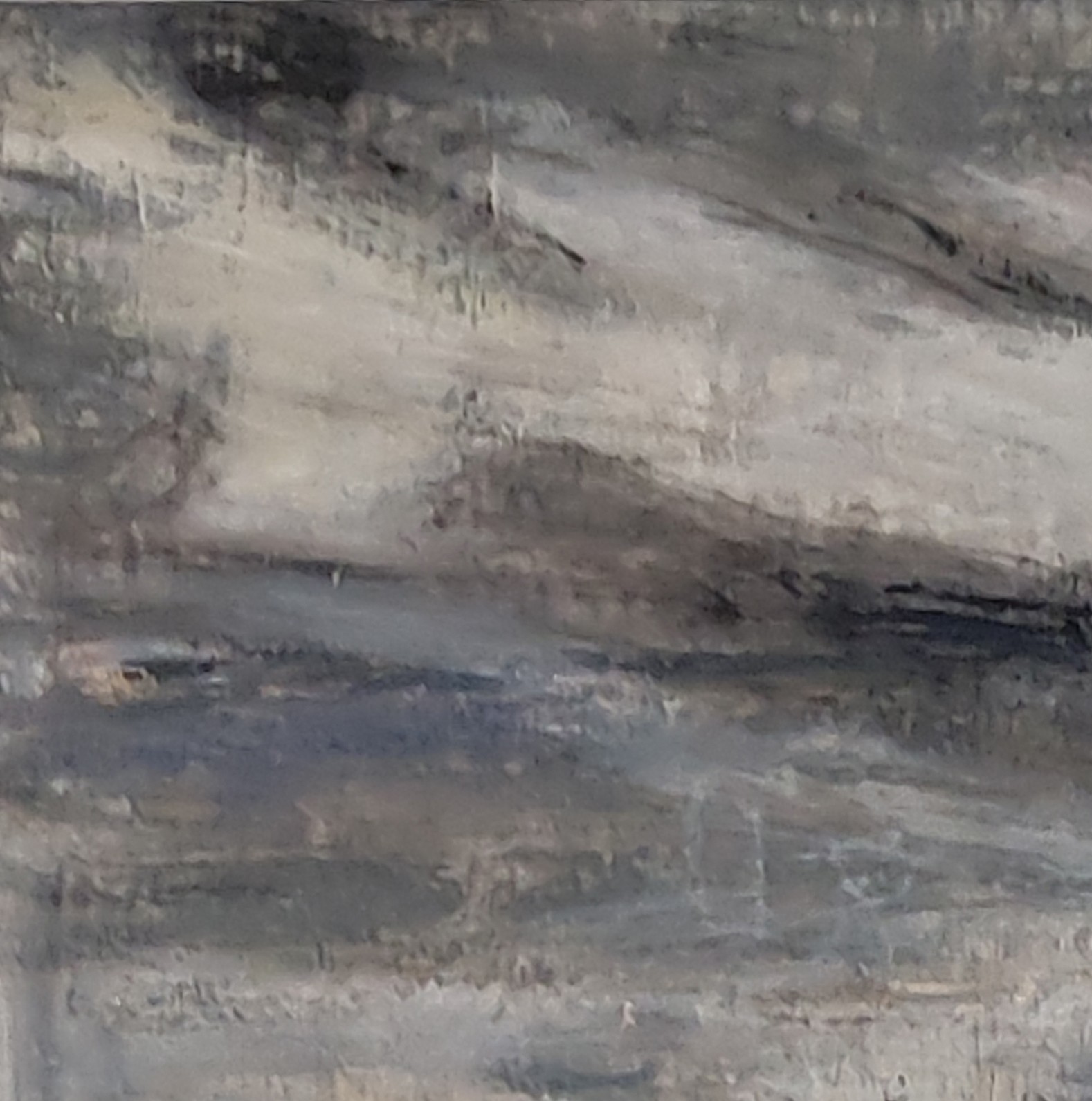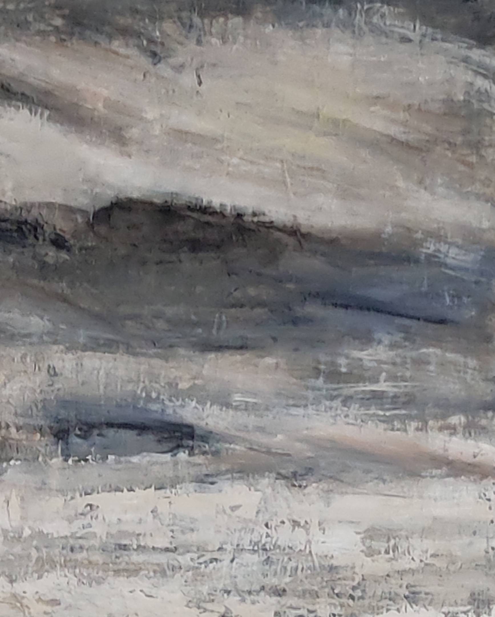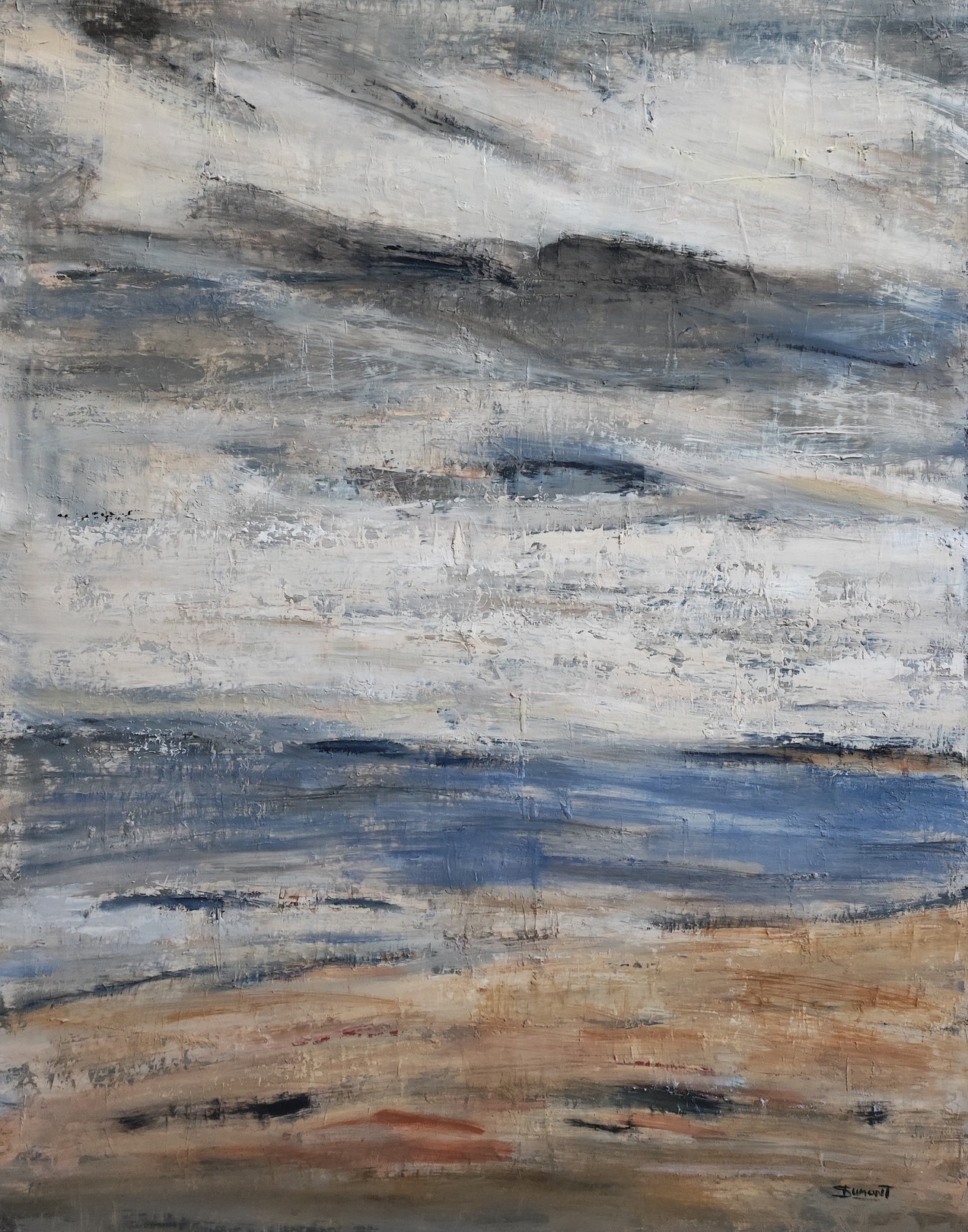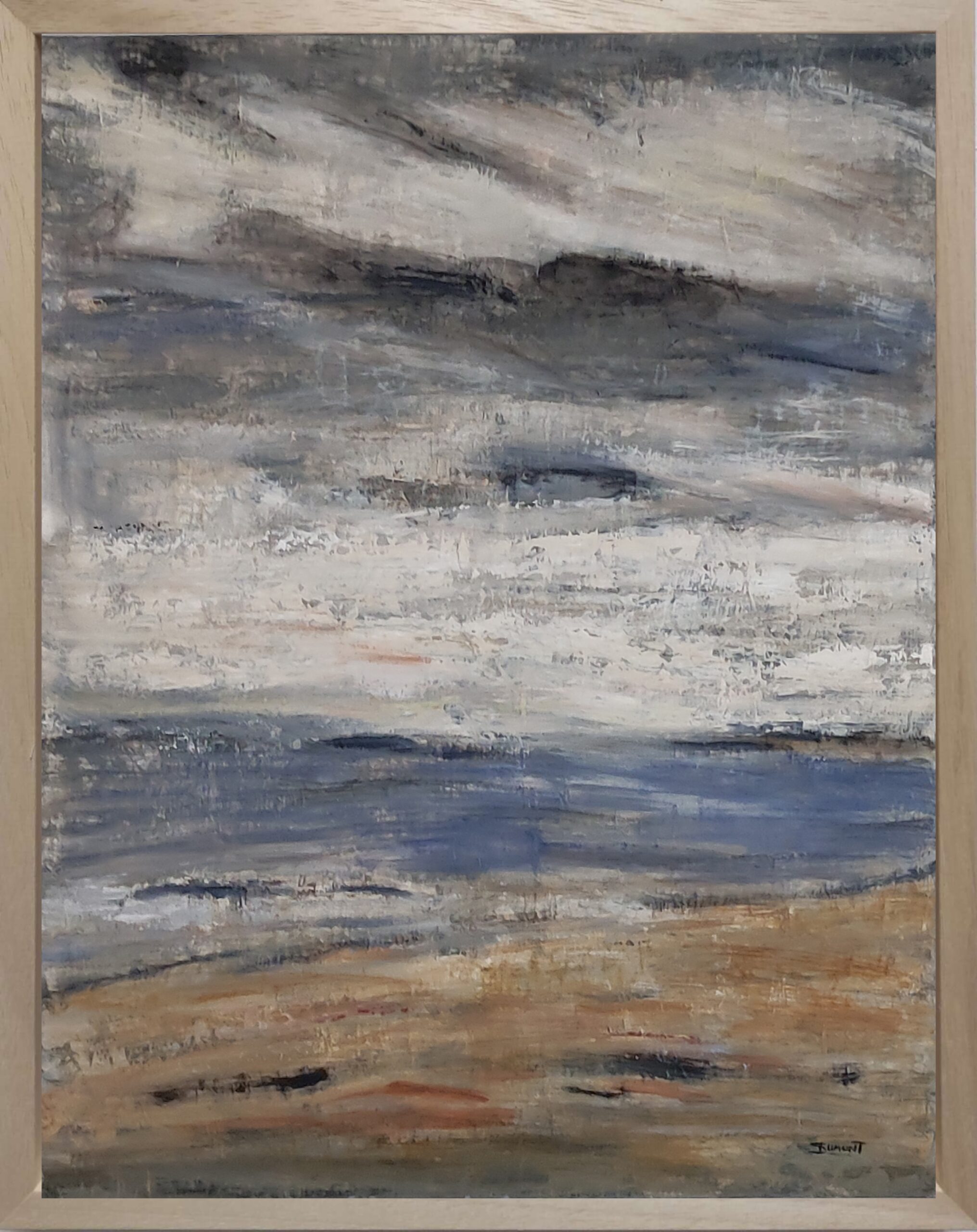 Seaside landscape. Painting of a beach on the Normandy coast under a shady sky. The variations of blue, gray and white concentrate all the energy contained in nature, in a play of perspectives and lights where the line fades in favor of the general atmosphere of the canvas. The artist tries to transcribe on the canvas the ephemeral of a changing sky.
