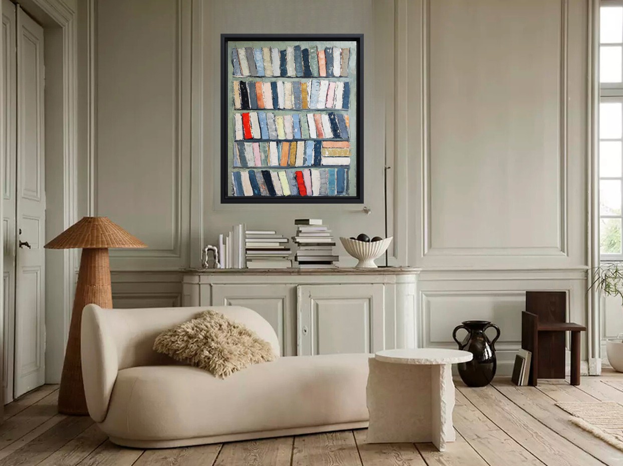 Table of a library with pastel books. From the Renaissance to the 20th century, the book invites us to dive into the imagination. The artist takes advantage of this by painting books Close to geometric abstraction where the viewer is invited to enter this universe. As always the canvas is worked with a multitude of layers with vibrating hues. The artist has been working on the theme of books and libraries since 2016, bringing a different spirit to each new canvas. The work is framed with an American box in natural or black wood of your choice. Akoun certified rating.