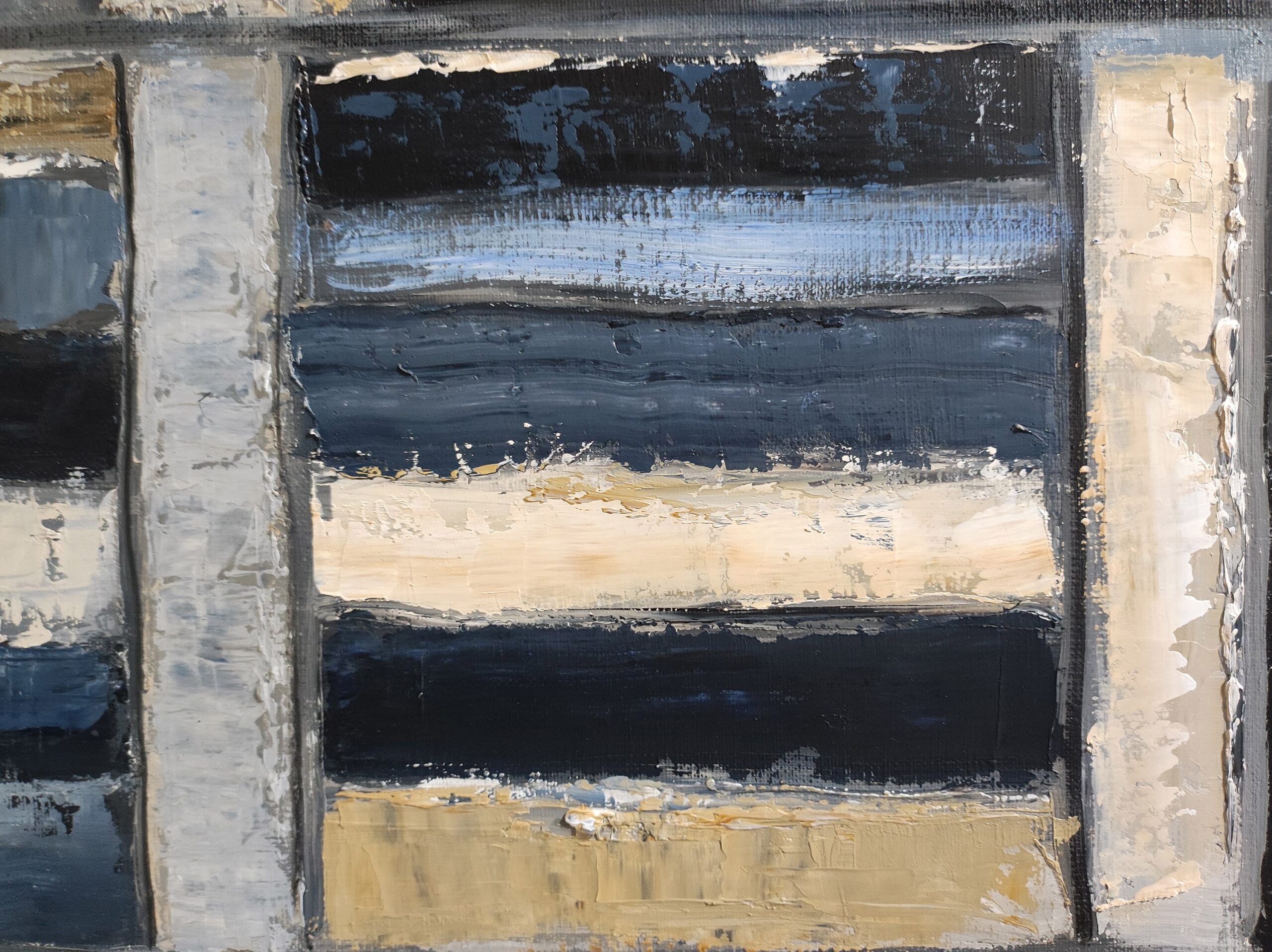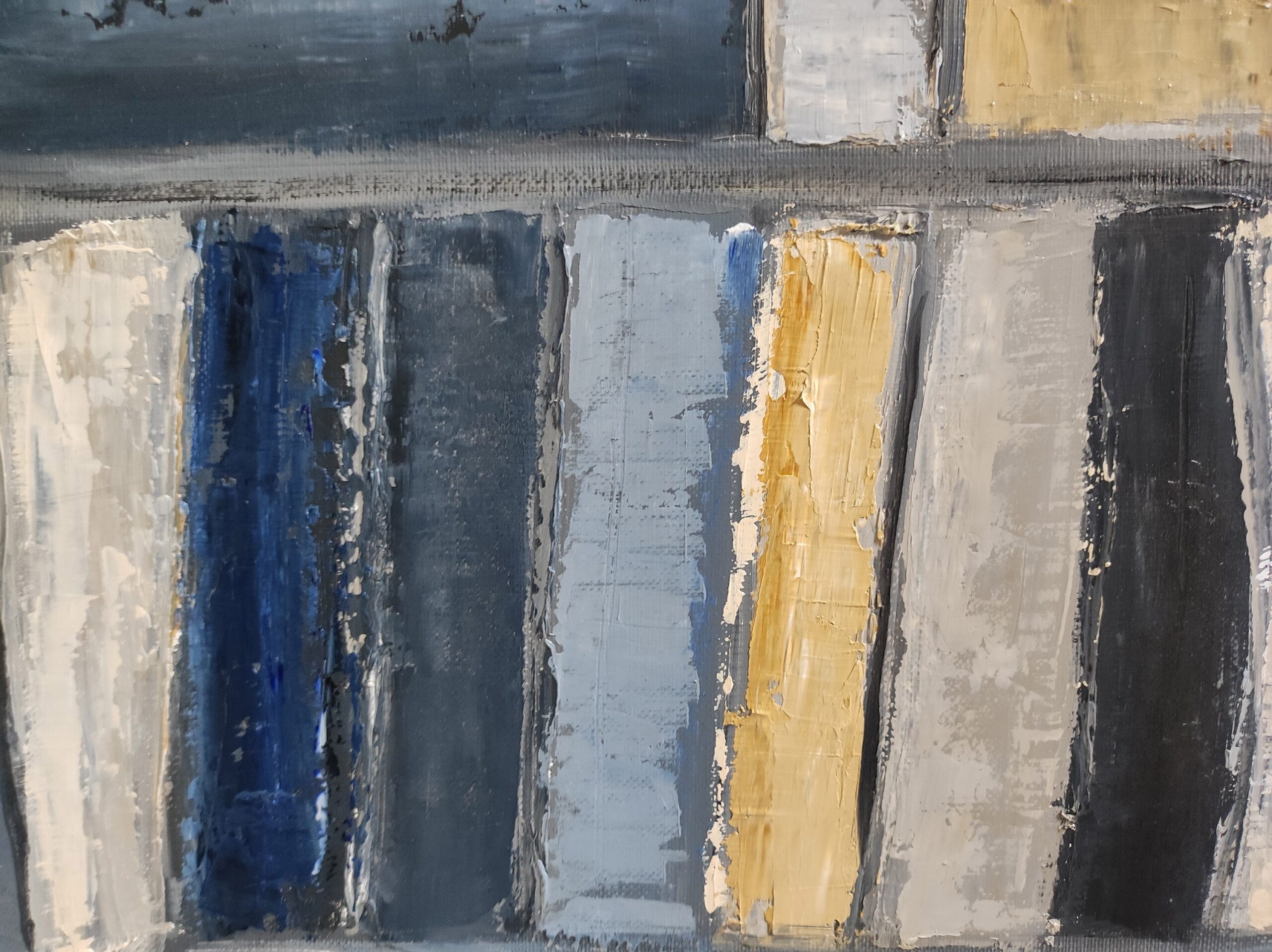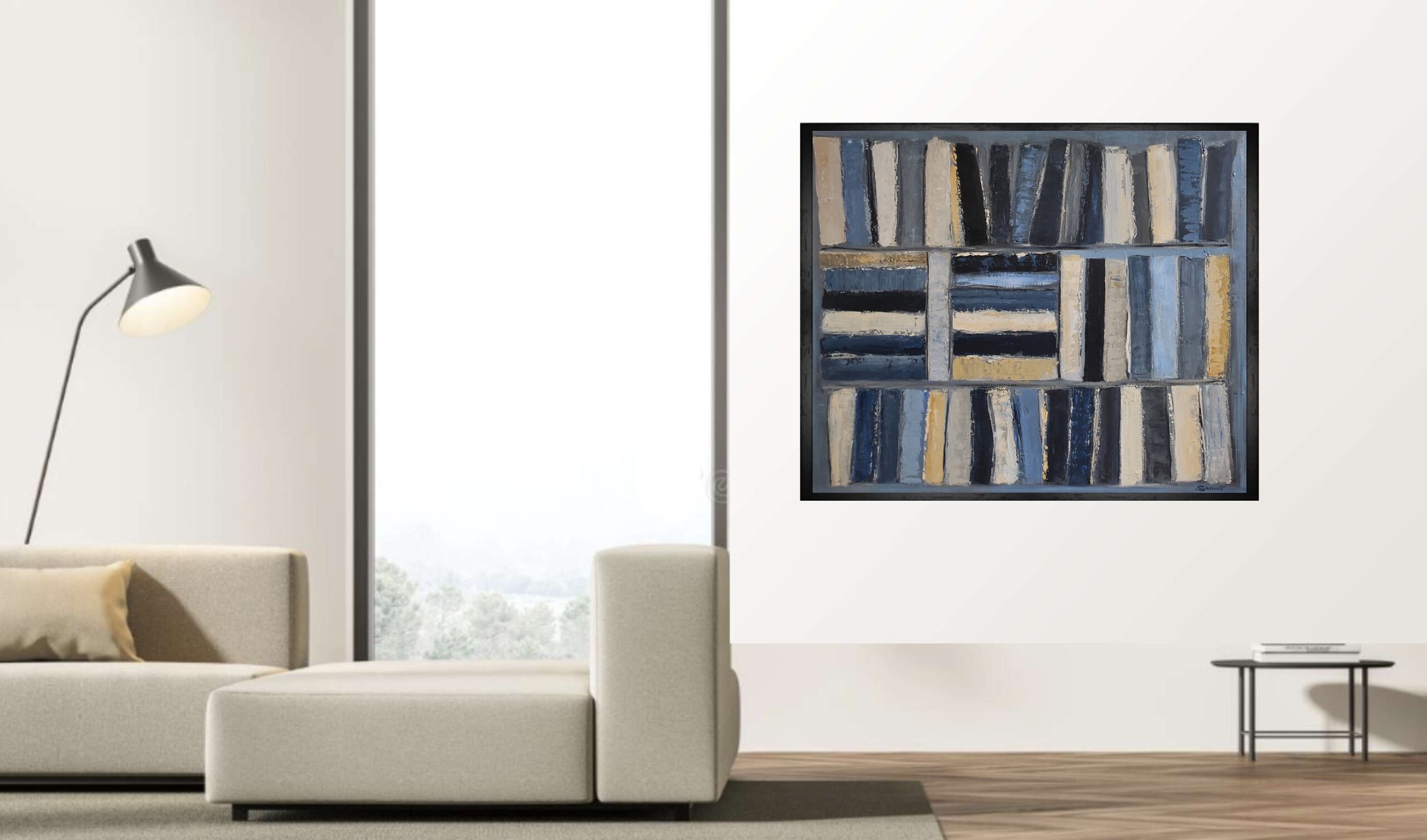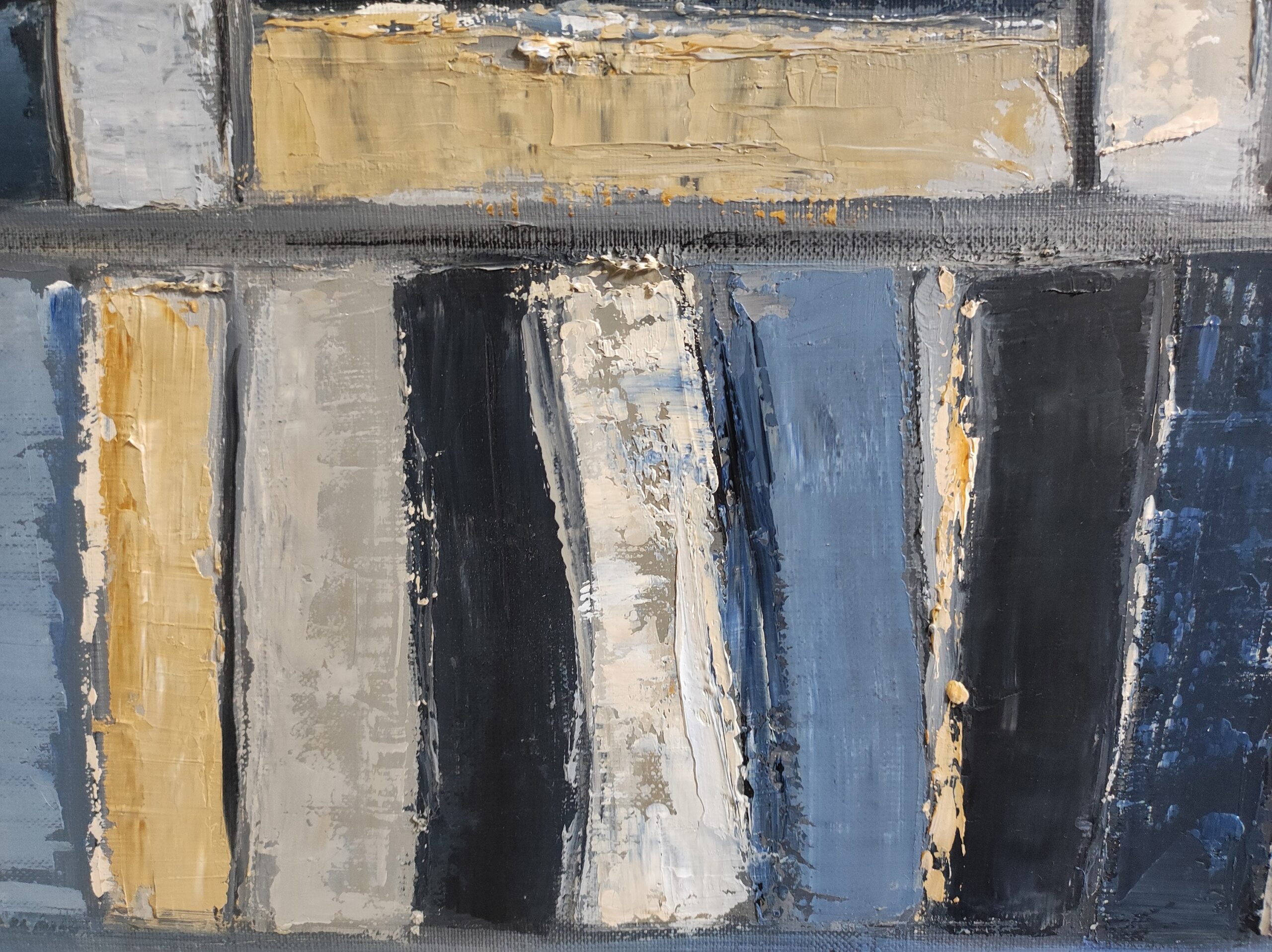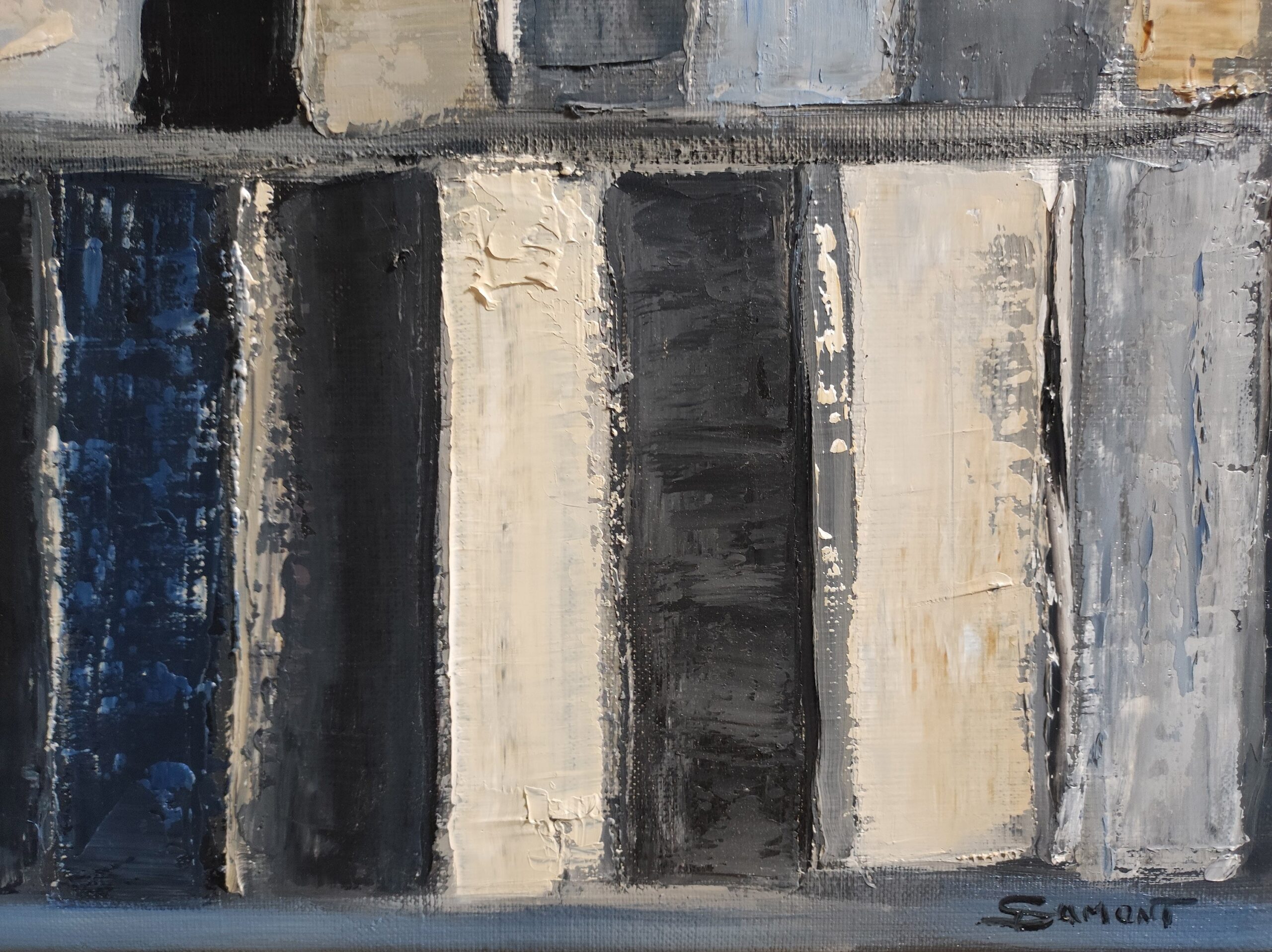 Table of a library with grey, blue and black books worked in oil and with a knife. Books are present but at the limit of abstraction. The important thing for the artist is to share his passion for books by highlighting the aesthetic side of a library and letting the viewer enter the imagination. The books here are considered in their artistic dimension. This painting is framed with an American box in natural wood but you can request a black wooden box. Library series started in 2016 and still relevant. The canvas is signed on the side so that it can be presented in a vertical version as well.