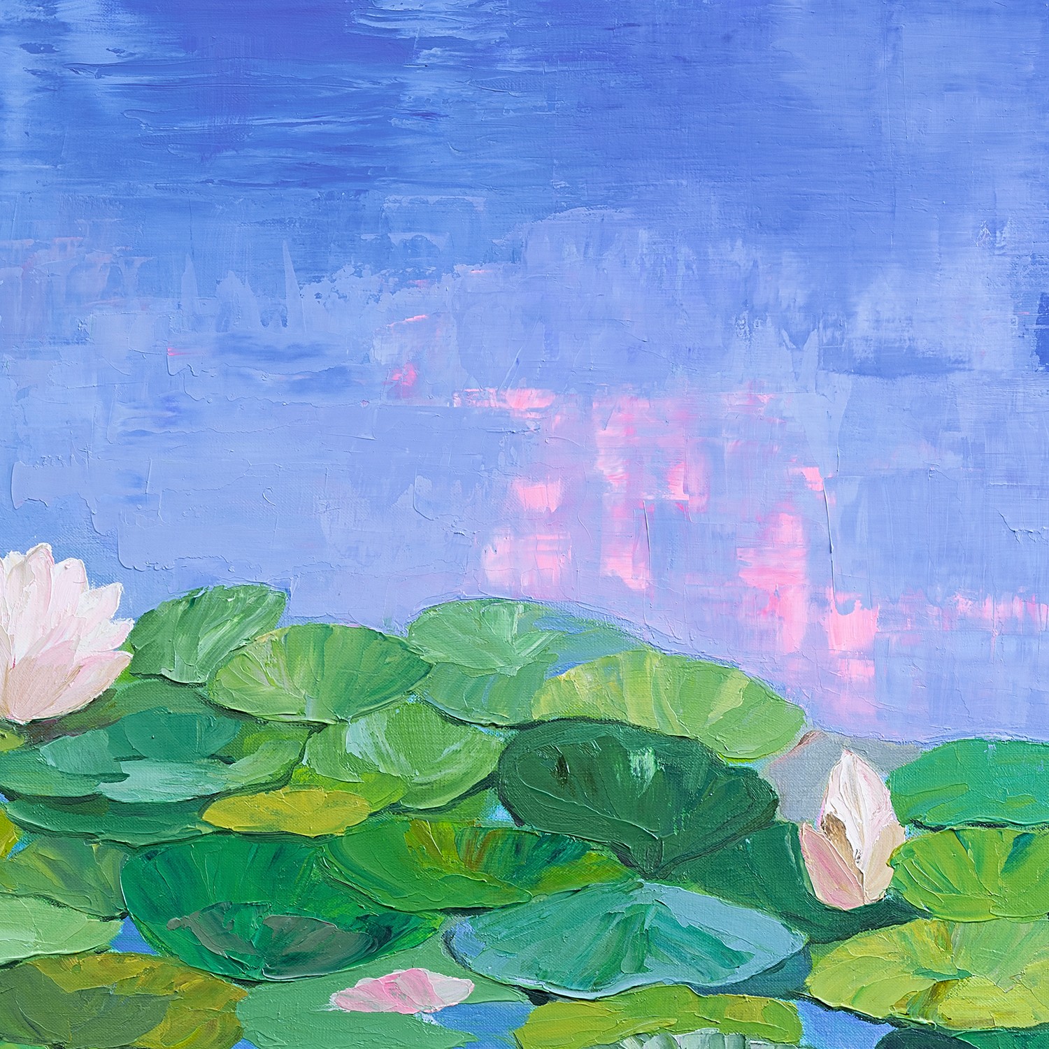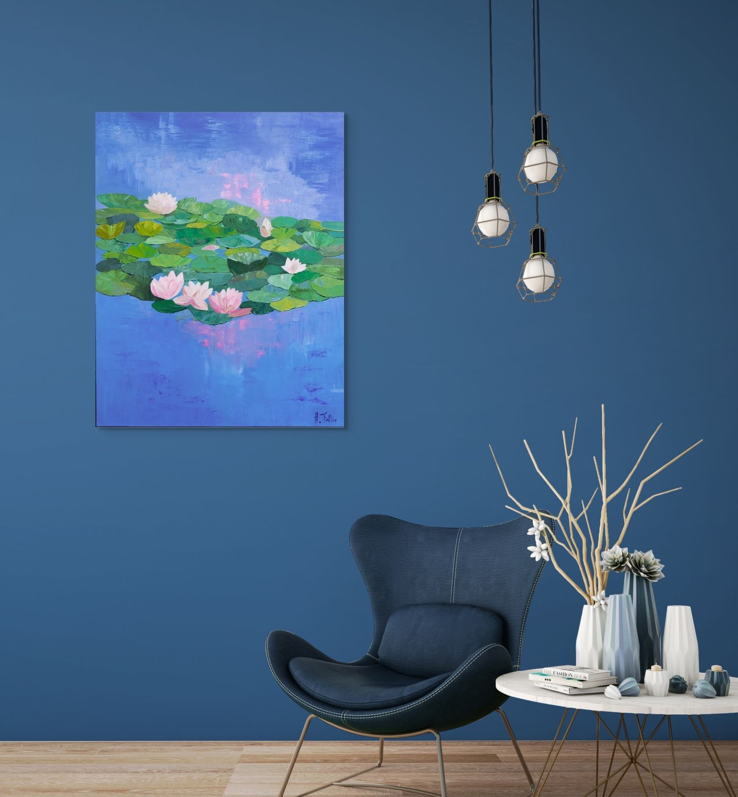 This captivating work depicts a serene pond dotted with blooming water lilies, gracefully floating on deep blue water. The vibrant green hues of the leaves contrast beautifully with the delicate pink and white petals of the flowers, creating a soothing visual harmony. The water reflections, subtly sketched in the background, add a dimension of depth and movement to the scene. The artist used precise brushstrokes to capture the tranquility and timeless beauty of the waterscape. The balanced composition invites the viewer to lose themselves in this peaceful world, evoking a sense of escape. Each element appears alive, breathing in a silent dance of nature and light. It is a masterful illustration of the serenity and elegance of aquatic nature.