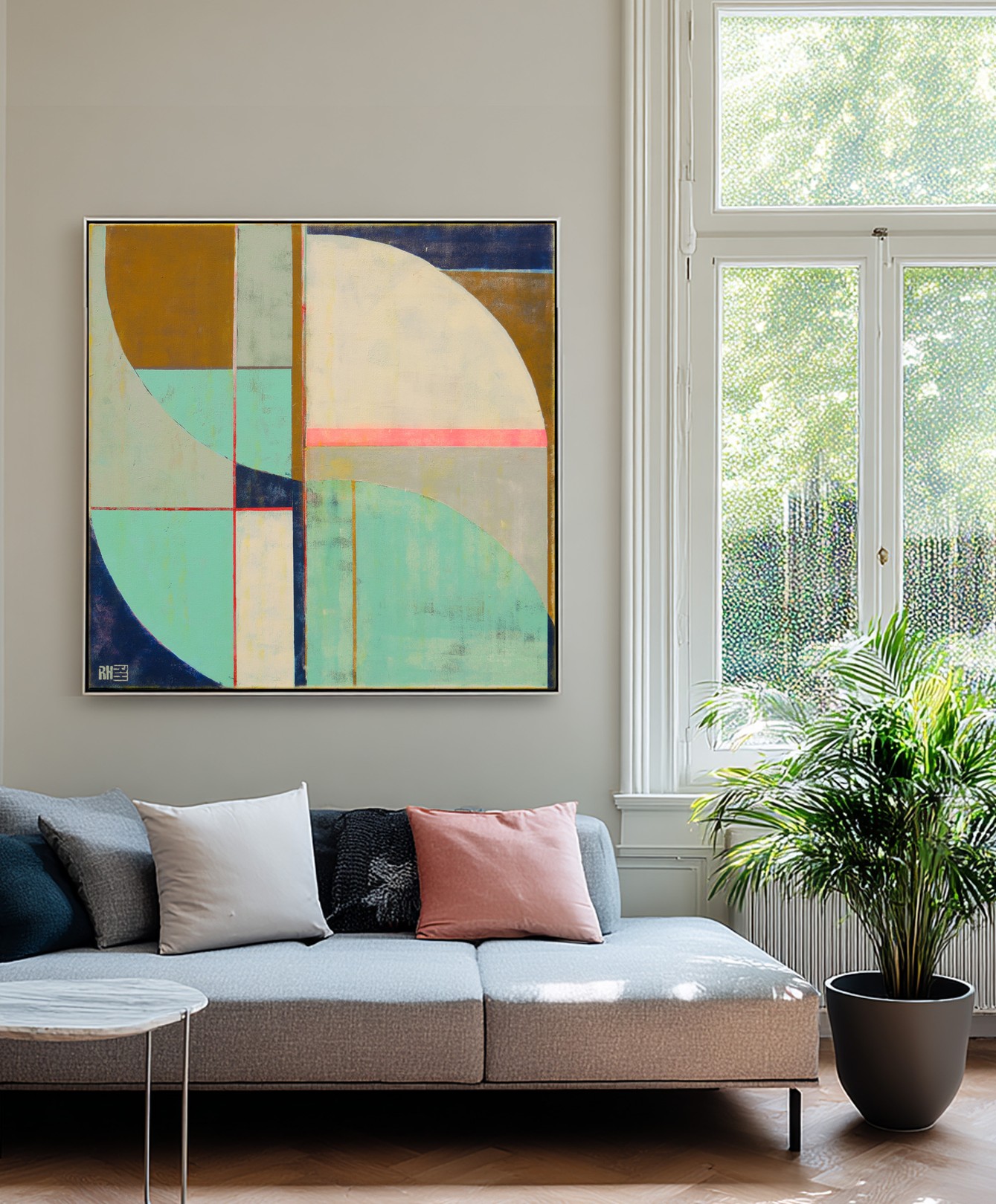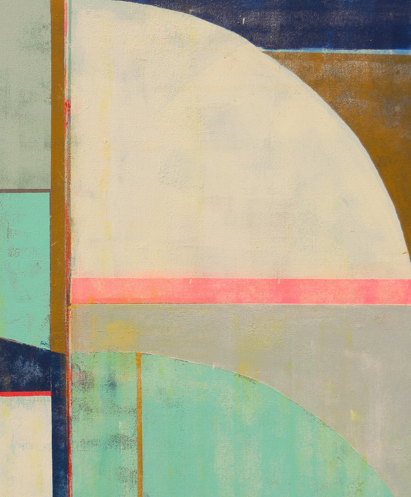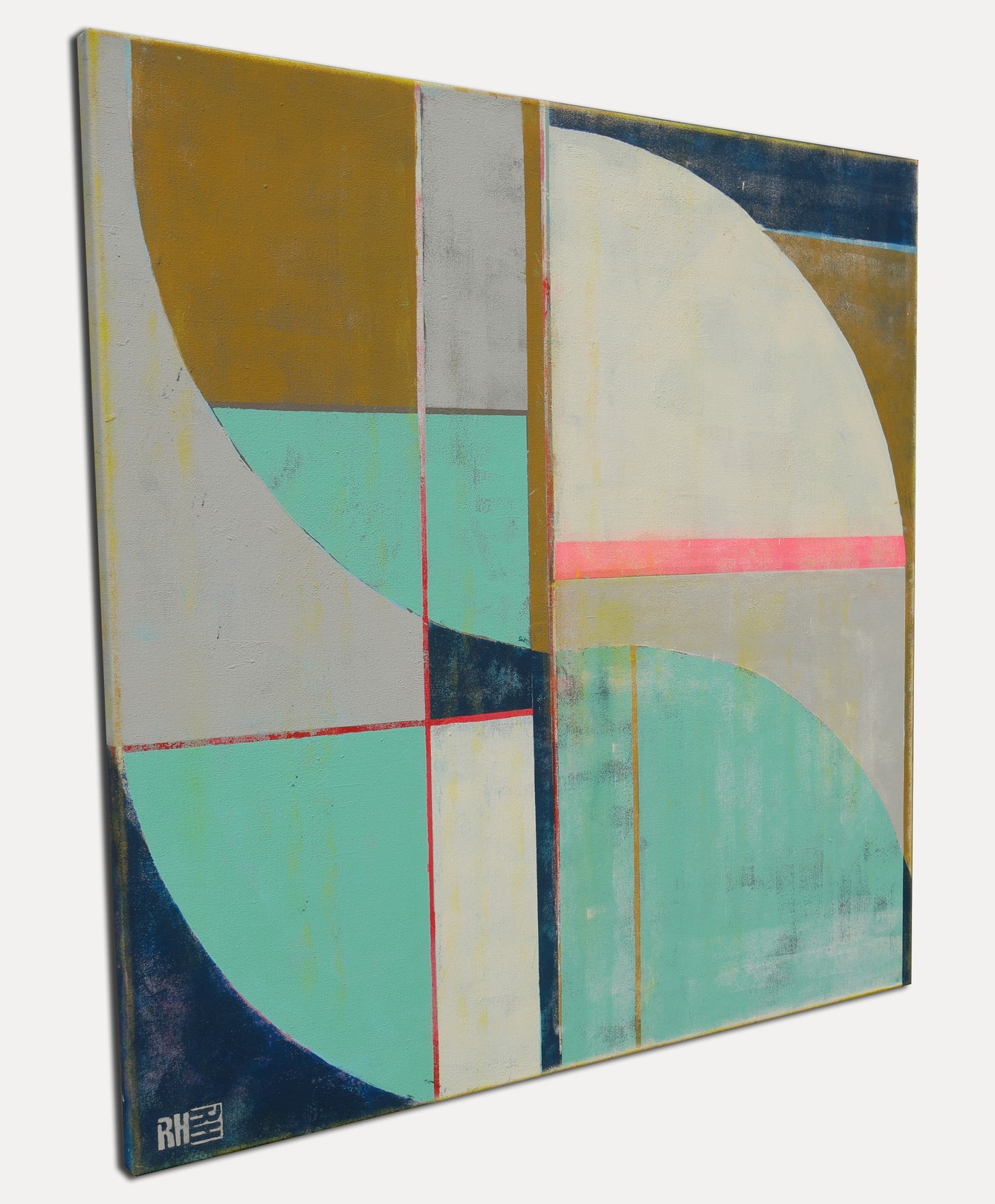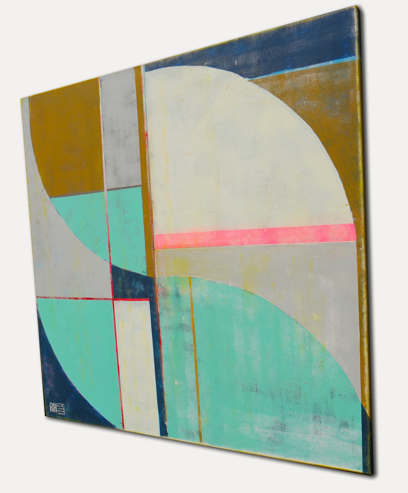 This artwork presents a compelling exploration of geometric abstraction, characterized by its precise use of lines and muted colors. The composition is divided into distinct sections of semi-circles and rectangles. A bold curve dominates the right, cutting through a serene palette of teal, beige, and warm gold. The intersecting lines create a sense of movement and tension, intensified by a striking horizontal pink stripe that bisects the piece, injecting vibrancy and contrast. The textured surface adds depth, suggesting layers of history beneath the minimalist design. The artist’s initials, subtly placed in the corner, lend a personal touch to this sophisticated balance of form and color. The work’s simplicity belies its complexity, inviting viewers to contemplate the harmony between the mathematical precision and the emotional resonance of its colors.