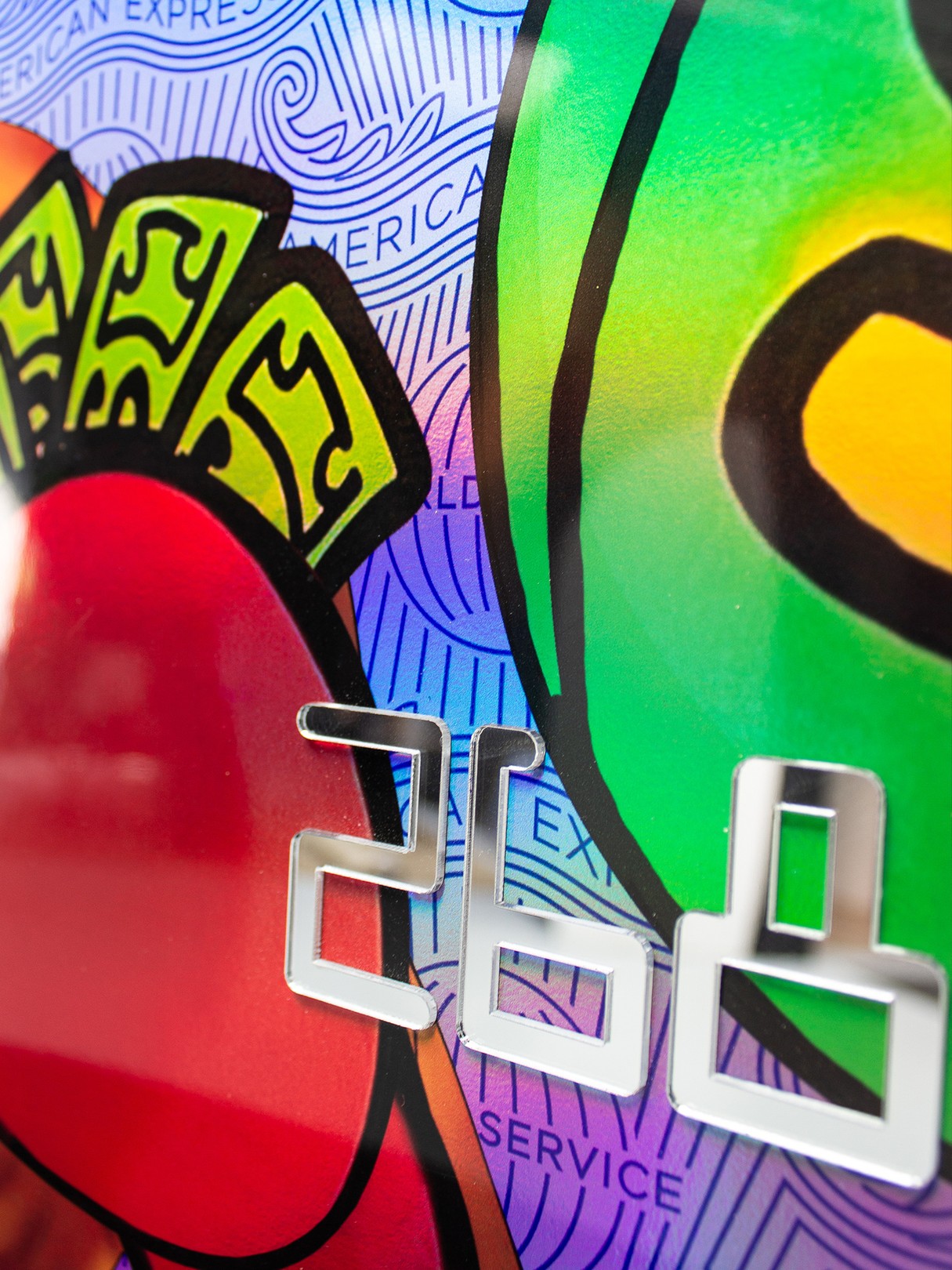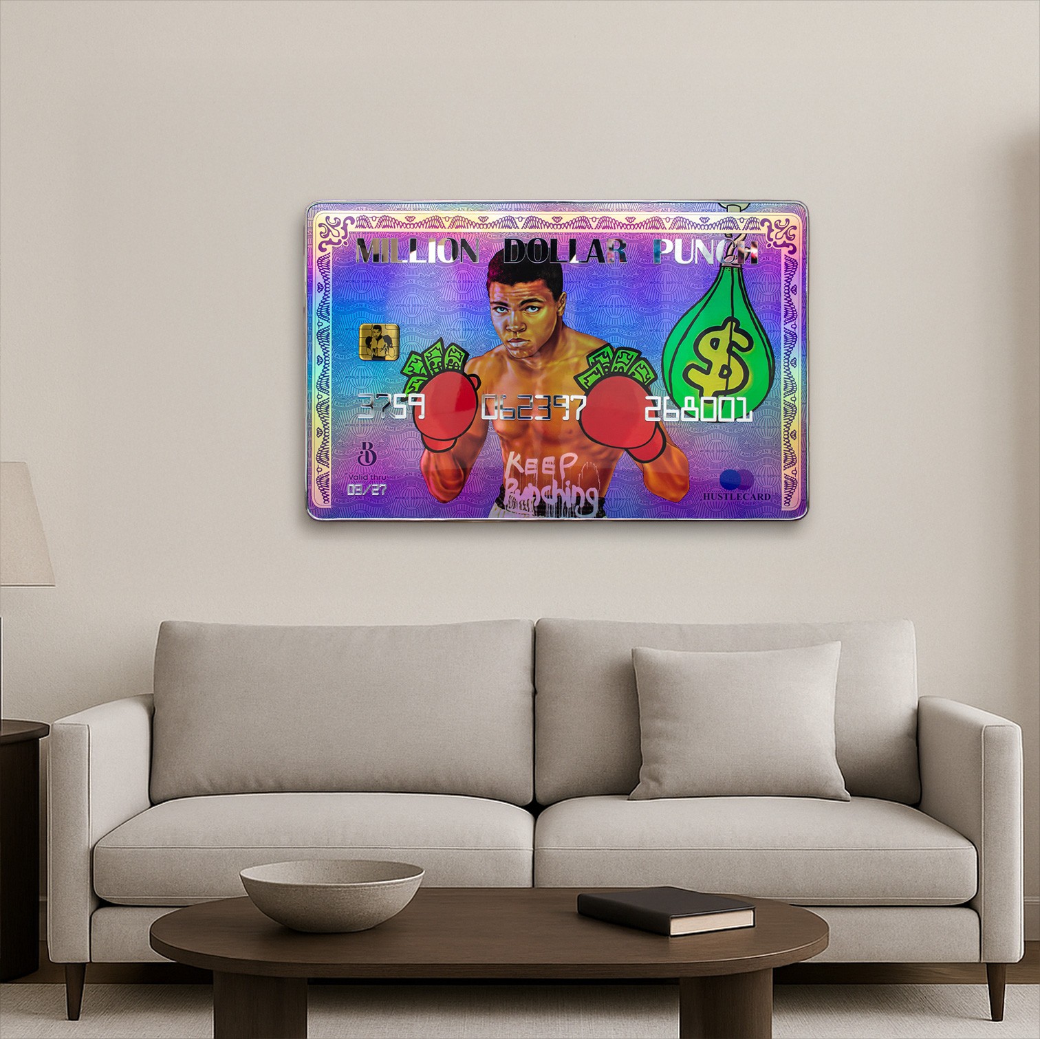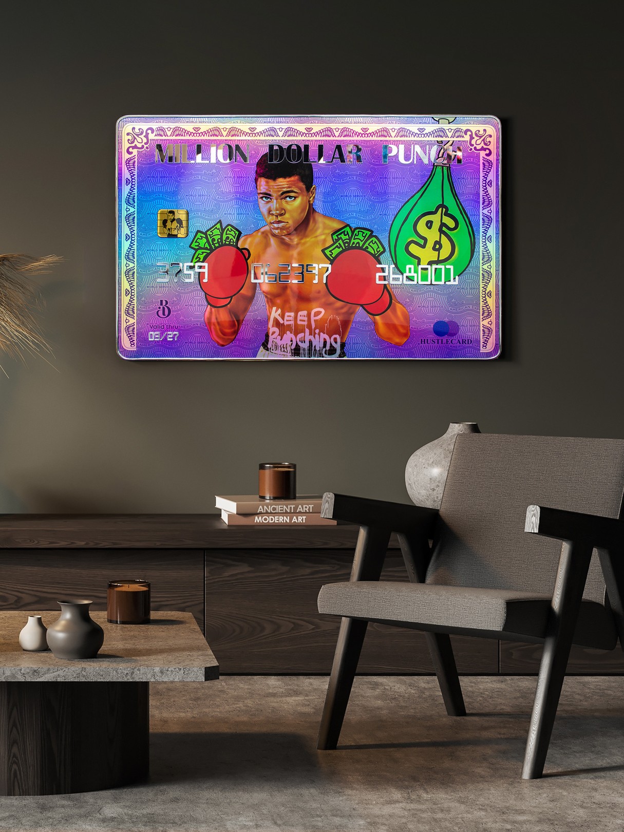 Dit levendige kunstwerk, getiteld "Million Dollar Punch", toont een opvallende fusie van boksen en rijkdom, belichaamd in een gestileerde afbeelding van de iconische bokser Muhammad Ali Clay. De figuur is getooid met rode bokshandschoenen overladen met dollarbiljetten, die het lucratieve aspect van de sport symboliseren. De bokser staat centraal tegen een achtergrond die lijkt op een creditcard, wat thema's als handel en waarde suggereert. Opmerkelijk is de aanwezigheid van een reusachtige groene bokszak met een dollarteken, wat het financiële motief versterkt. De zin "KEEP PUNCHING" staat vetgedrukt op het bovenlichaam van de bokser, wat een geest van doorzettingsvermogen uitdrukt. Rijk aan kleur en symboliek daagt dit werk kijkers uit om na te denken over het kruispunt van atletiek en financieel gewin, terwijl het een energieke en motiverende toon behoudt. De compositie maakt slim gebruik van elementen van pop-art met zijn opvallende kleuren en gelaagde betekenissen, waardoor het zowel visueel als intellectueel stimulerend is.