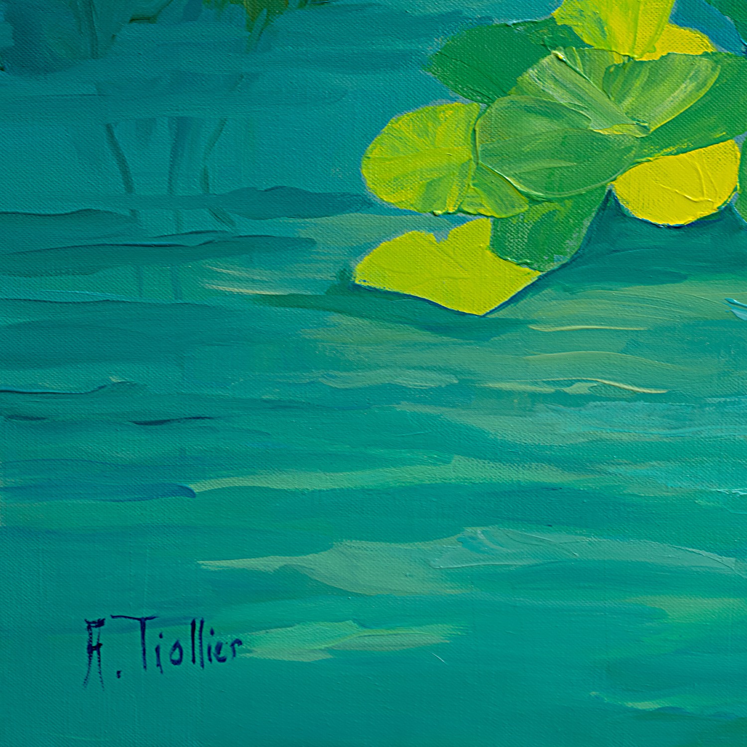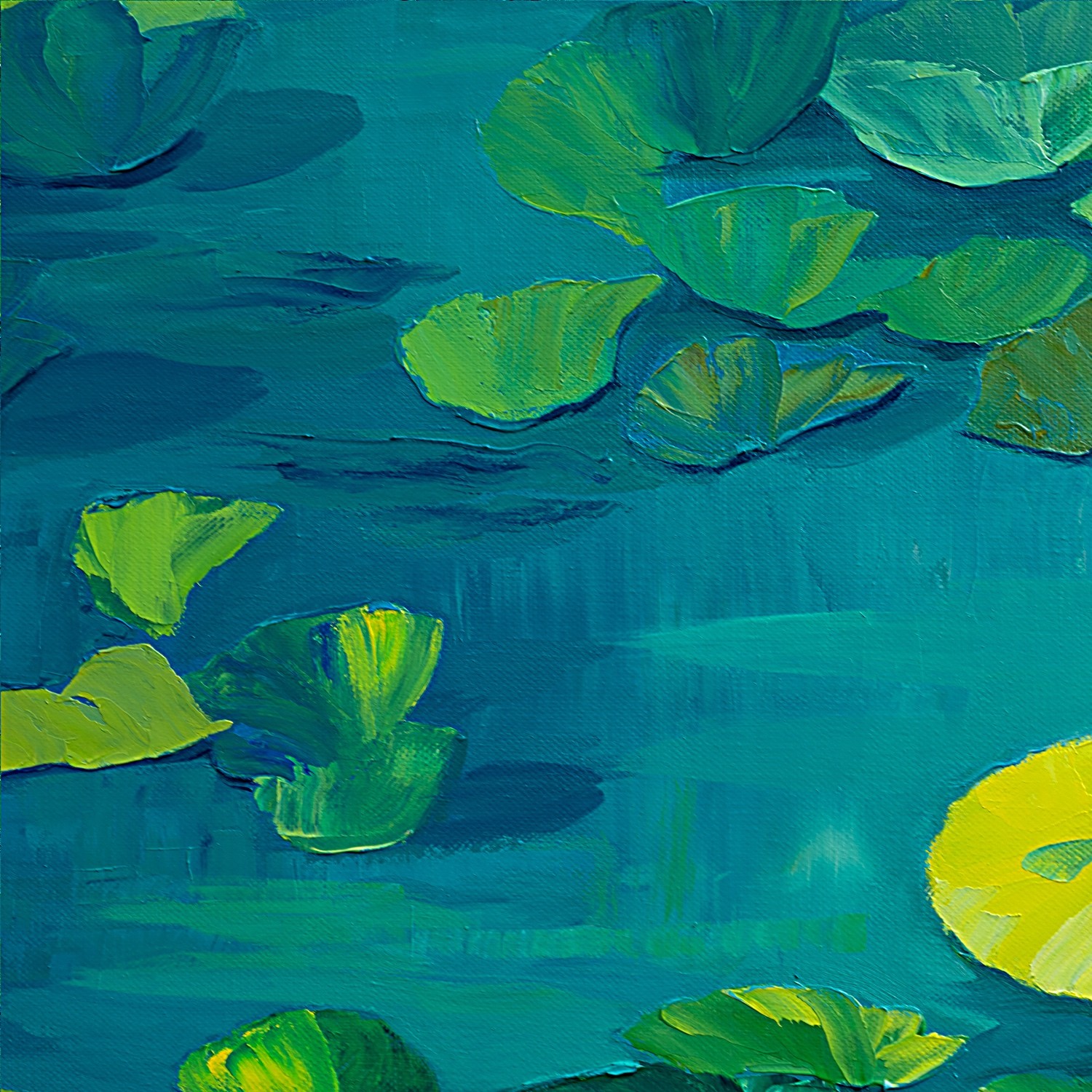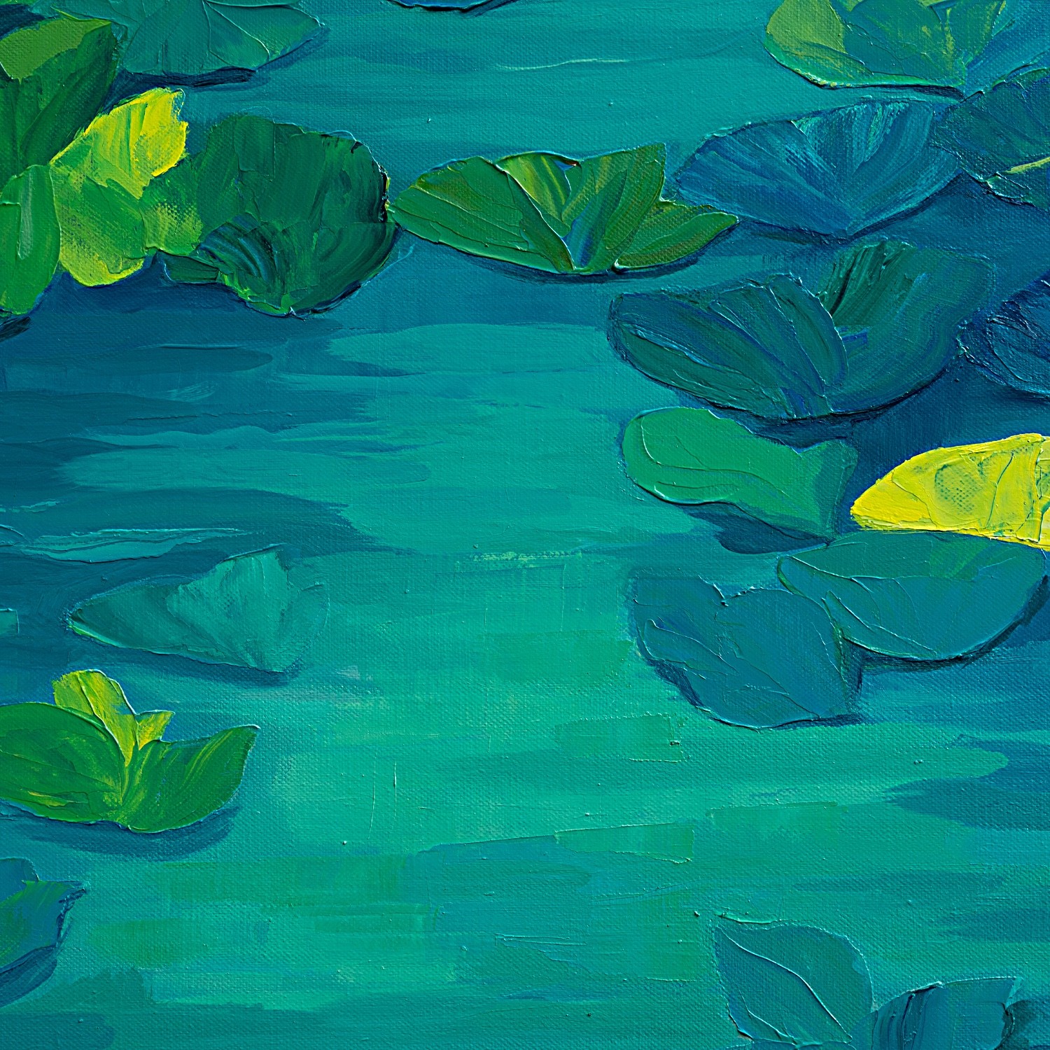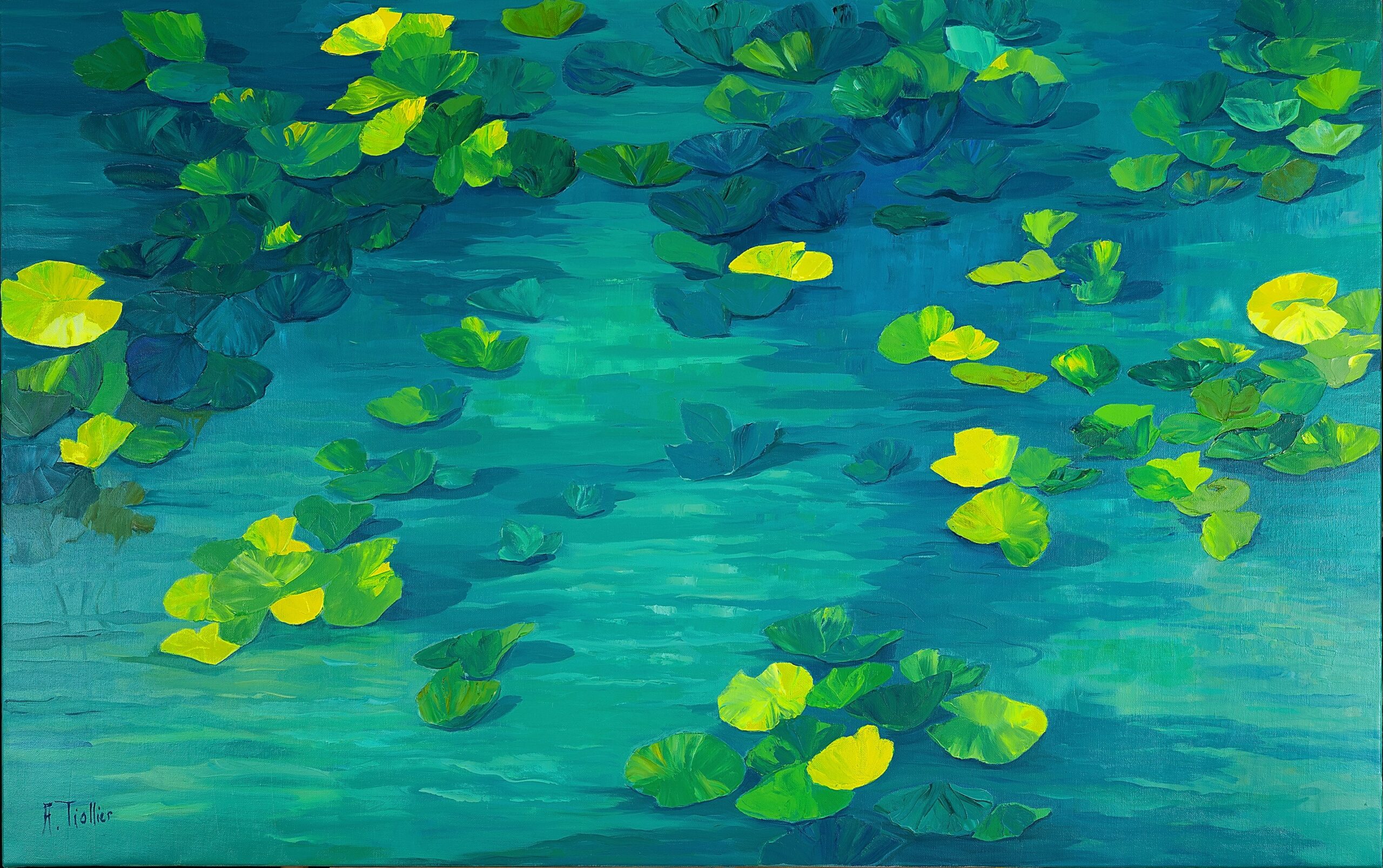 This captivating artwork, inspired by the famous water lilies, depicts a serene pond adorned with green and yellow leaves floating delicately on the water’s surface. The bold use of shades of blue and green creates a sense of depth and tranquility. The bright yellow accents add a touch of light, evoking the reflections of sunlight on the water. The fluid movement of the harmoniously dispersed leaves suggests a gentle breeze caressing the surface. The contrast between cool and warm hues provides a striking visual balance, while reinforcing the tranquil atmosphere of the scene. This artistic representation invites the viewer to a contemplative immersion in the natural beauty of this aquatic environment, while capturing the mystique and serenity of an idyllic water garden.