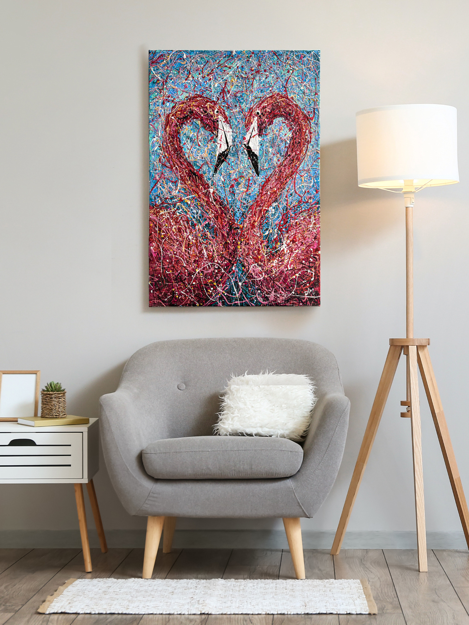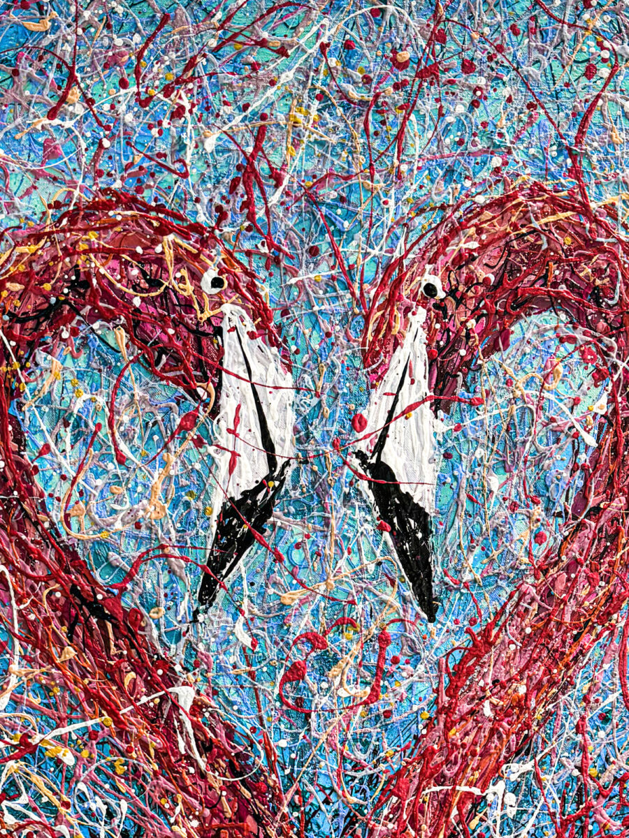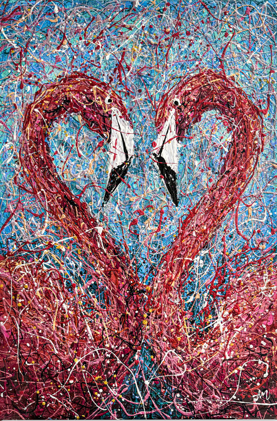 This painting is a powerful expression of unity, beautifully capturing the profound connection between two beings. The two intertwined forms, reminiscent of flamingos, create a heart at the center of the composition, symbolizing an eternal bond. Their bright, vibrant colors pulse with life and energy, evoking feelings of love and devotion. The getextureerd surface deepens the emotional impact, allowing you to almost feel the warmth and connection between them.