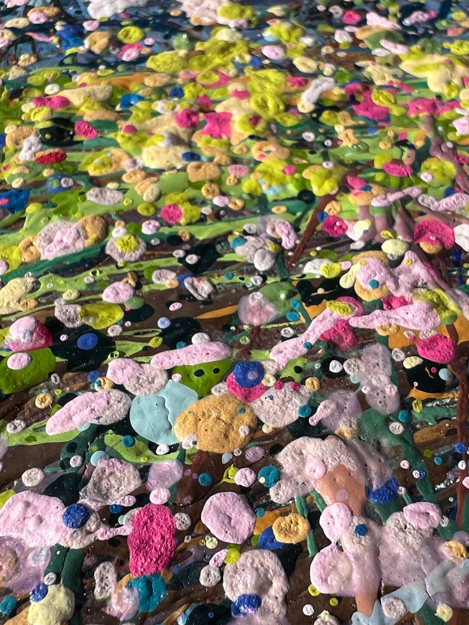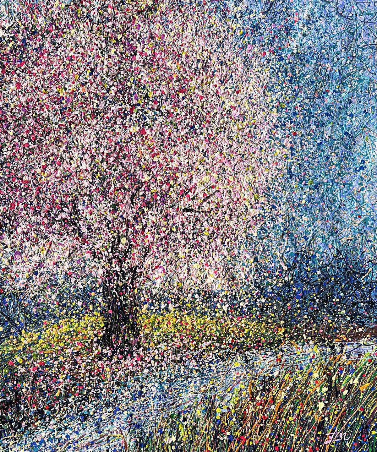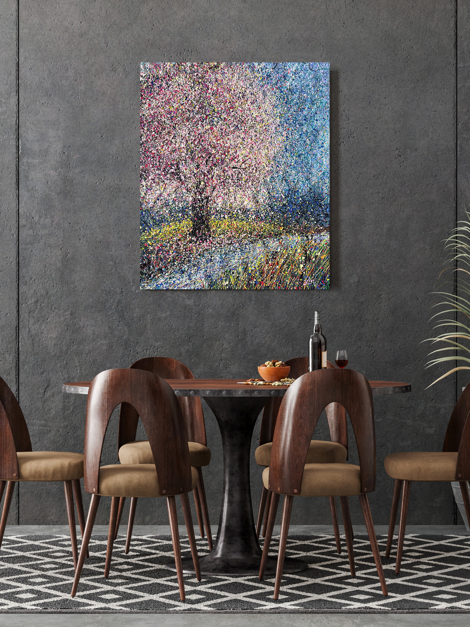 Dit schilderij spreekt in stilte van delicate kracht, een eenzame boom in volle bloei, waarvan de witte bloesems symbool staan voor zuiverheid en de vluchtigheid van schoonheid. De getextureerd impasto-techniek blaast leven in elk bloemblaadje en takje, waardoor een gevoel van levendige energie ontstaat dat bijna tastbaar aanvoelt. Het is een werk dat uitnodigt tot nadenken, dat een moment biedt om stil te staan en de vergankelijke schoonheid van het leven en de blijvende kracht van liefde te waarderen.