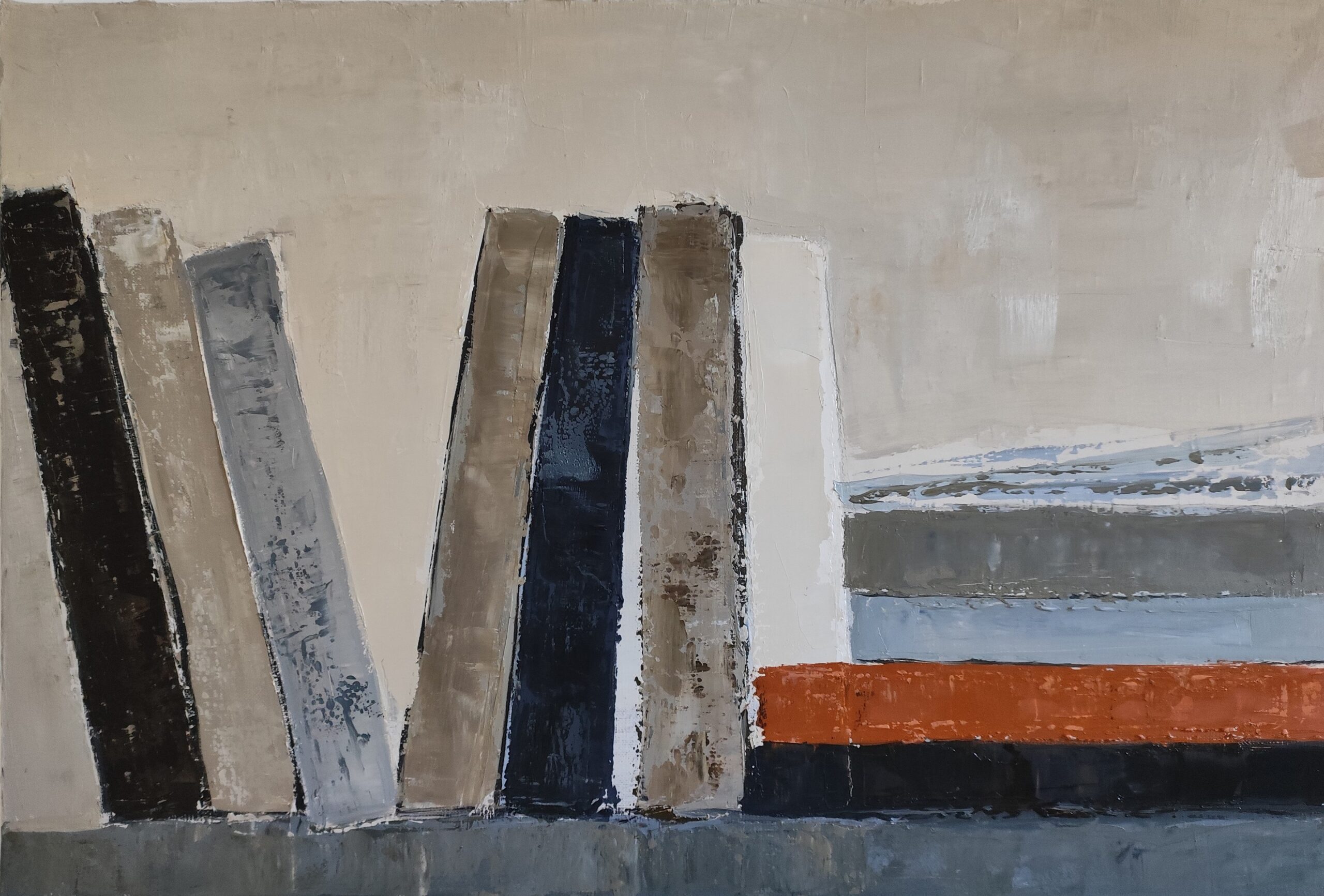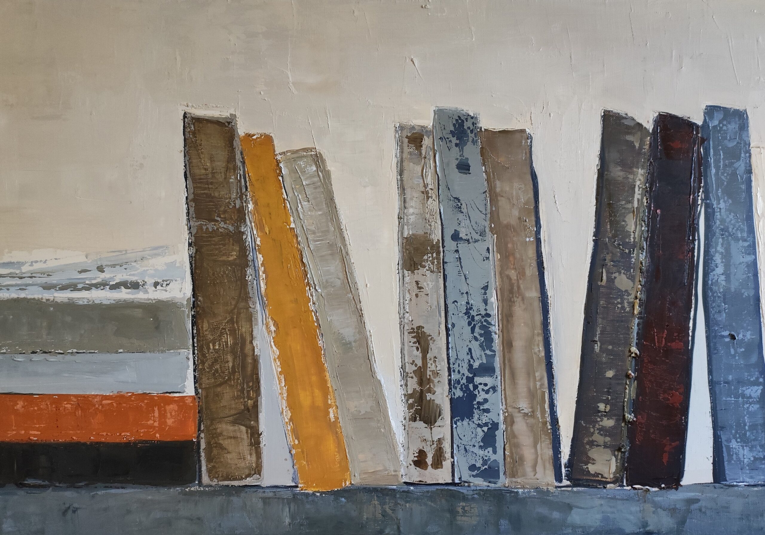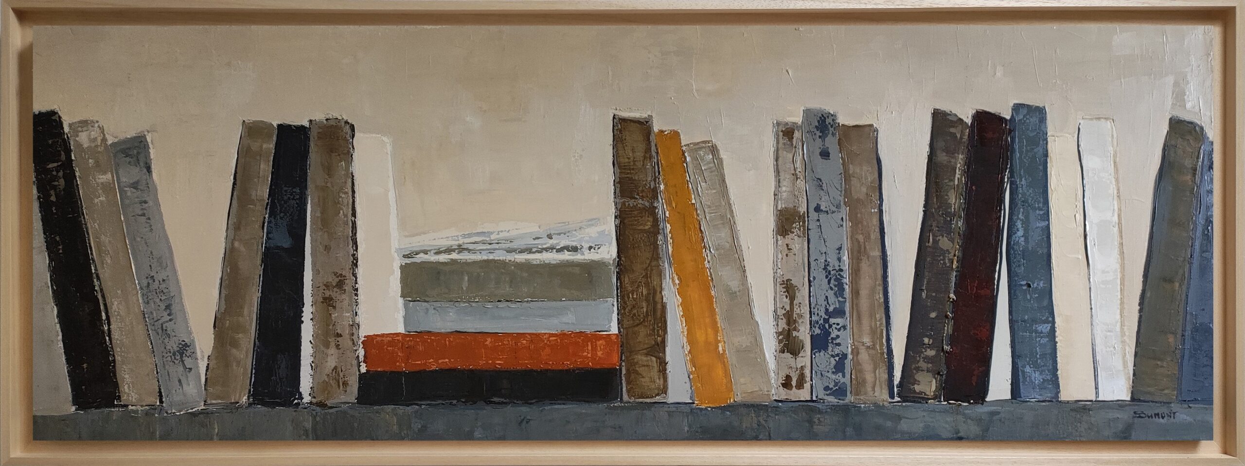 Sophie Dumont is a contemporary French painter living and working in Normandy. Her work, exclusively in oil on canvas, relies on layering, the depth of the material, and a constant reflection on structure, time, and the trace. For several years, she has been developing a unique universe made up of stylized libraries, abstract landscapes, and interior spaces.