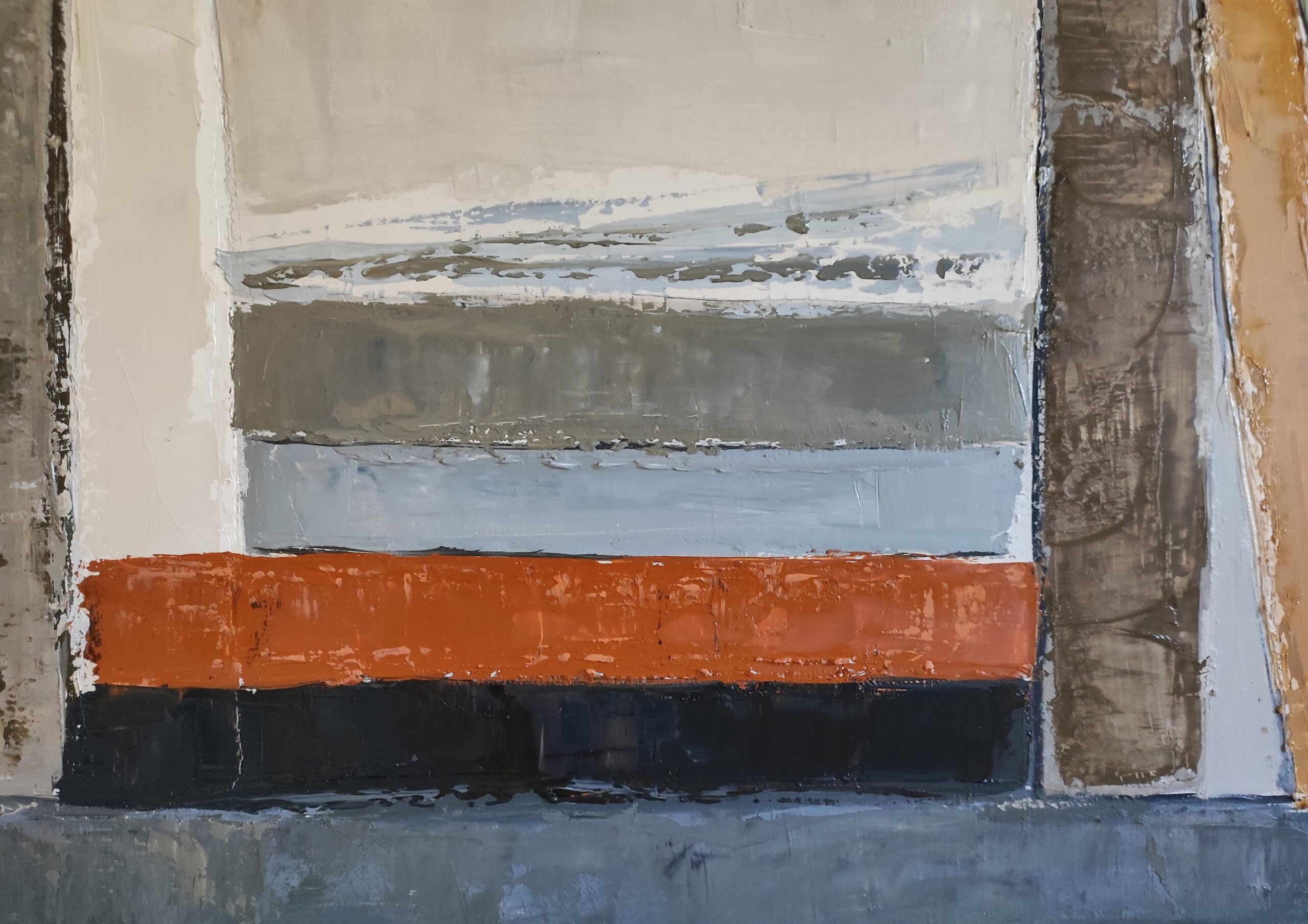 The deliberately restrained palette combines nuanced grays, deep blues, ochres, and earthy tones. These chromatic variations create a subtle tension without ever disrupting the overall harmony. The patinated edges, reworkings, and visible erasures bear witness to the time it took to create the work.