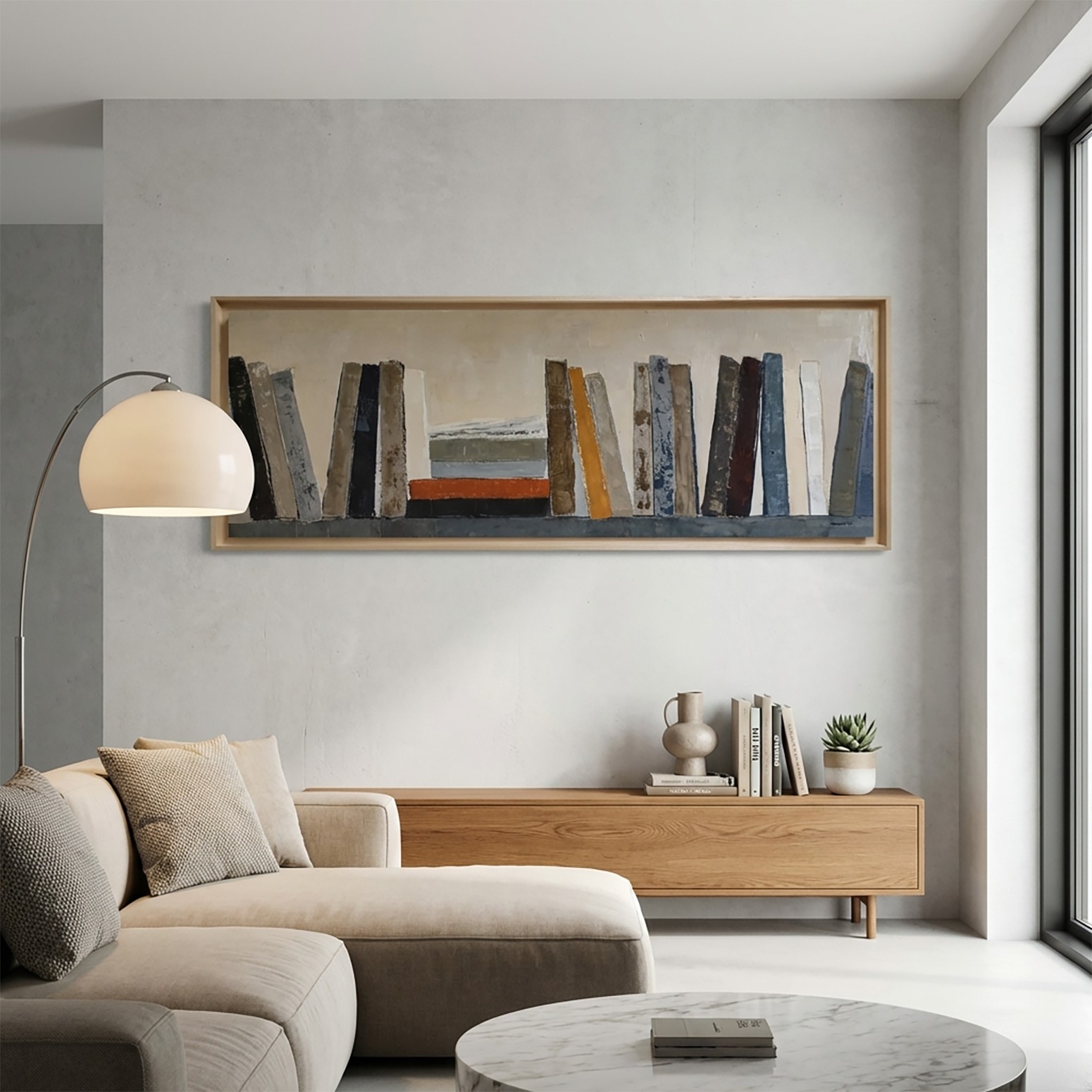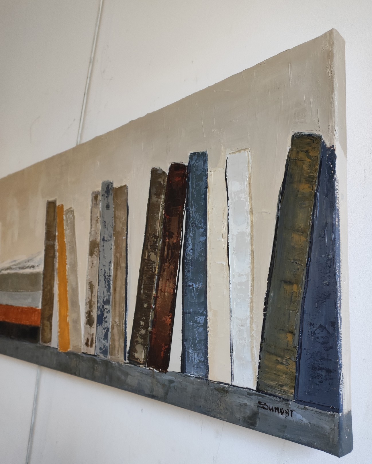 With Ordo continuus, the artist presents a horizontal composition punctuated by a succession of vertical forms reminiscent of books or architectural landmarks. The eye moves naturally along the canvas, punctuated by a more contemplative central section, a true point of equilibrium within the whole. The elongated format accentuates this sense of continuity and progression.