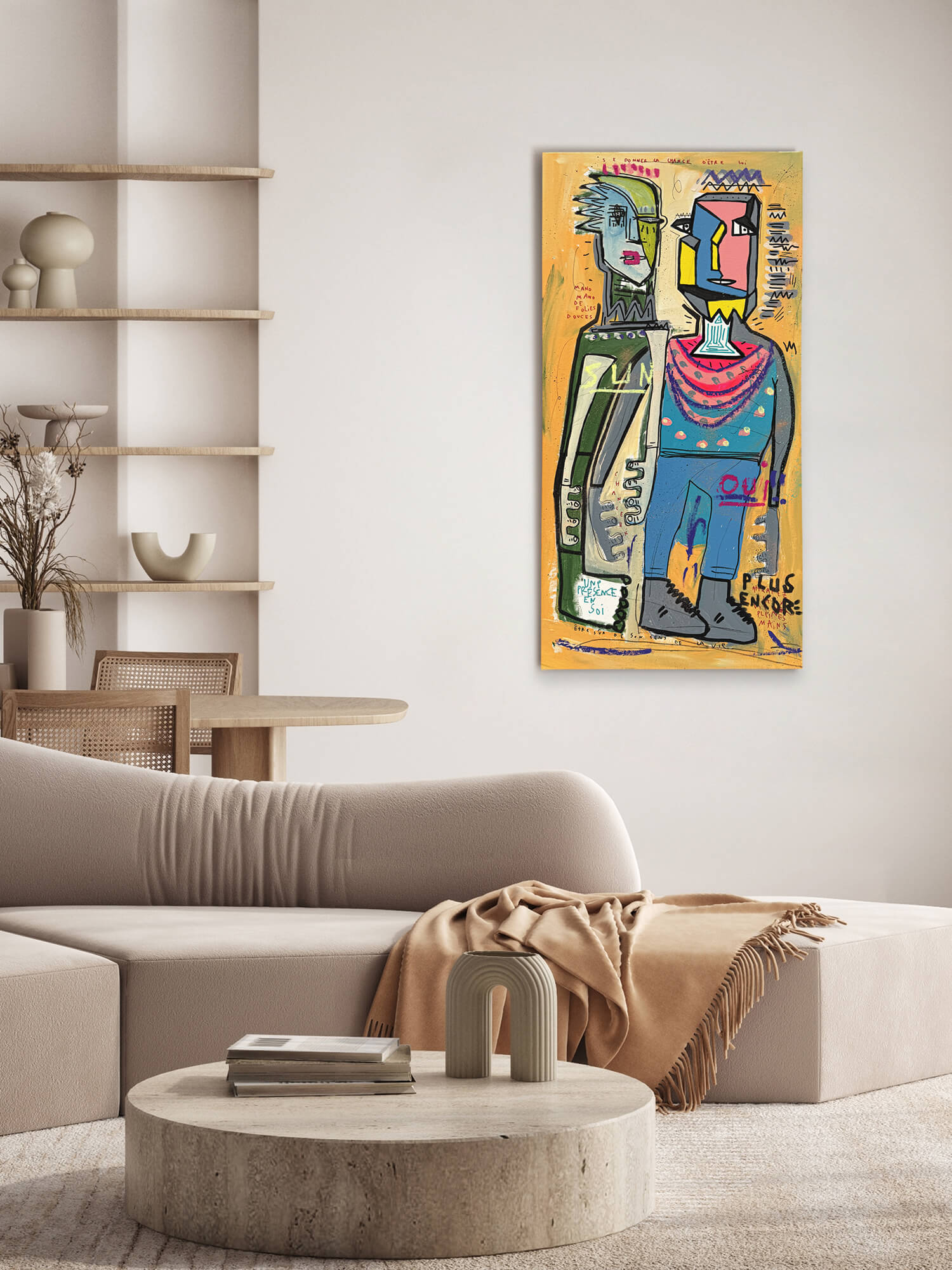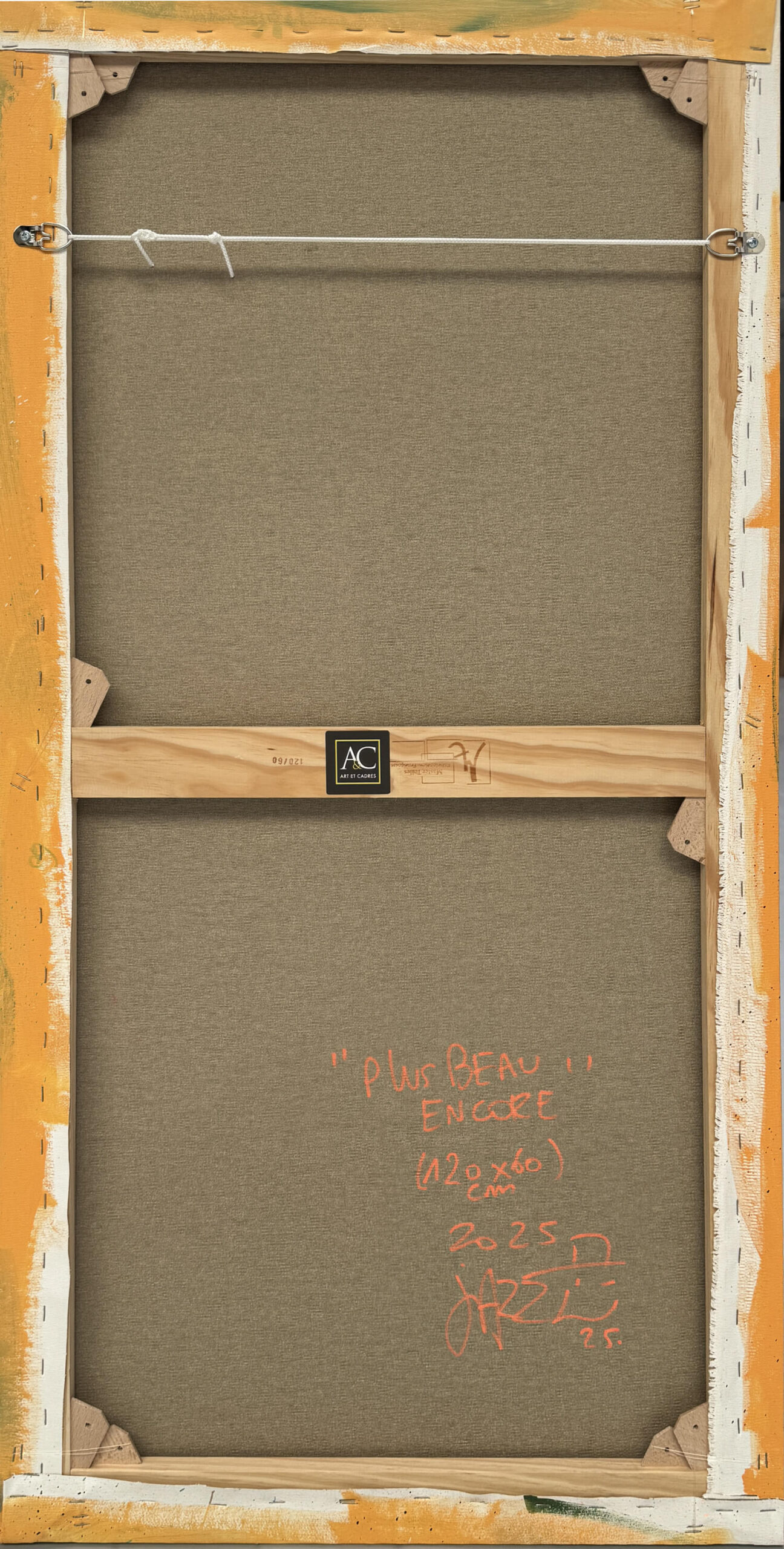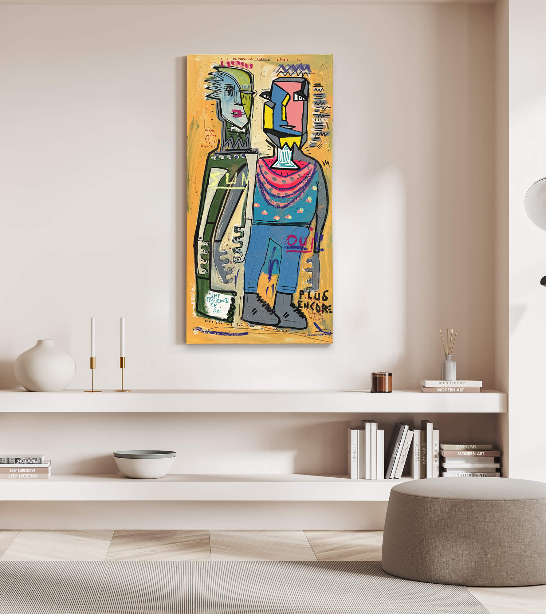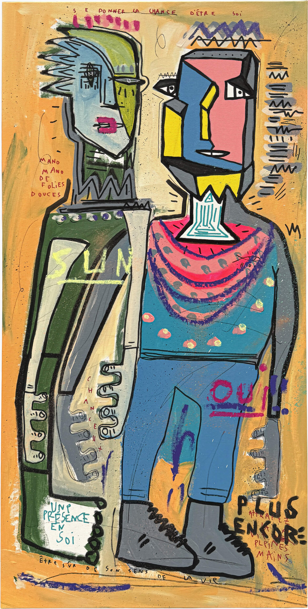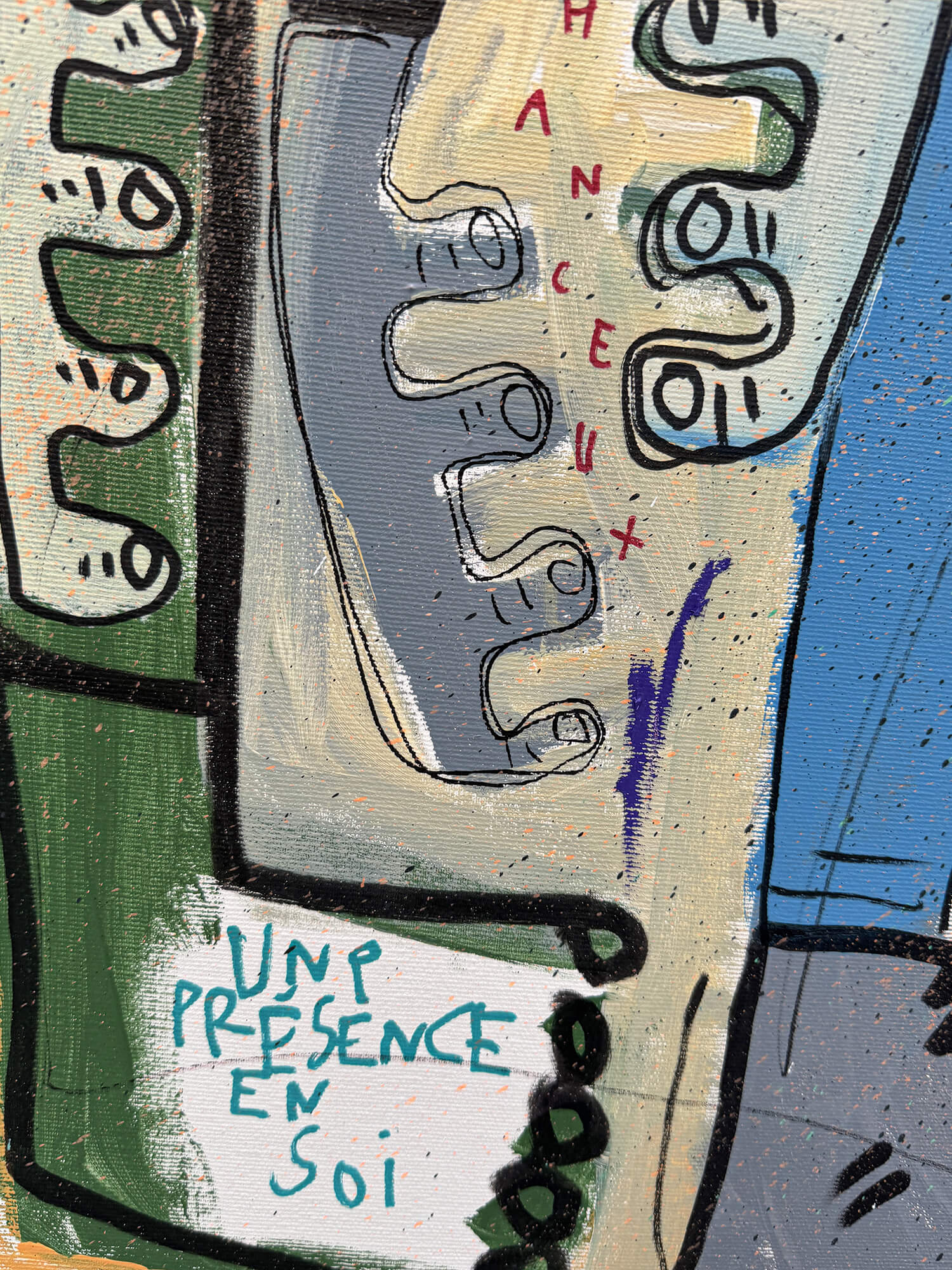 This artwork (Plus beau encore by Jazzu) is a striking blend of abstract and figurative elements, featuring two juxtaposed figures. The left figure exhibits an elongated, greenish face with sharp, dynamic lines, evoking a sense of introspective duality. The use of bold, angular shapes and primary colors on the right figure contrasts vividly, with a yellow and pink bifurcated face that exudes vibrancy and tension. Both figures are interconnected through their geometric construction, yet maintain individuality through differing postures and expressions. The background, a chaotic tapestry of scribbled text and symbols, adds depth and complexity, suggesting a narrative or inner dialogue. The artwork’s layered textures and mixed media approach invite viewers to delve into a realm where identity, emotion, and meaning intersect. Unique and compelling, this piece challenges perception and engages with themes of coexistence and individuality.