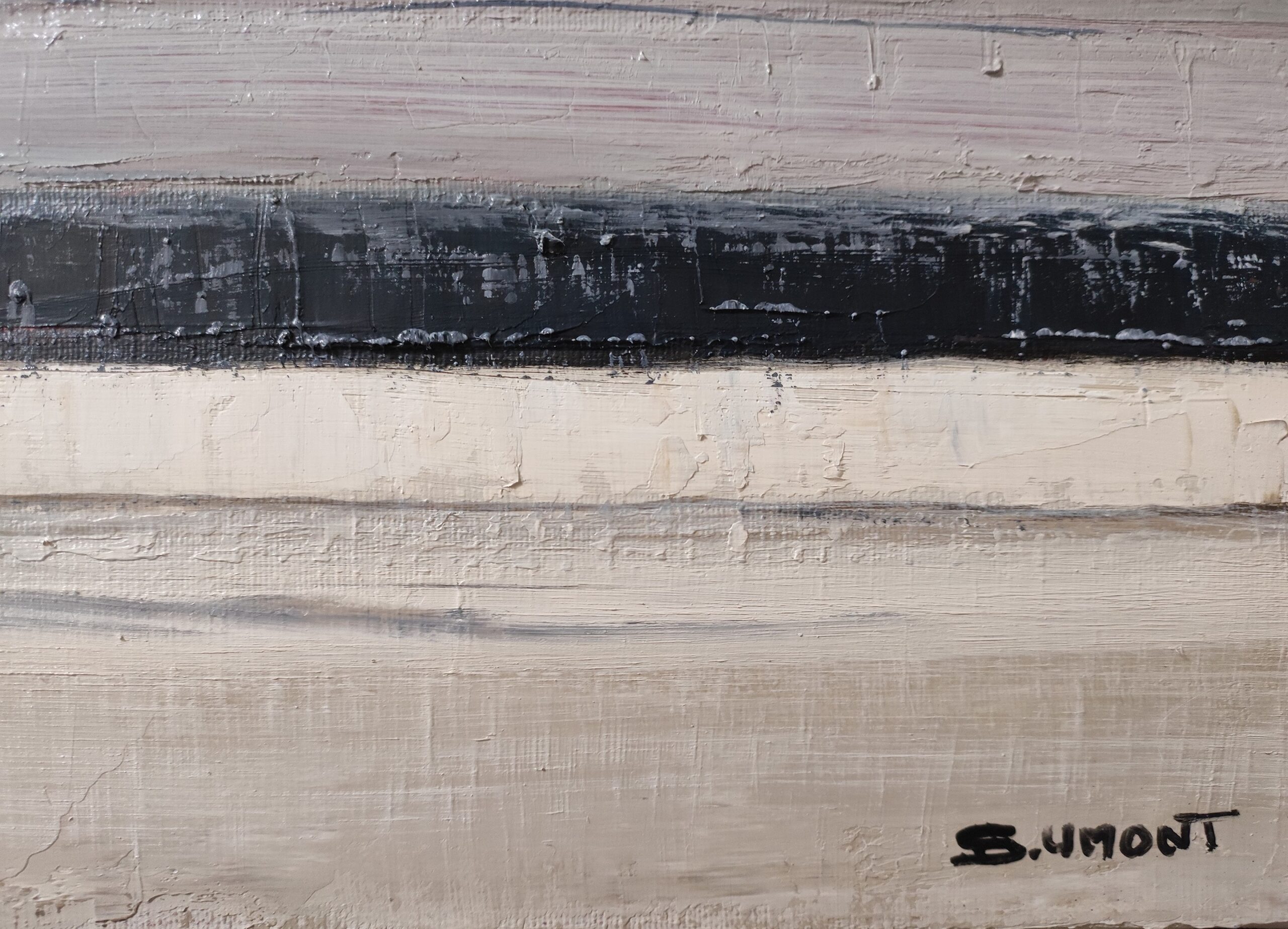 The artist works in oil with a knife, creating a dense, vibrant, and subtly textured surface. The soft hues—sand beige, pearl gray, chalky white—are crossed by a deep black band, like a horizon line anchoring the space. This strong yet silent contrast gives the work its intensity.