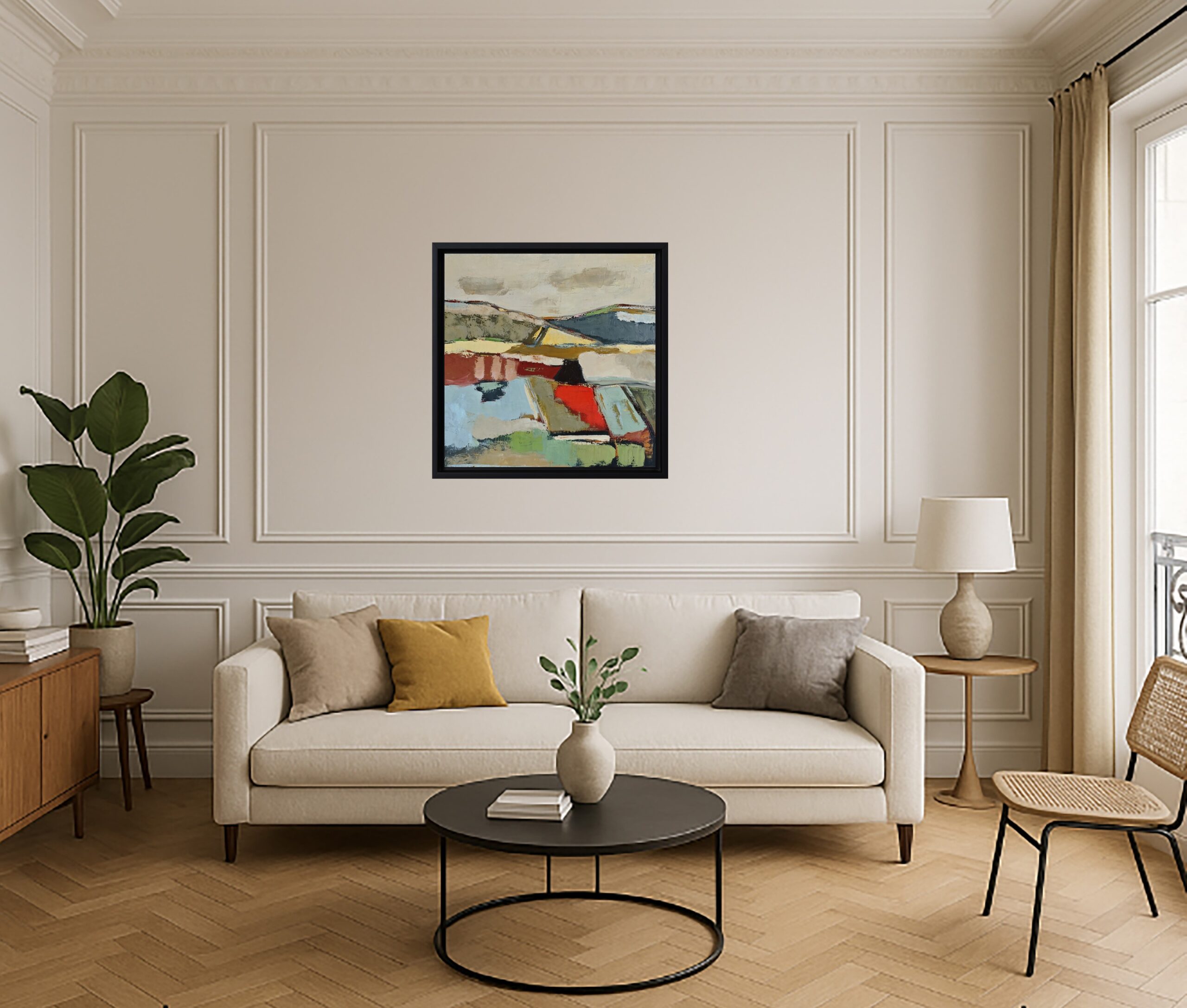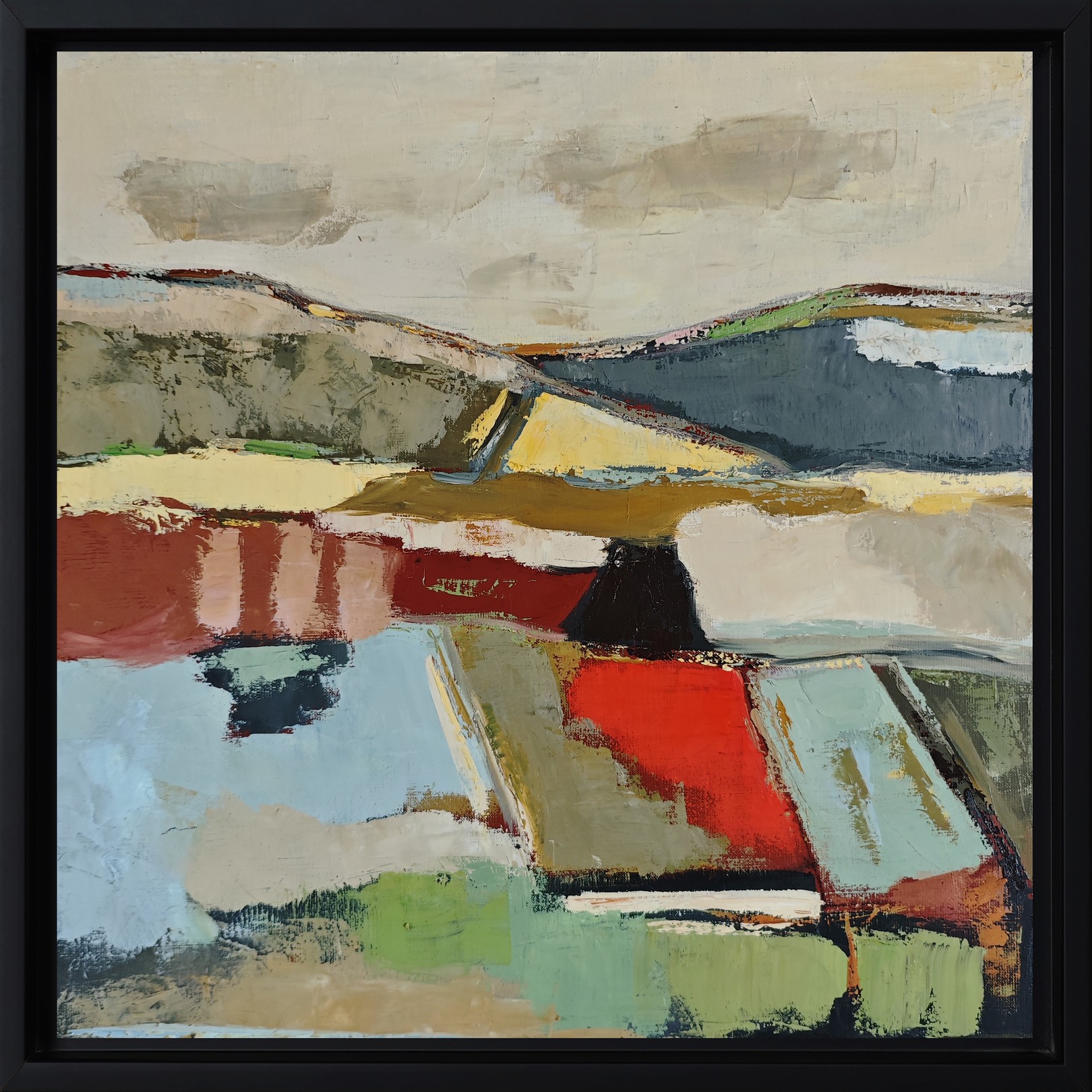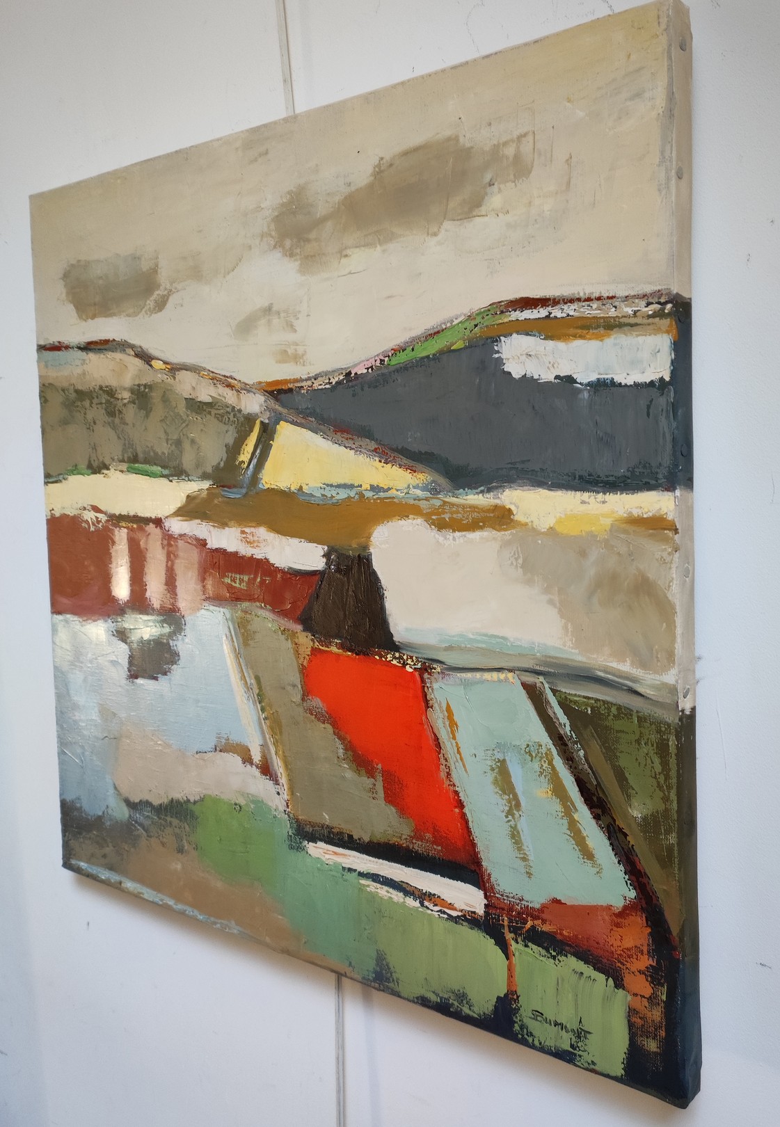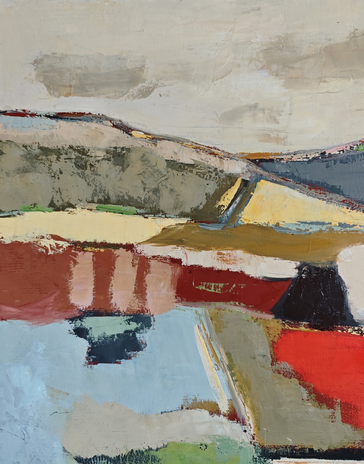 The gaze wanders between reds and greens, beiges and pale blues, in a subtle balance of warmth and freshness. Each hue seems to interact with its neighbor, like the reflections of a changing earth beneath a peaceful sky. The horizon line, barely sketched, connects these chromatic spaces in a breath of calm and continuity.