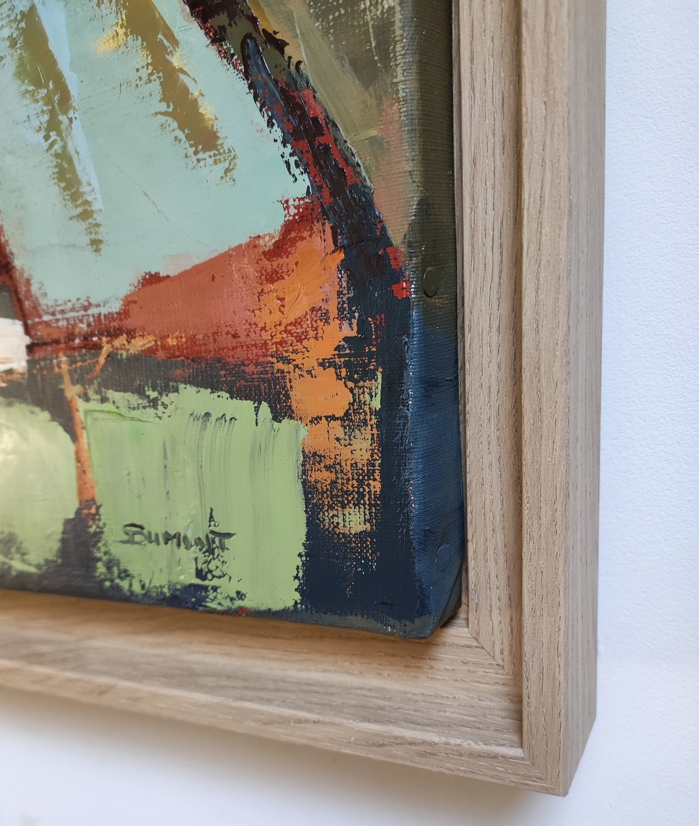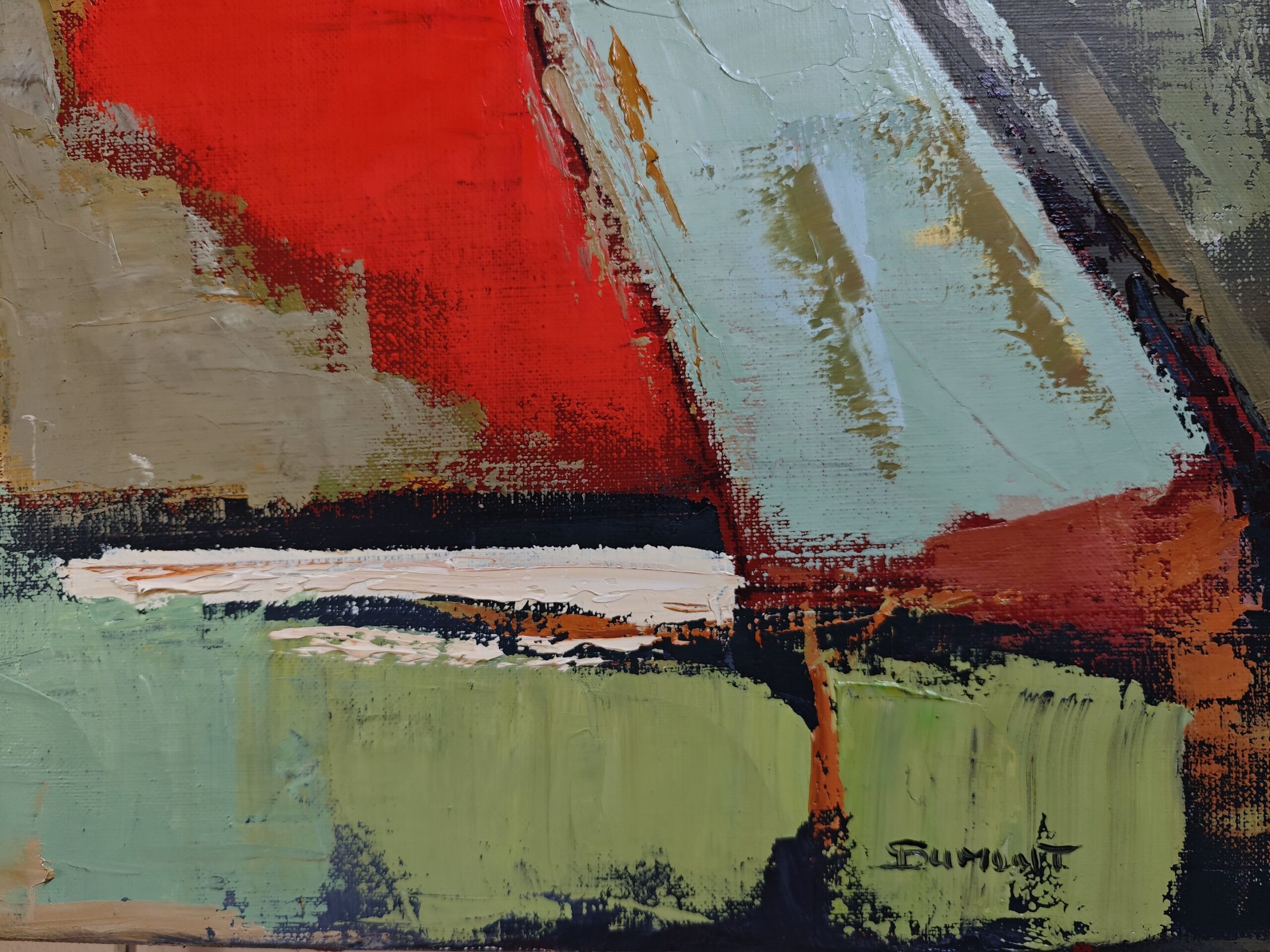 In Reflets de terre, Sophie Dumont explores the encounter between matter and light, between structure and sensation. The composition, both solid and shifting, evokes a stylized landscape that the artist deconstructs into colorful layers. The flat areas of oil, applied in thick layers with a knife, create a vibrant relief that captures the light and softens its contrasts.