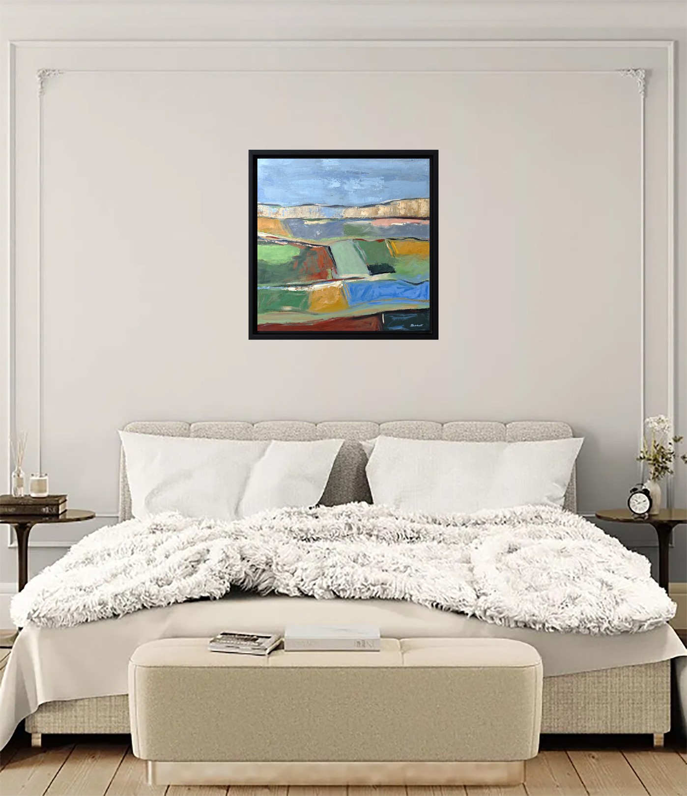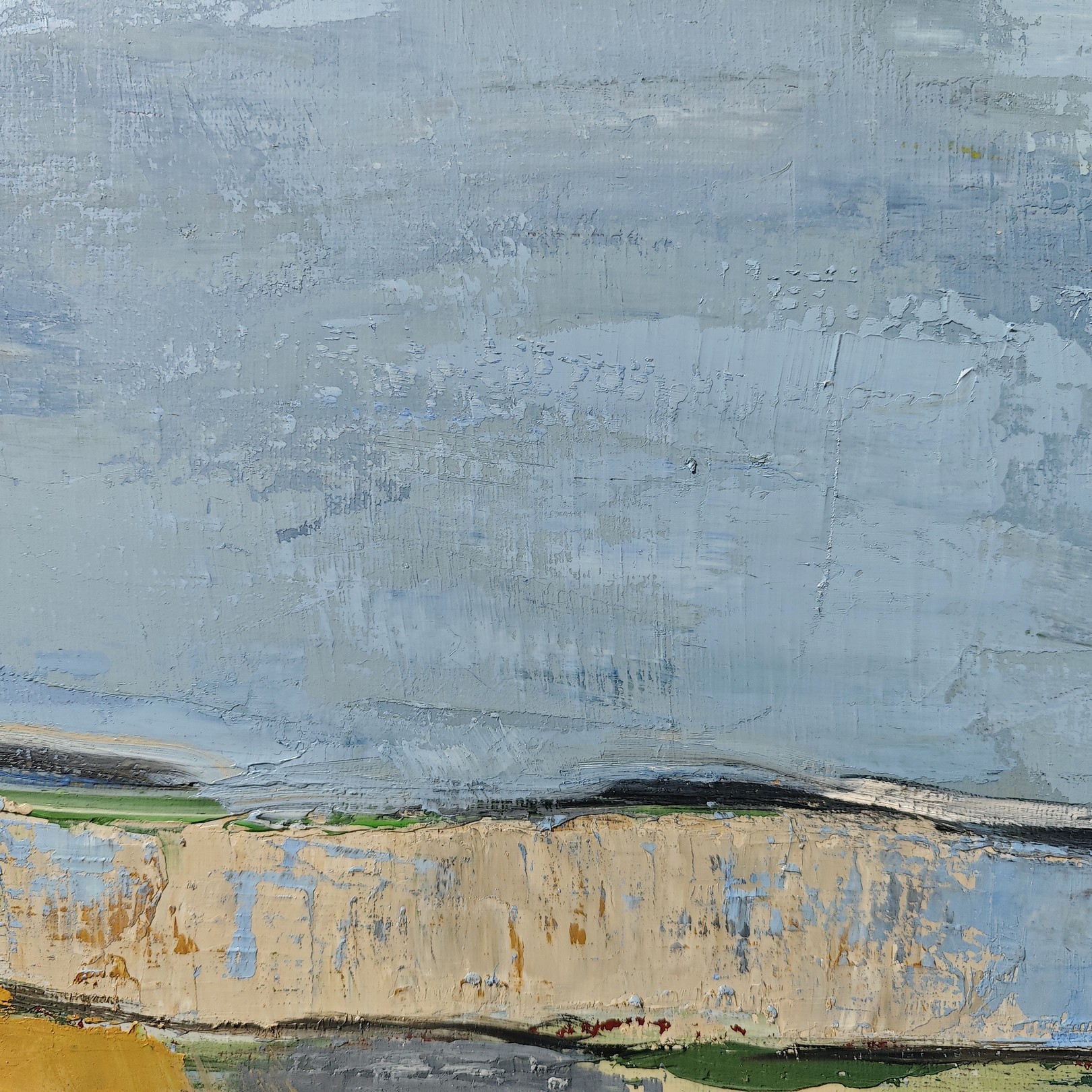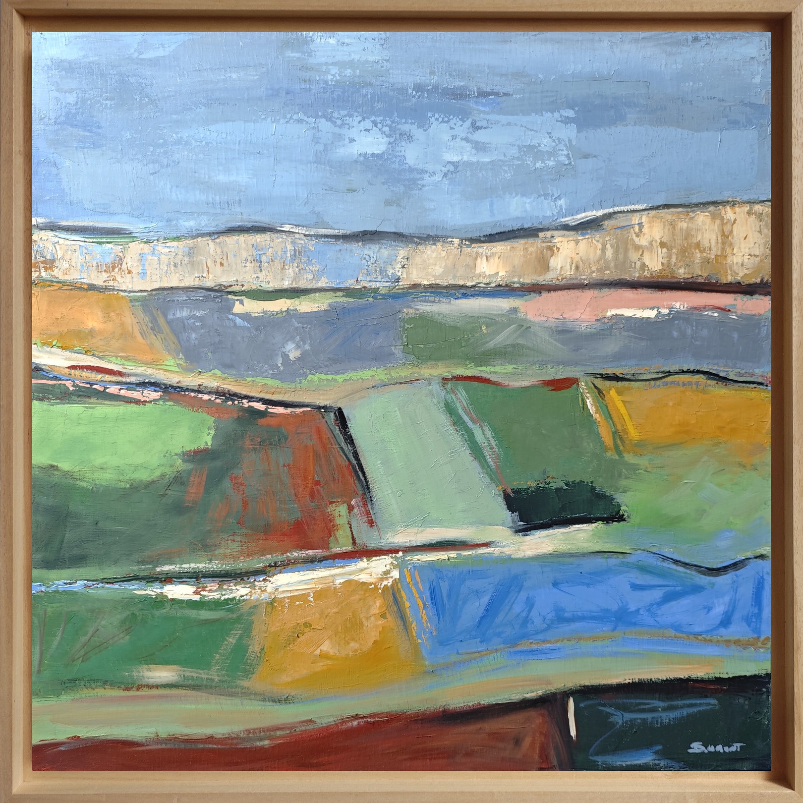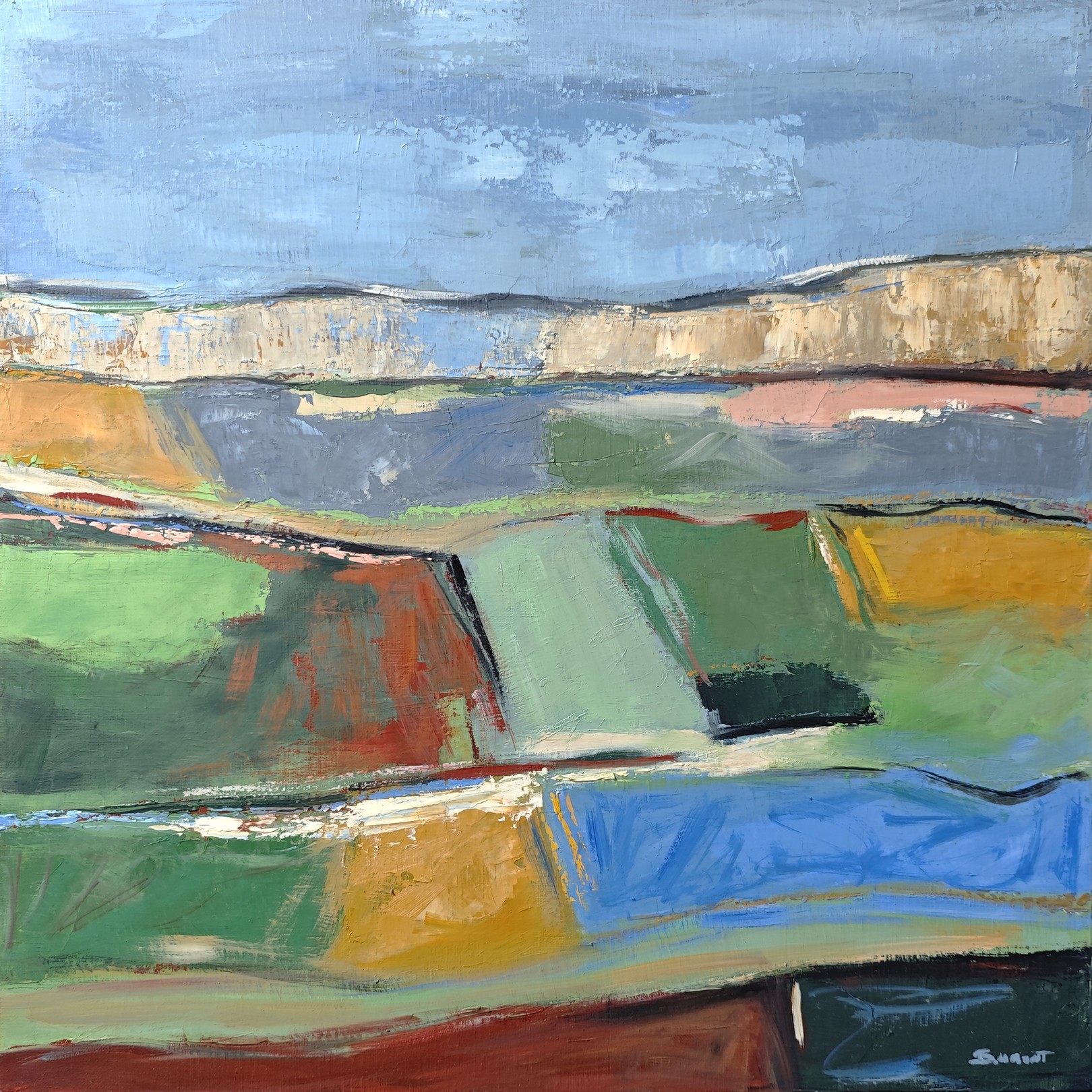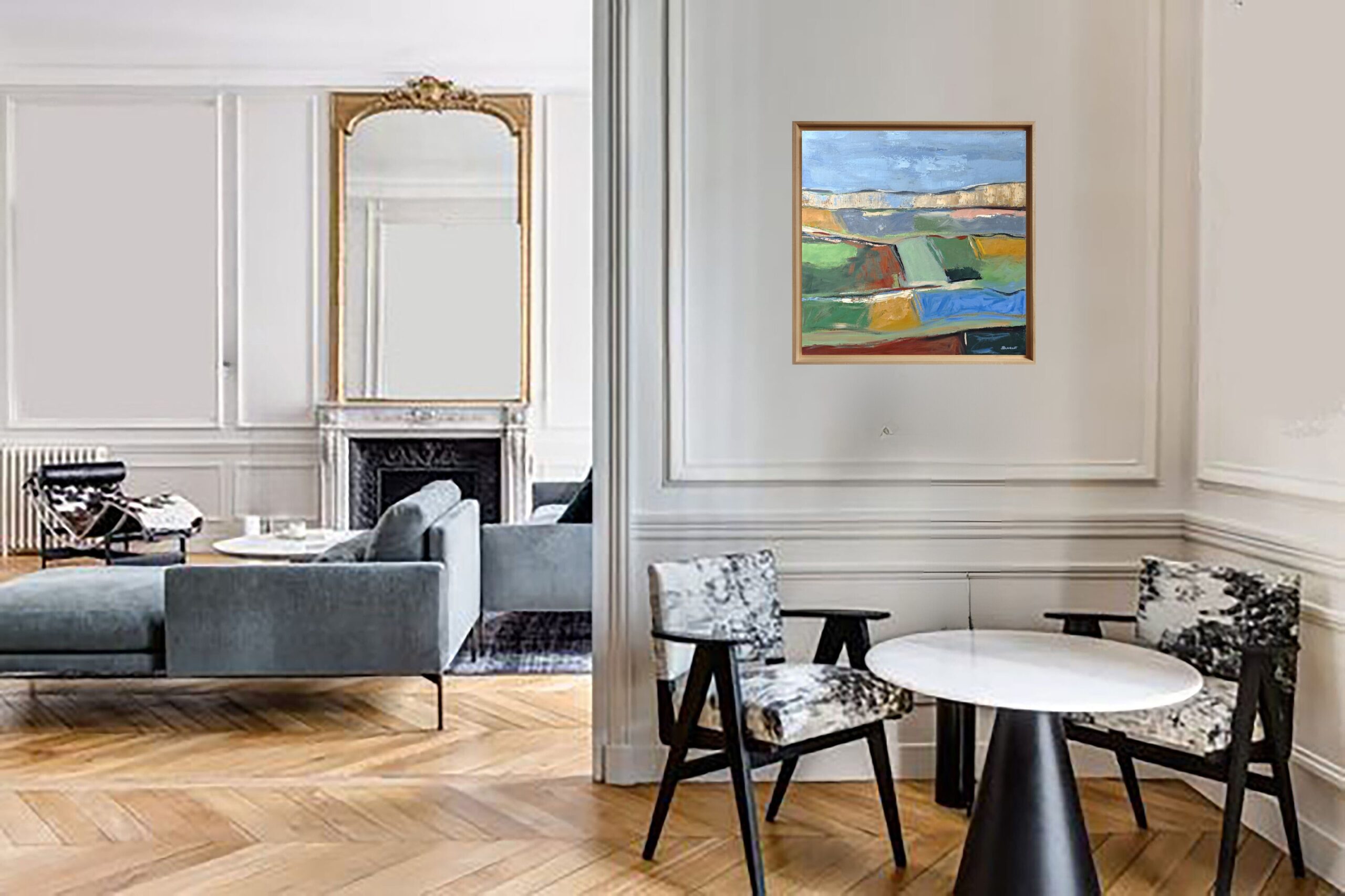 Far from being a simple representation of a territory, Rhapsodie Colorée invites a sensory reading of the landscape. The contrasts between marked lines and more blurred areas suggest a nature in perpetual mutation, capturing a fleeting moment where light and matter interact harmoniously. The sky, soothing in its shades of grayish blue, serves as a counterpoint to the intensity of the earth’s colors, like a breath suspended before the storm or after the clearing.