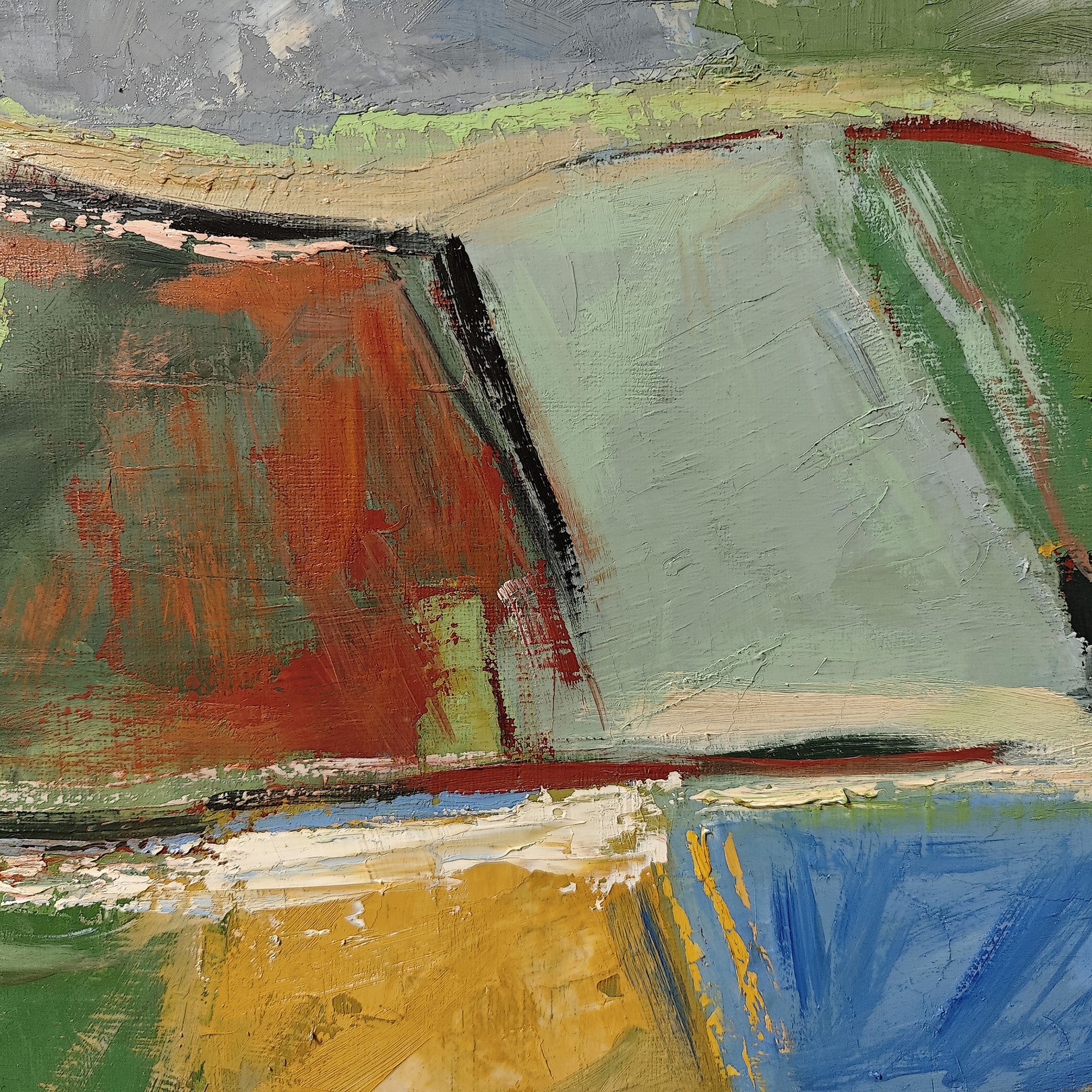 The pictorial space is structured by fragmented geometric shapes, evoking plots of land, mosaic fields, and reliefs sculpted by time. Warm tones—ochres, reds, and yellows—blend with deep greens and touches of blue, establishing a subtle chromatic dialogue between energy and tranquility. The texture, achieved through assertive knife work, reinforces this impression of relief and movement, giving the canvas an almost tactile materiality.