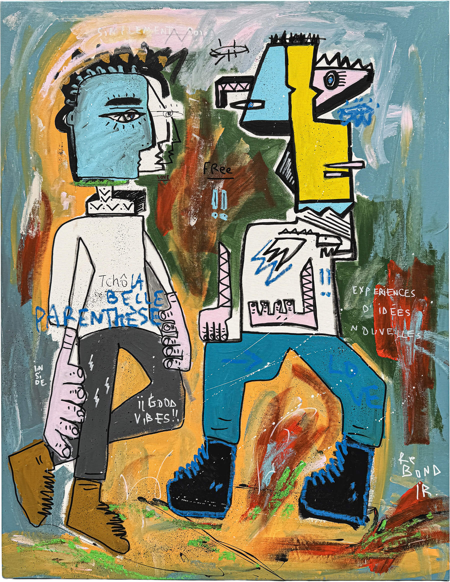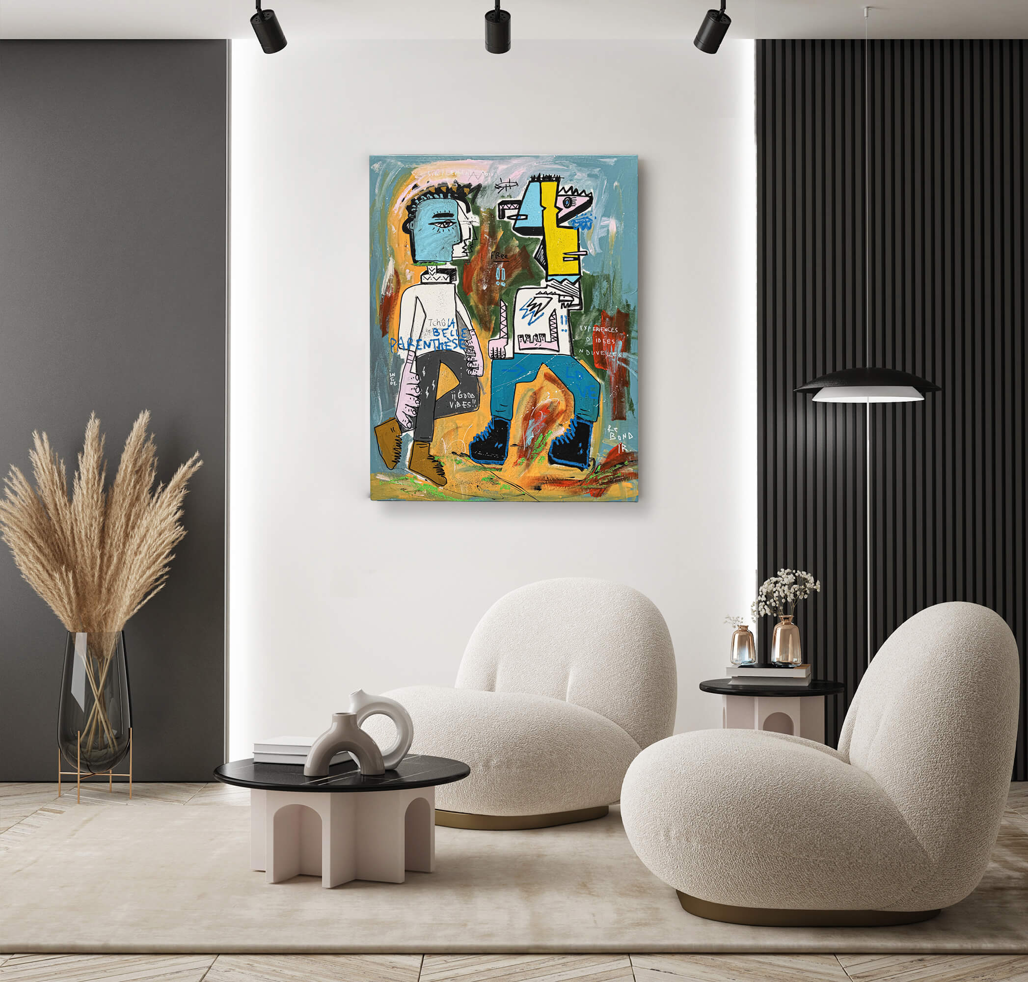 This artwork, reminiscent of neo-expressionism, features two stylized, abstract figures that command attention with their bold, fragmented forms and vivid colors. The figure on the left, with a blue-toned face and black spiked hair, contrasts strikingly against its counterpart’s yellow and blue visage on the right. The artist skillfully utilizes exaggerated features and expressive outlines, imbuing each character with a raw, emotive presence. The background, a whirlwind of earthy tones blended with greens and blues, enhances the piece’s dynamic energy. Graffiti-like text and symbols are interspersed throughout, adding layers of meaning and urban flair. The juxtaposition of rigid angles with swirling backgrounds creates a sense of tension and movement, inviting viewers to explore themes of identity and modern life’s complexities. The piece’s assertive style evokes introspection and conversation, making it an engaging focal point in contemporary art discussions.