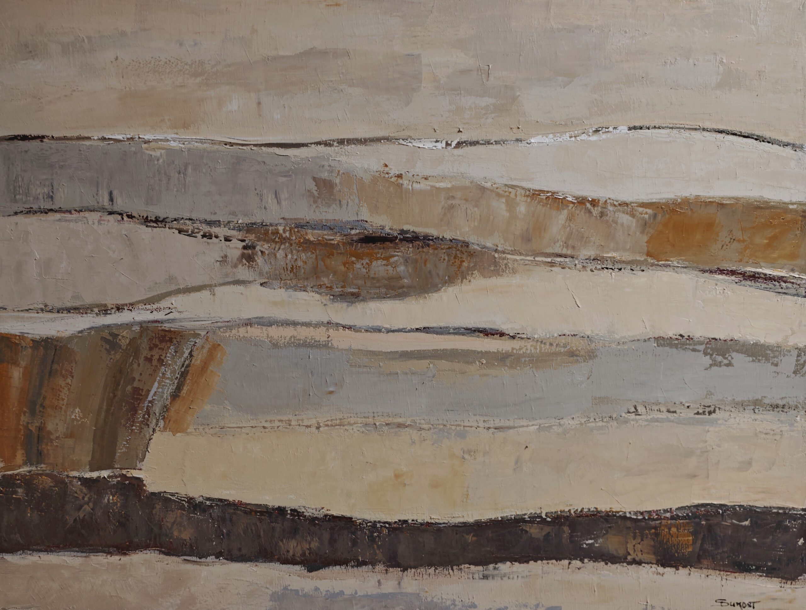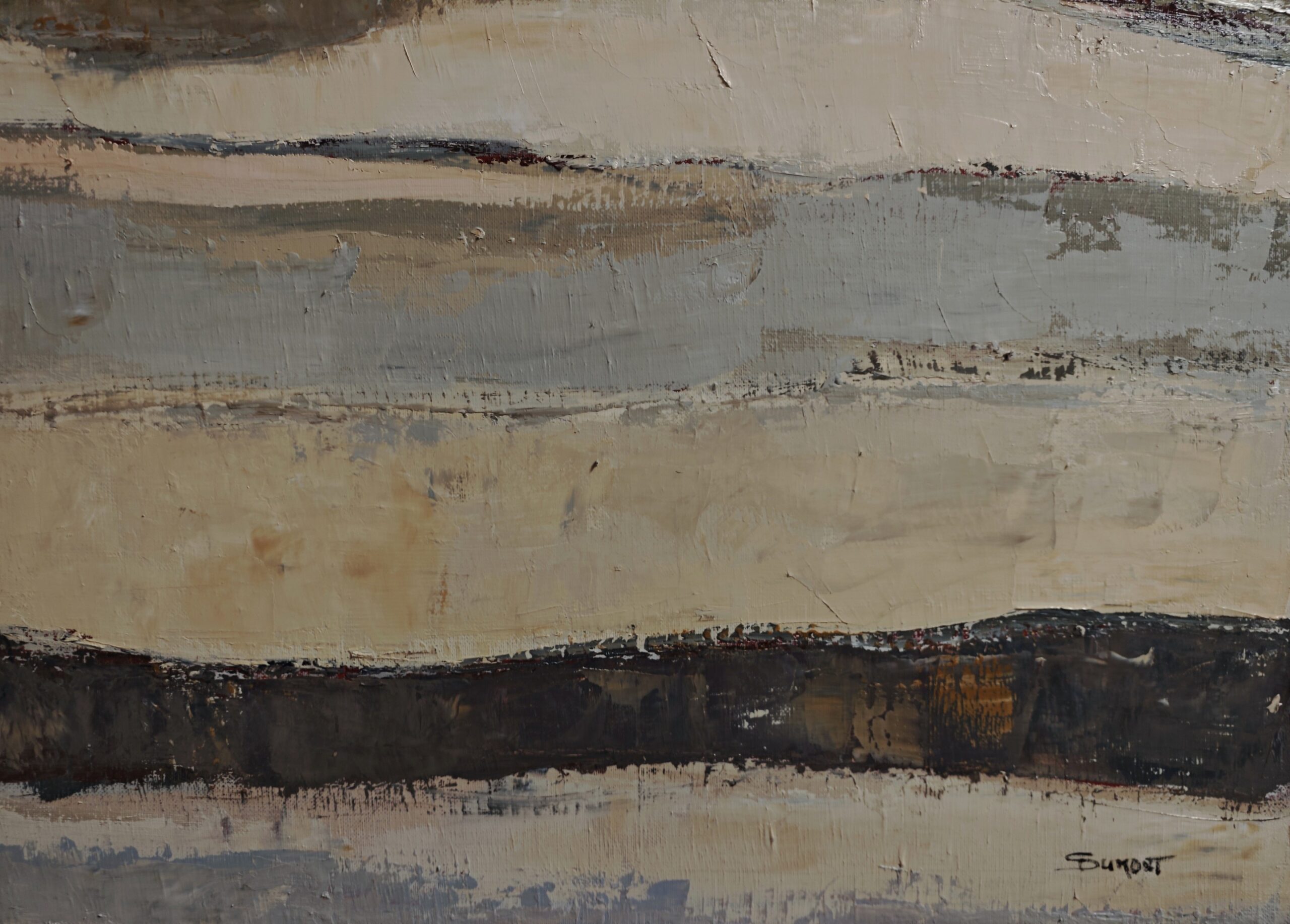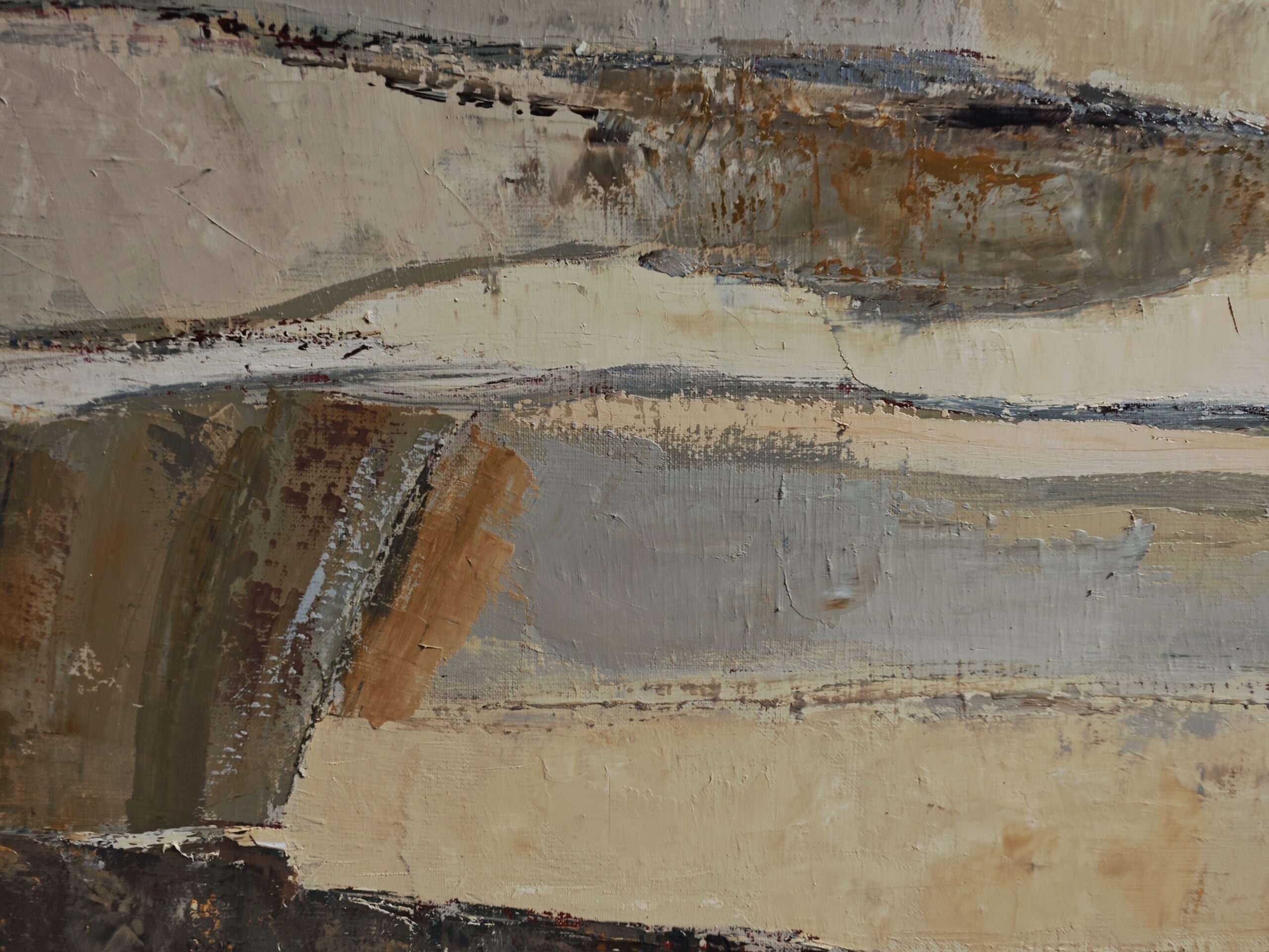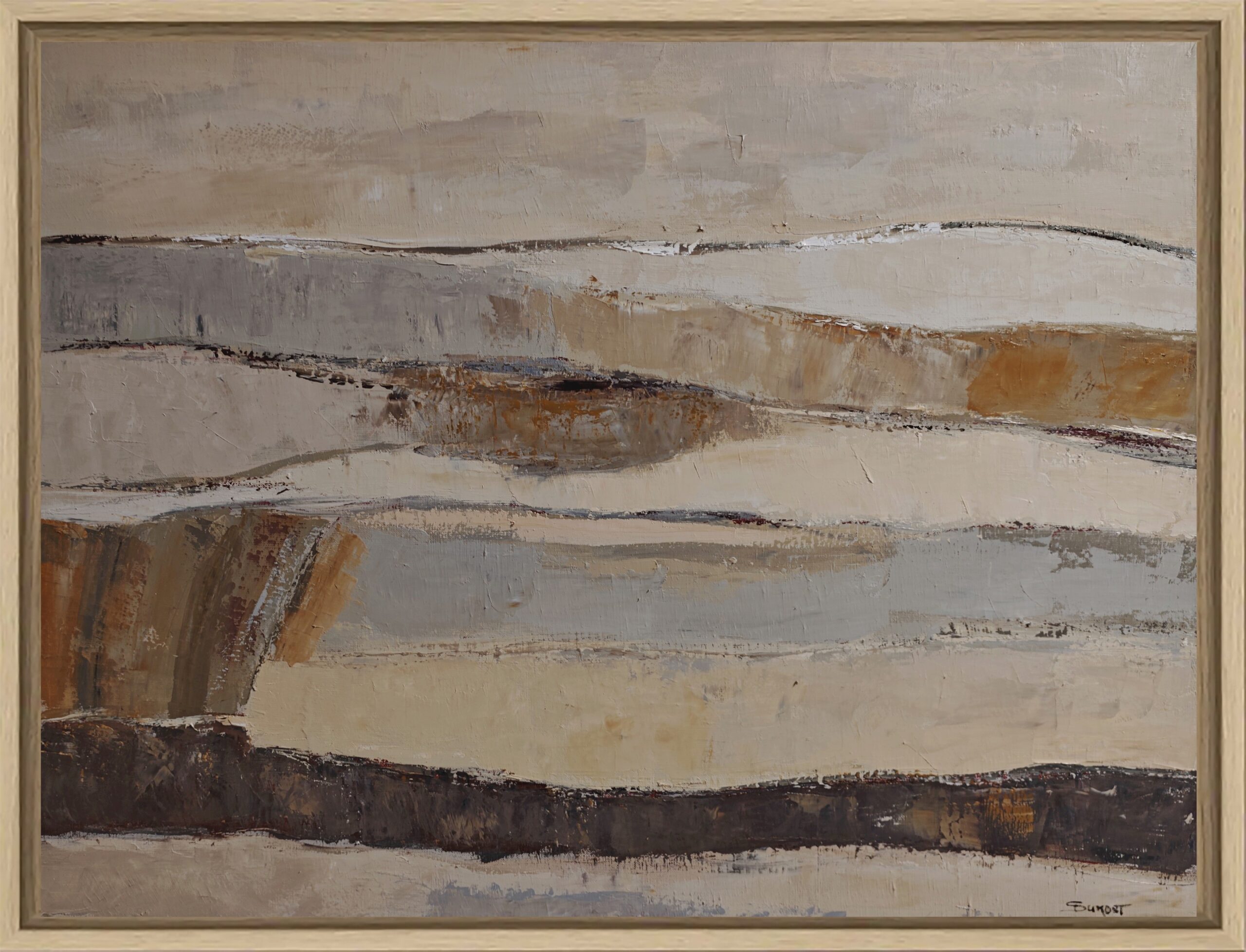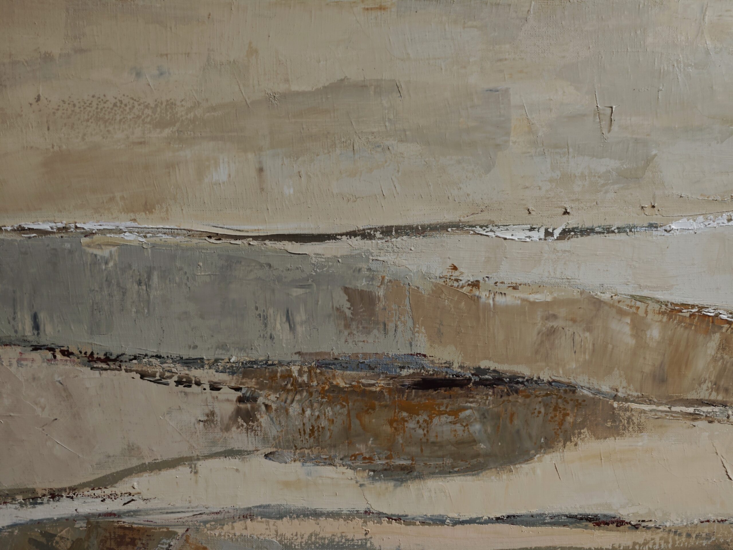 Worked with a palette knife in his Normandy studio, the canvas is distinguished by its exceptional textural richness. The generous impasto creates a sculptural relief where light plays with the texture’s asperities, evoking geological strata and the slow sedimentation of time. The palette, a sophisticated dialogue between mineral grays, warm ochres, and deep earthy tones, is anchored by a dark horizon line that lends the work a monumental balance.