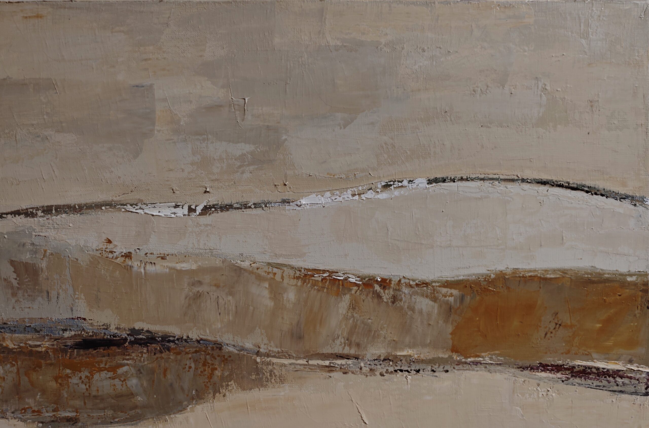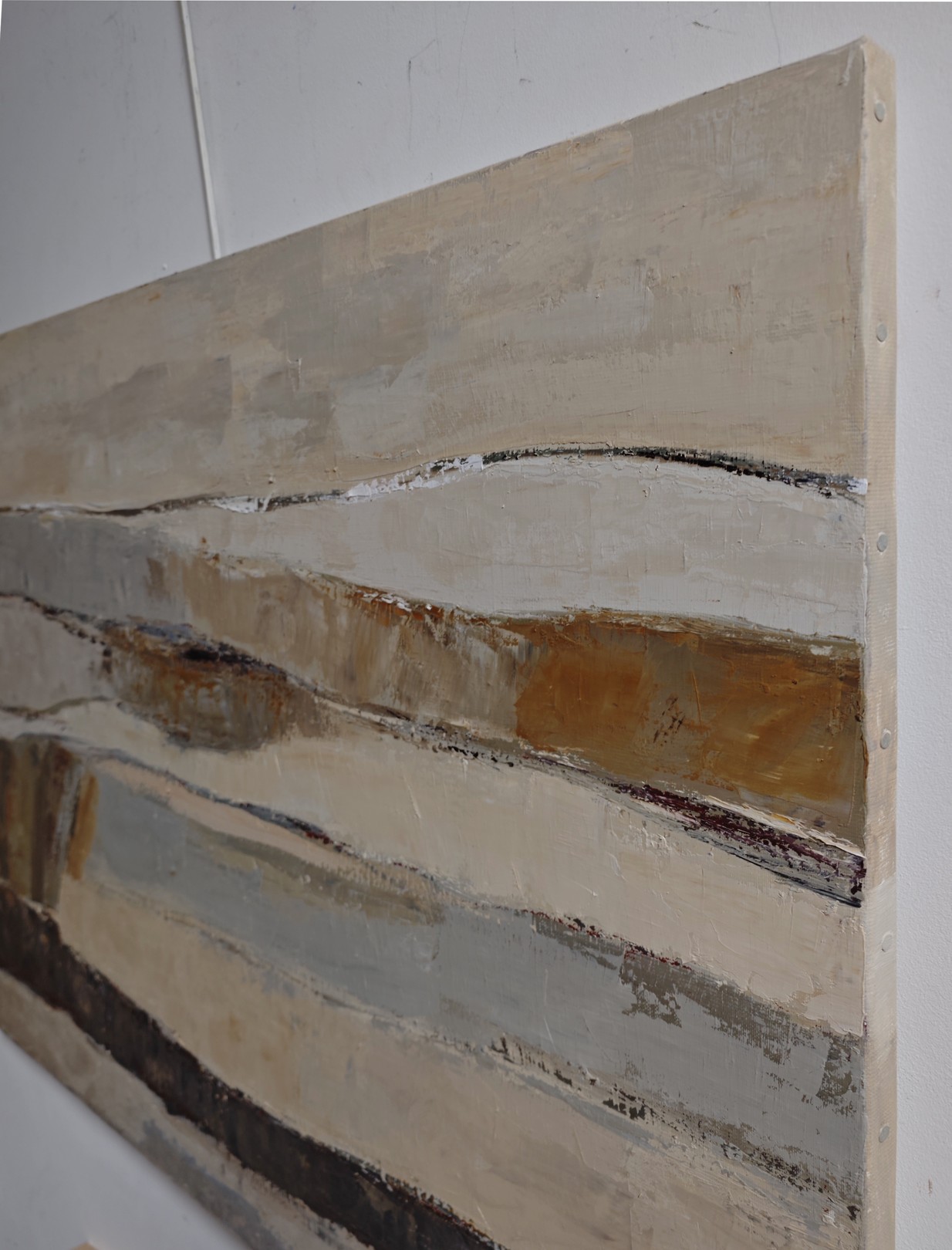 Sedimentations of Dawn is a masterful work by Sophie Dumont, perfectly illustrating her approach to the archaeology of memory. In this large-format composition, the artist explores the boundary between earth and sky, transforming the landscape into a structured and meditative architecture.
