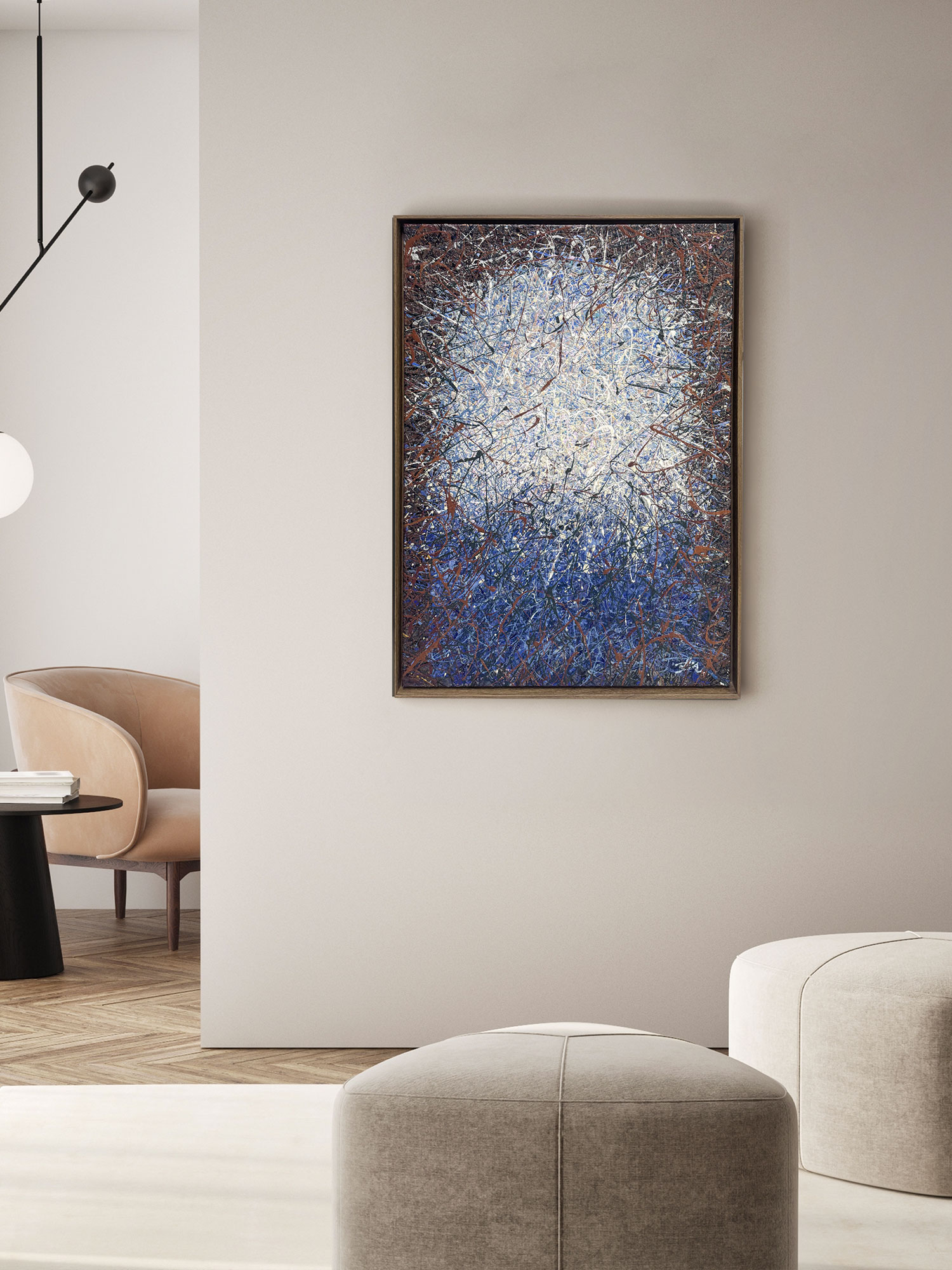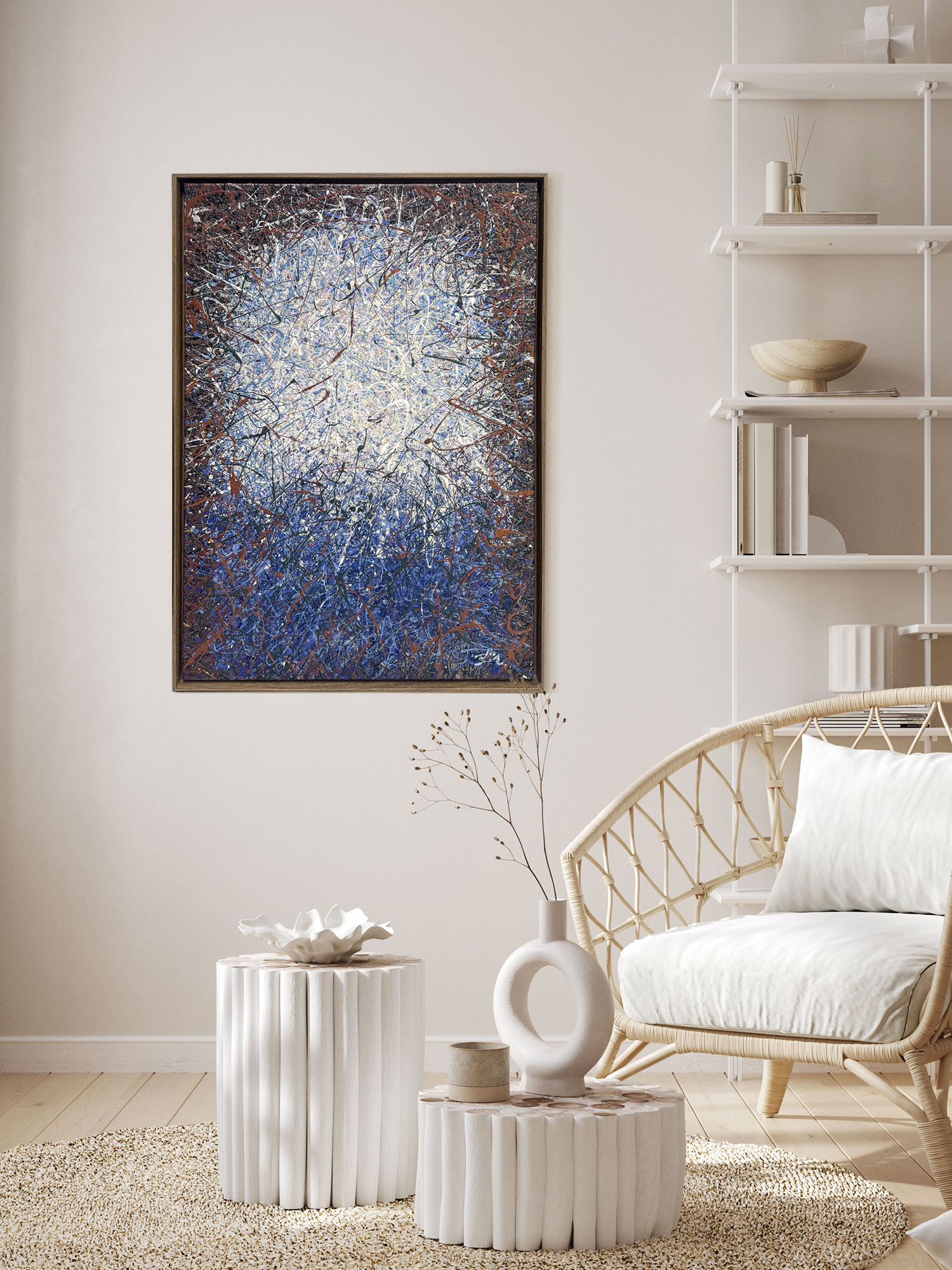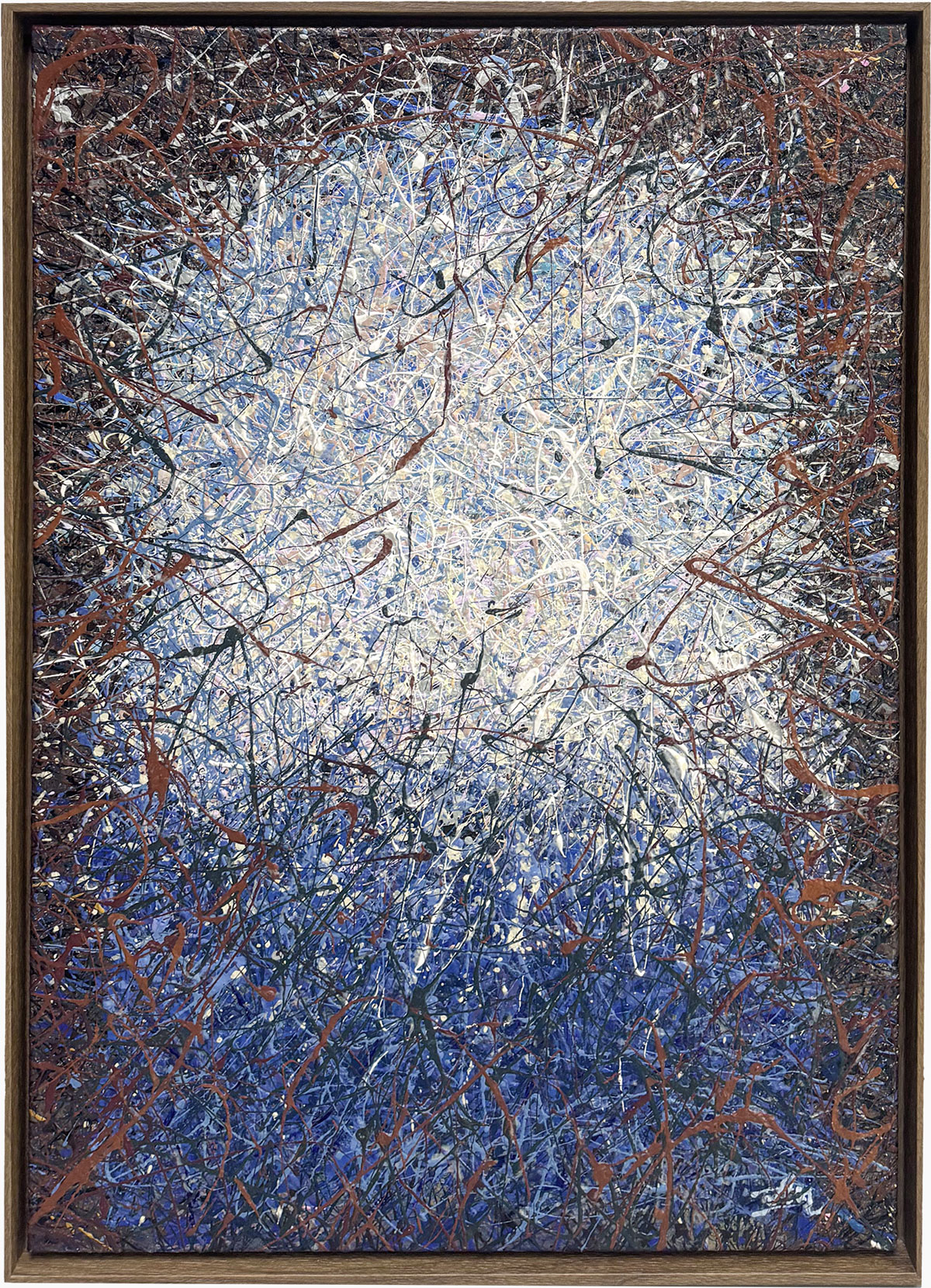 Dit kunstwerk is een betoverende weergave van abstract expressionisme, gekenmerkt door het gedurfde kleurgebruik en de dynamische compositie. Centraal in het werk staat een stralende uitbarsting van wit en lichtblauw, vakkundig verweven met krachtige spatten van donkerder blauw, bruin en zwart. De kunstenaar gebruikt een druiptechniek die een gevoel van beweging en energie oproept en de kijker meesleept in een wervelende draaikolk van kleuren. De confrontatie van het heldere middengebied met de diepere, chaotische randen creëert een fascinerend contrast dat diepte en driedimensionaliteit suggereert. Dit samenspel van licht en donker, orde en chaos, geeft het kunstwerk een boeiende en tot nadenken stemmende kwaliteit. Het ingewikkelde web van kruisende lijnen en lagen nodigt uit tot langer kijken en onthult bij elke blik nieuwe details. Het werk valt op door de dynamische textuur en het suggestieve kleurgebruik.