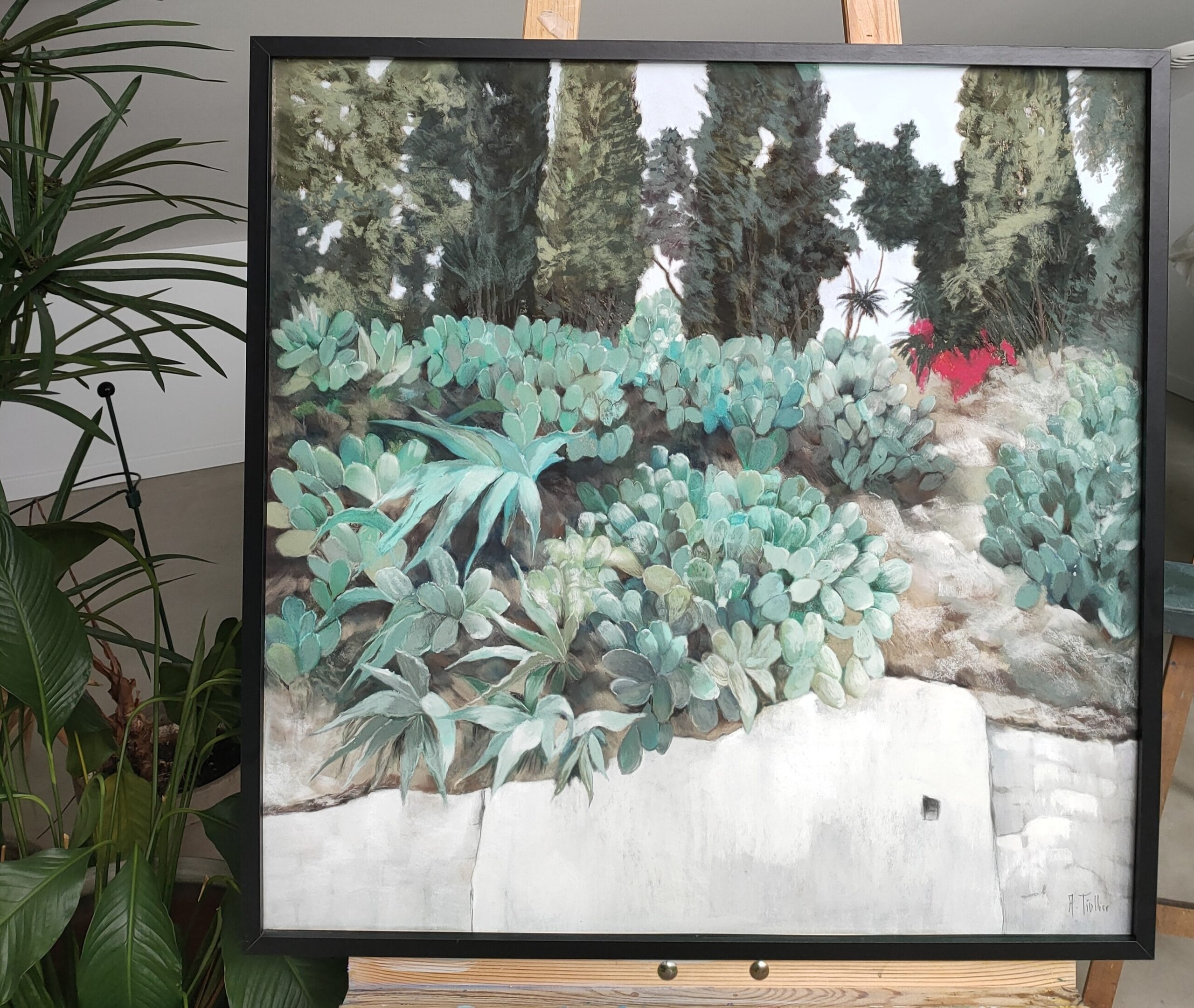 This work enchants with its vibrant depiction of a Mediterranean landscape. In the foreground, a whitewashed stone wall contrasts with an abundance of lush vegetation. Shades of green dominate, with varied foliage and succulents revealing rich and captivating textures. In the background, towering cypress trees stand, adding verticality and majestic depth to the composition. An unexpected burst of red catches the eye, breaking the monochrome harmony and infusing vibrant energy. The painting technique emphasizes delicate precision, capturing the subtle interplay of light and shadow on each leaf. This painting evokes an atmosphere of serenity and escape, while highlighting the richness and diversity of Mediterranean natural landscapes. A composition that transports the viewer to a refuge of calm and timeless beauty.