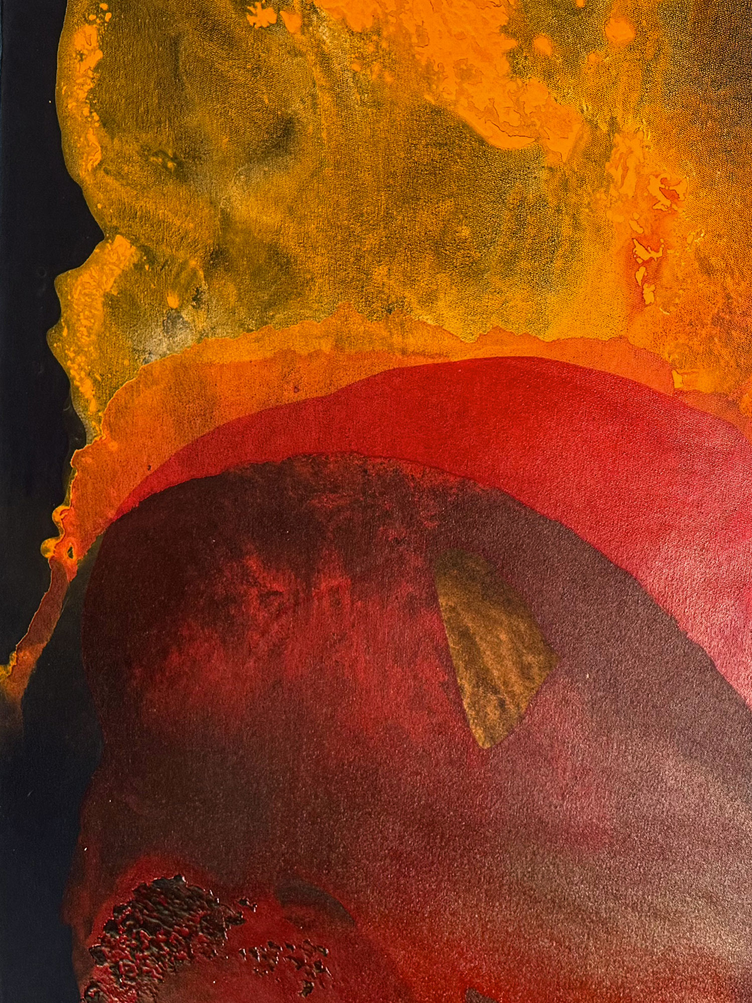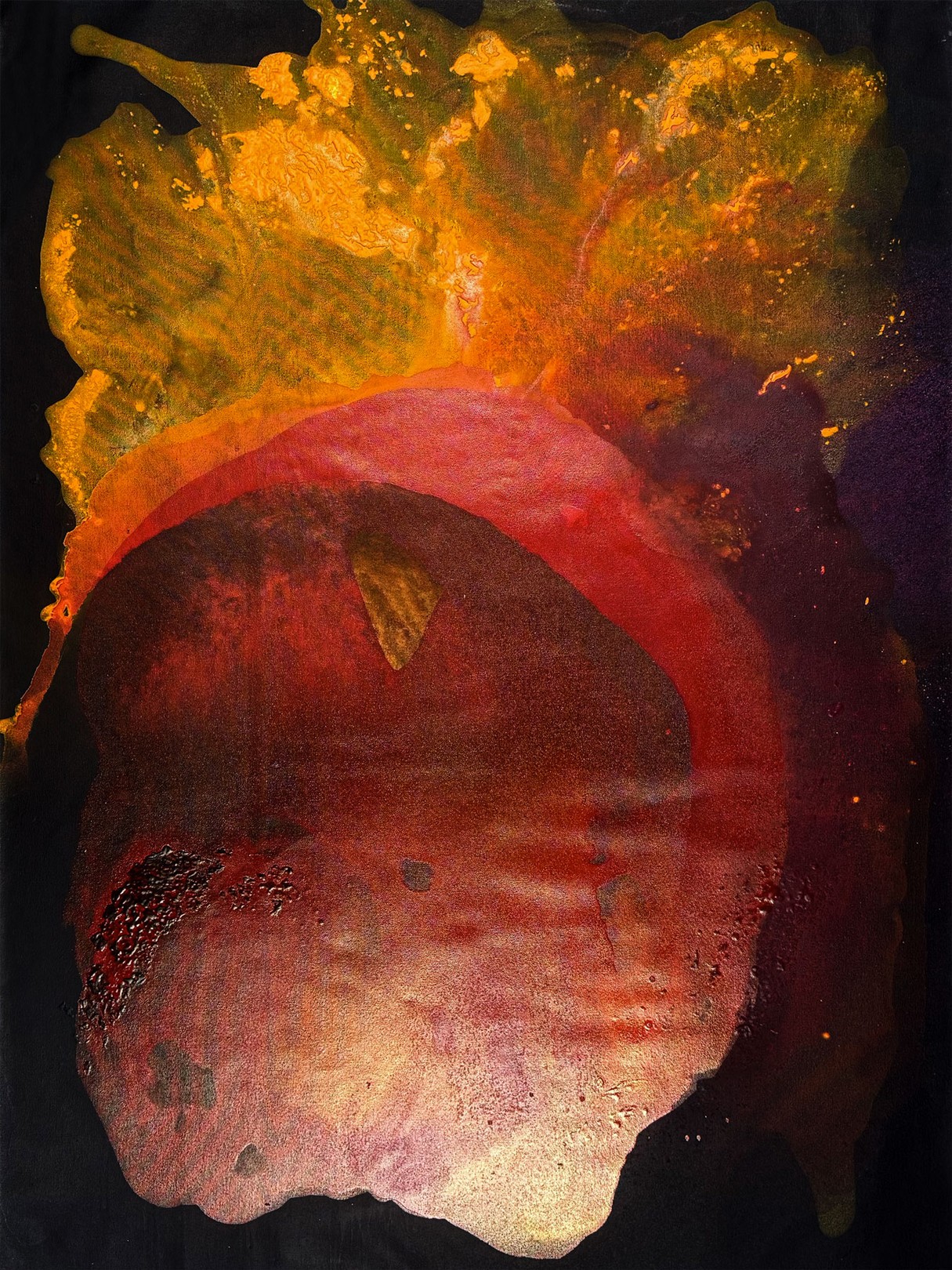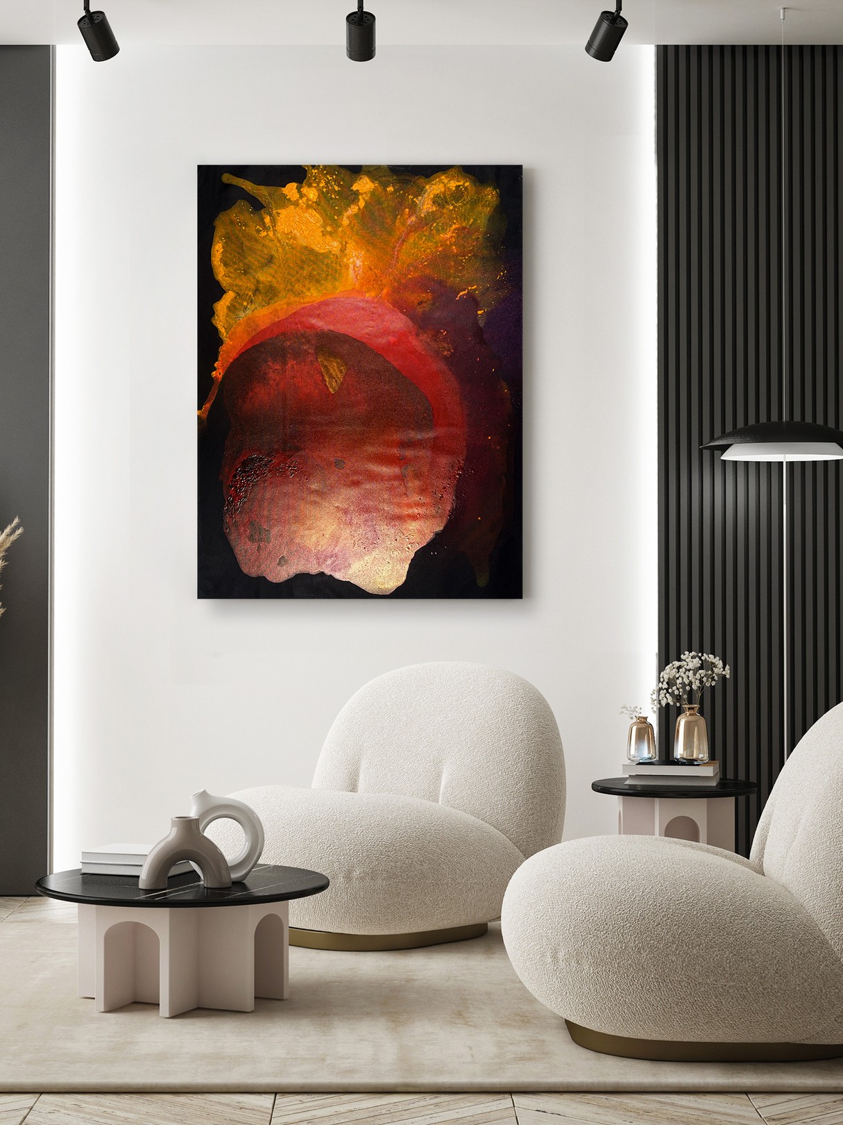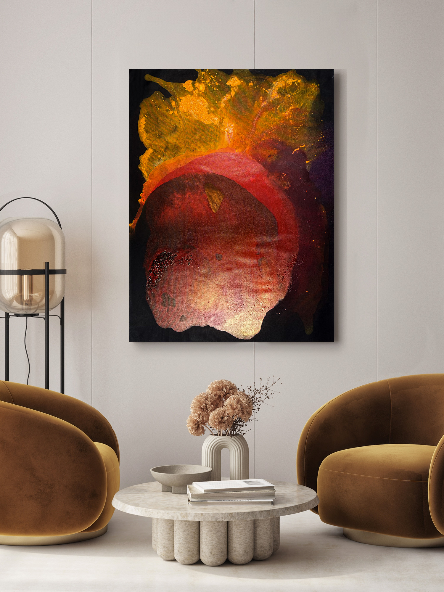 Dit fascinerende kunstwerk presenteert een dynamische fusie van levendige kleuren en vloeiende vormen, waardoor een intense visuele ervaring ontstaat. De compositie wordt gedomineerd door een vurig spectrum van rode en oranje kleuren, die een gevoel van warmte en energie oproepen. Het middelpunt, een organische vorm die lijkt op een krachtige penseelstreek, vloeit moeiteloos en suggereert beweging en transformatie. Rondom deze vorm mengen rijke gouden tinten zich naadloos met diepe paarse tinten die diepte en complexiteit toevoegen. Elke kleurlaag lijkt te pulseren van leven en trekt het oog van de kijker de diepte in. De kunstenaar maakt vakkundig gebruik van contrasterende texturen, van vloeiende verlopen tot ingewikkelde details, wat de tactiele kwaliteit van het werk versterkt. Dit kunstwerk is een krachtige verkenning van kleurdynamiek en abstracte vormen en biedt een levendige en meeslepende ervaring die de grenzen van traditionele beeldende kunst verlegt. Het nodigt kijkers uit om de energetische essentie op een diep persoonlijk niveau te interpreteren en zich ermee te verbinden.