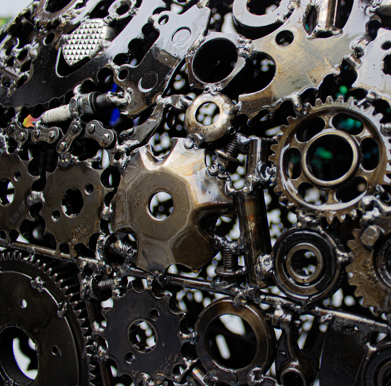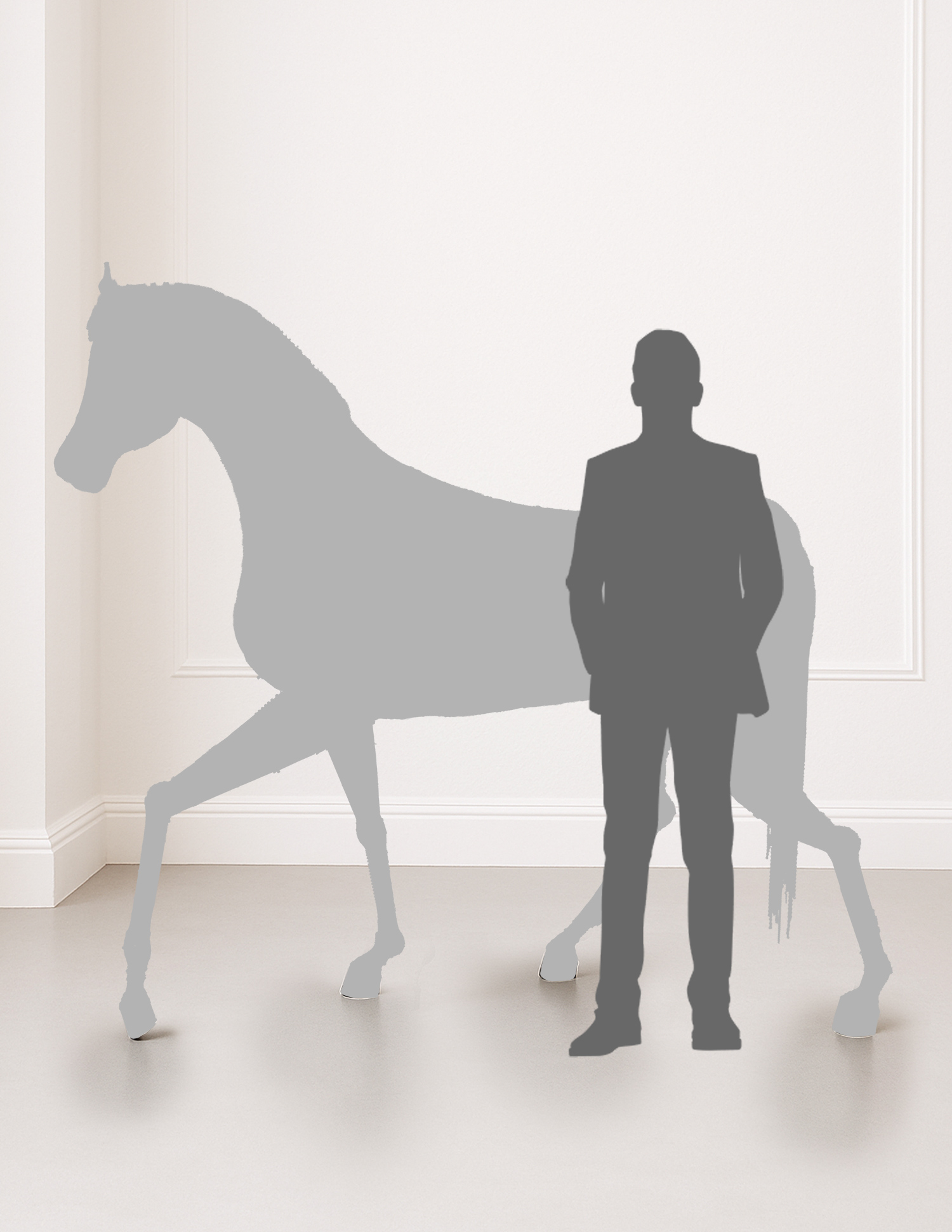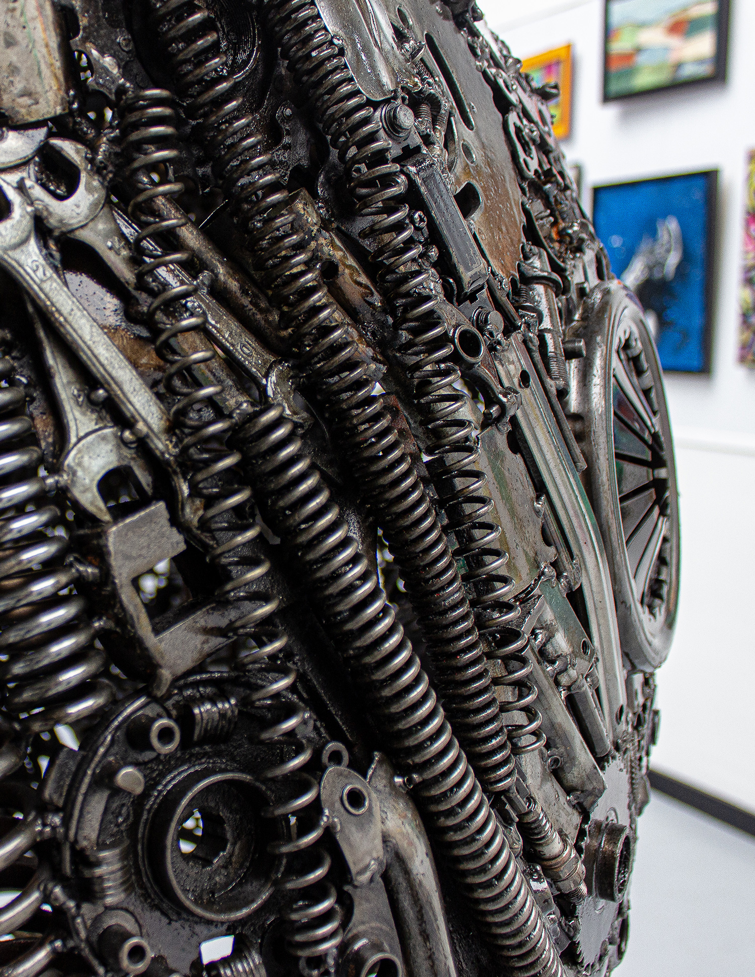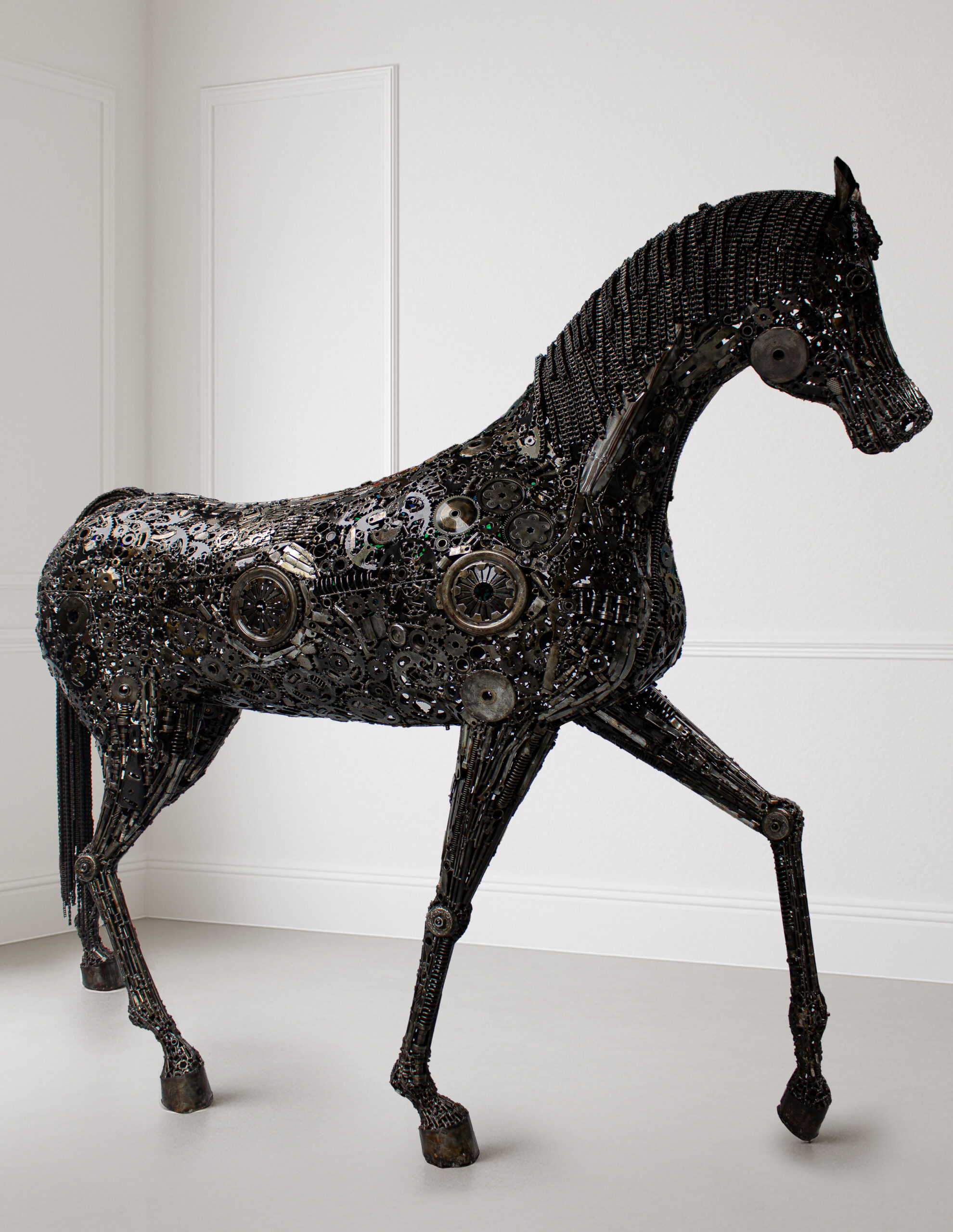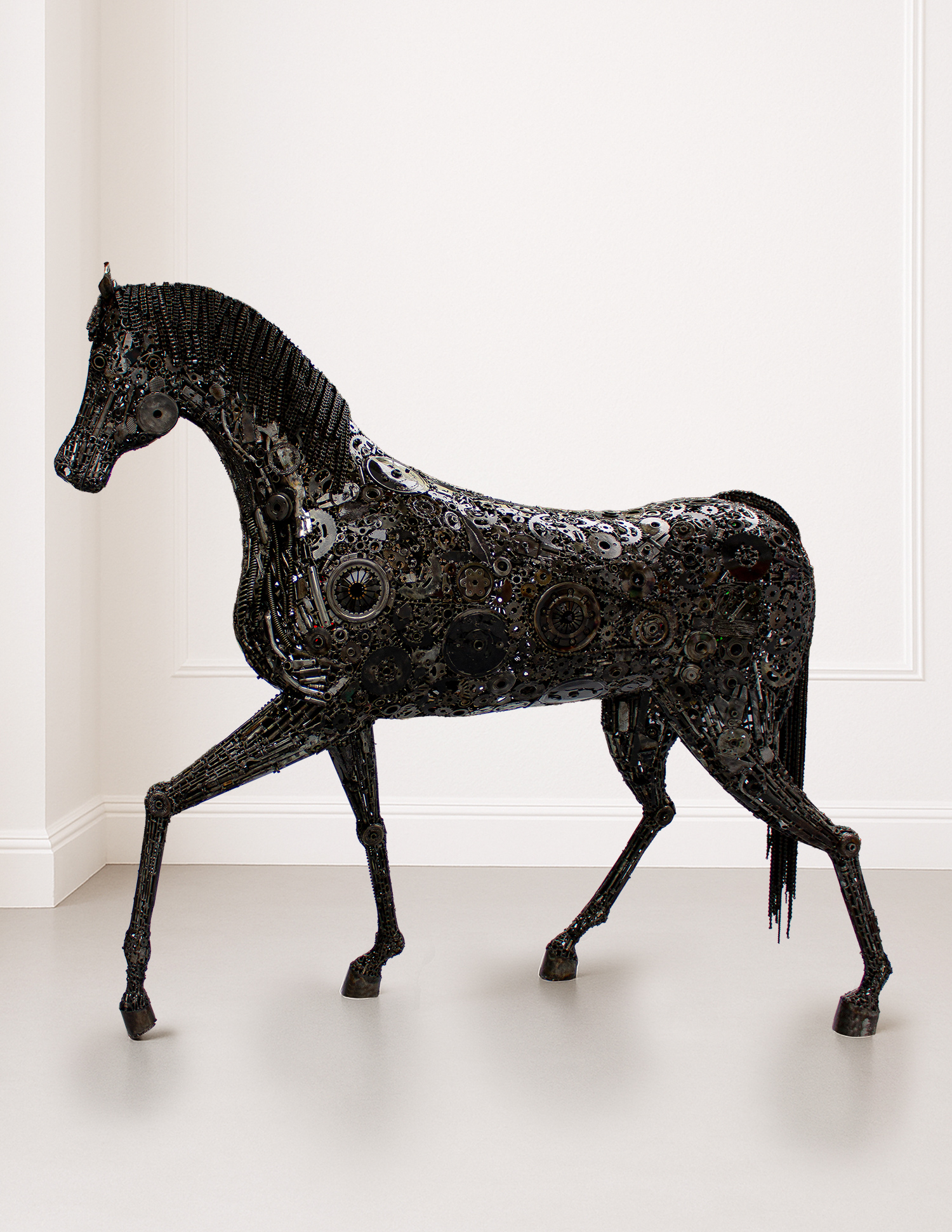 Het kunstwerk is volledig samengesteld uit zwart metalen gerecyclede onderdelen en integreert bouten, tandwielen en verschillende machineonderdelen. Het toont een harmonieuze mix van creativiteit en technisch kunnen. De kunstenaar heeft elk detail zorgvuldig bewerkt, van de krachtige houding van het paard tot de levensechte contouren van zijn anatomie. Het oppervlak van de sculptuur is een mozaïek van texturen die het licht weerkaatsen op een manier die de dynamische aanwezigheid van het stuk versterkt. De industriële elementen benadrukken een samensmelting van natuurlijke vorm en mechanische precisie, waardoor een meeslepende juxtapositie ontstaat. Dit unieke meesterwerk getuigt van het vermogen van de kunstenaar om gewone materialen te transformeren tot een buitengewone weergave van kracht en schoonheid, waardoor het een centraal punt wordt in elke ruimte.