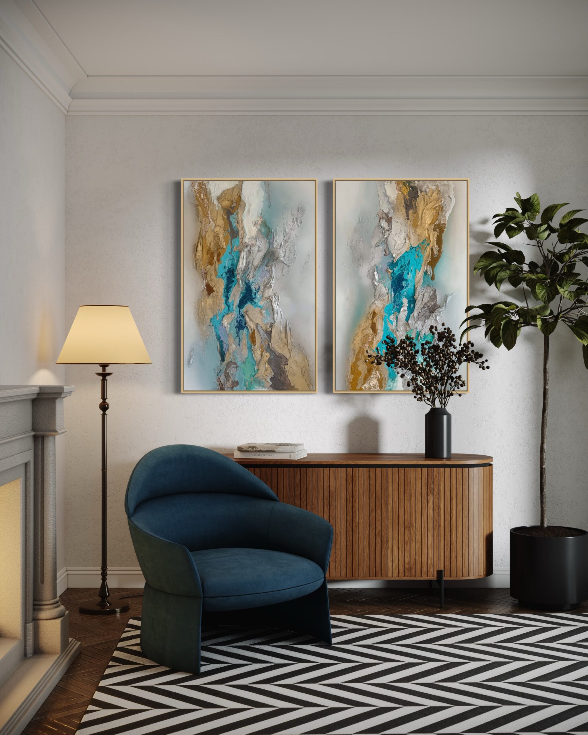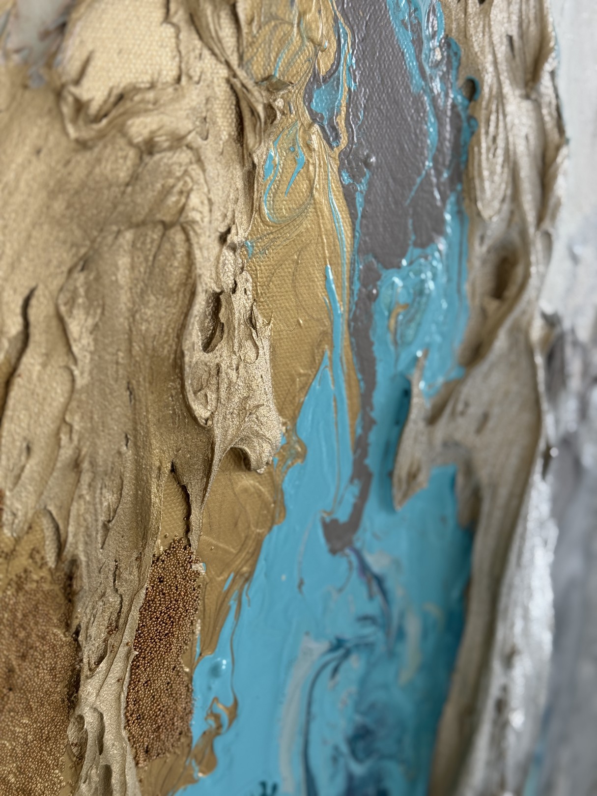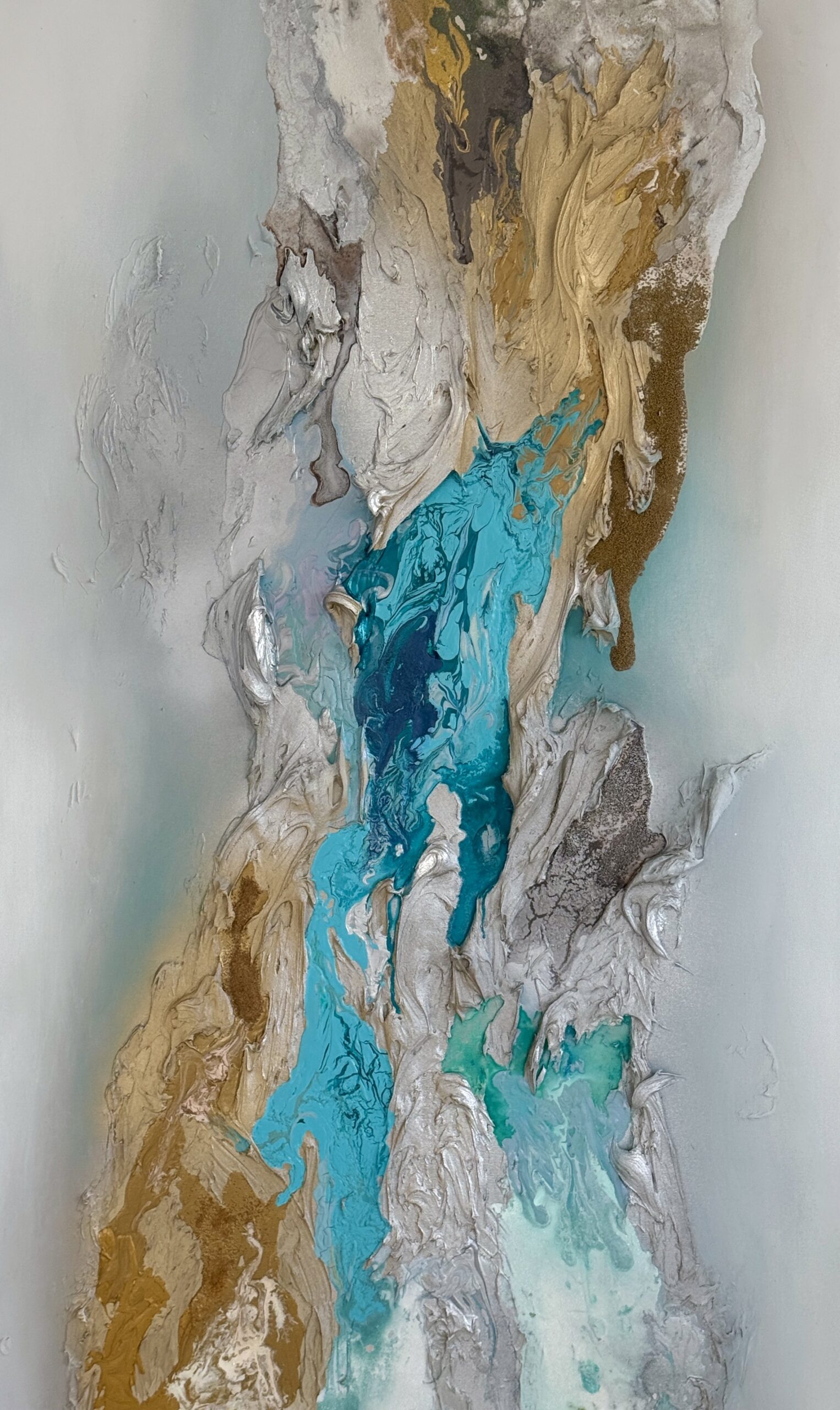 "Tidal Poetry" is een tweeluik dat de wisselwerking onderzoekt tussen gestructureerde zilveren, gouden en groenblauwe tinten met een vleugje blauw, waarin bladgoud is verwerkt om een boeiende, abstracte compositie te creëren. Deze serie gaat in op onze gevoeligheid voor de omgeving en presenteert een etherisch en introspectief landschap dat contrasteert met realisme. Door ruimte te laten voor persoonlijke interpretatie wil ik kijkers uitnodigen om hun eigen betekenis aan het kunstwerk te geven, zodat hun herinneringen en onuitgesproken gedachten zich met het werk kunnen verweven. Het resultaat is een open en verleidelijke compositie, boordevol charme en energie, die de essentie van mijn artistieke visie belichaamt.