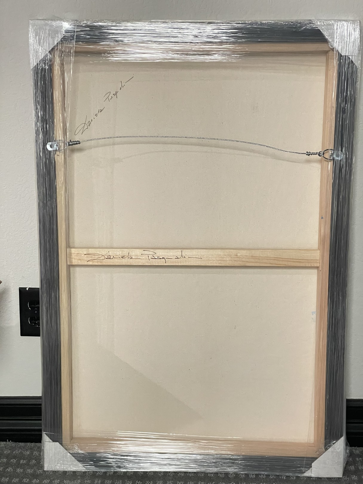 Het schilderij is gesigneerd op de voorkant en gedateerd met naam op de achterkant.
