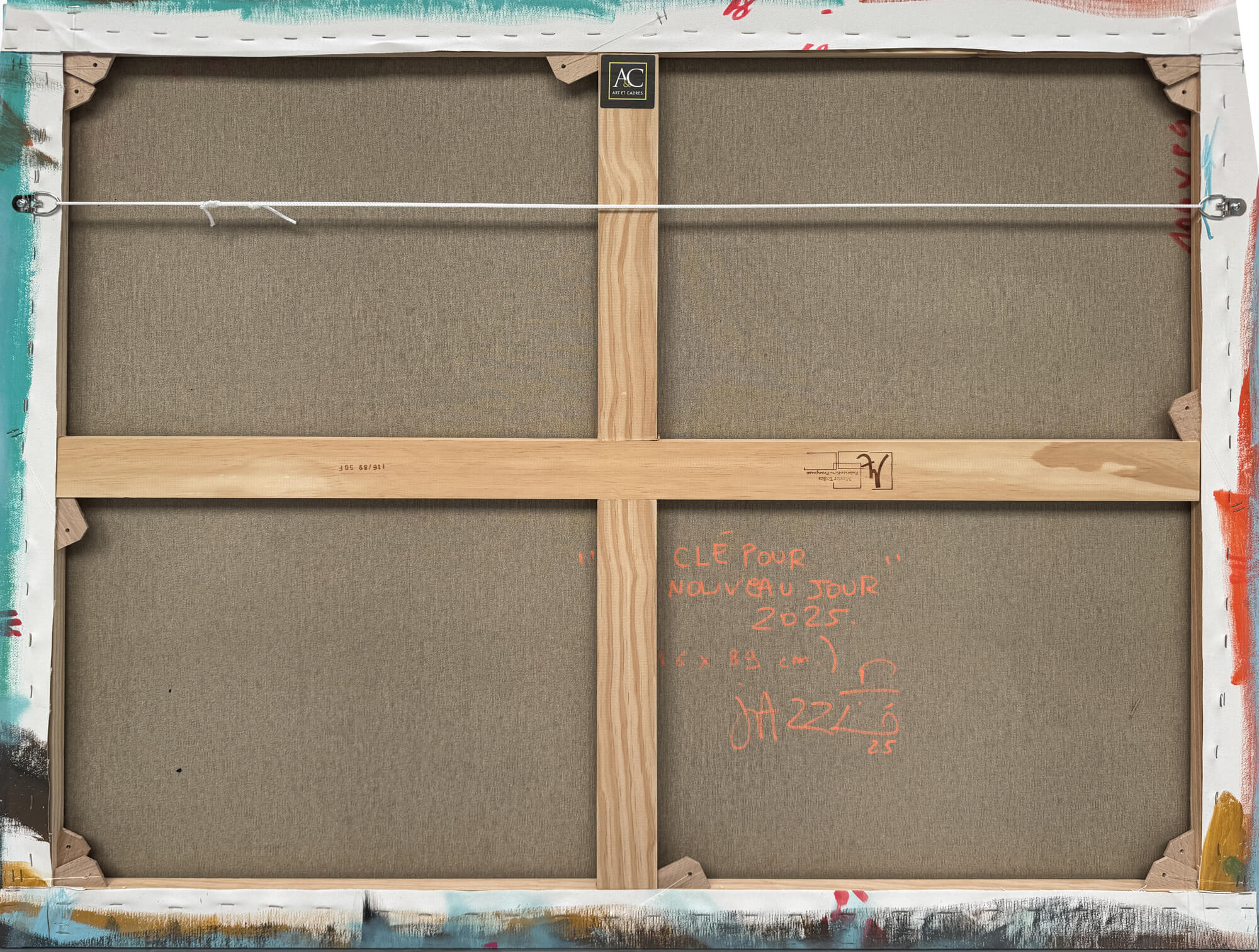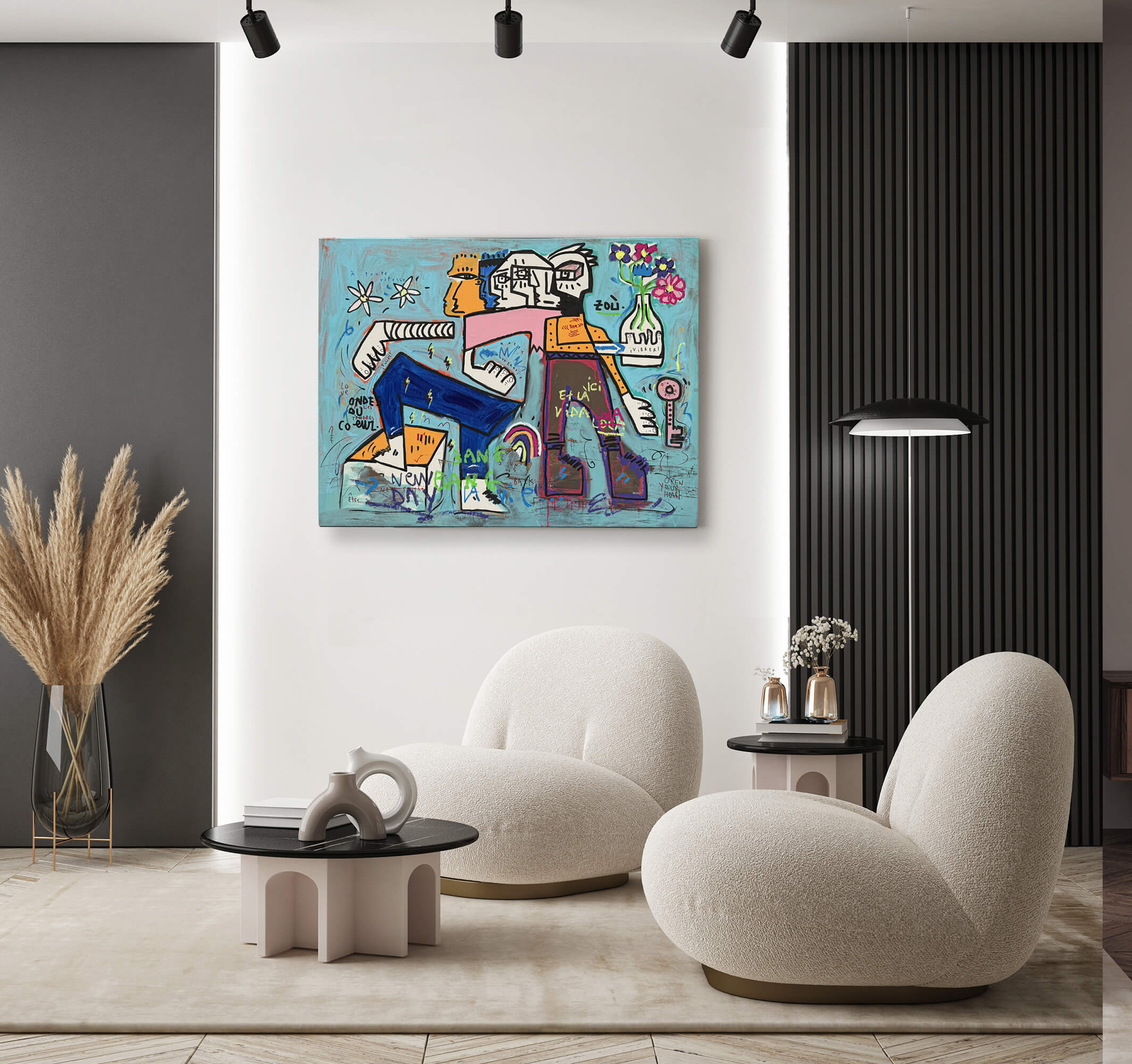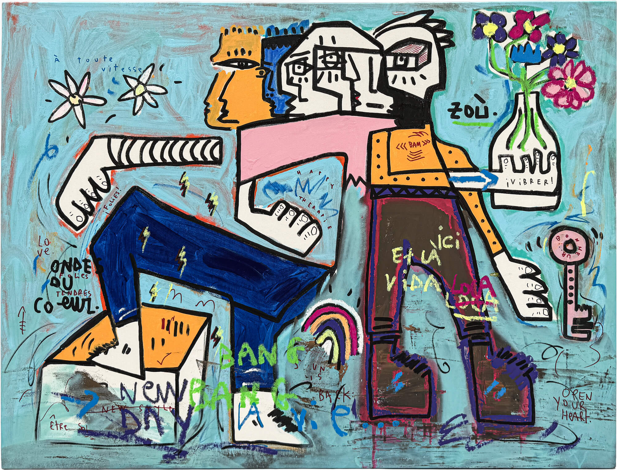 This vibrant artwork (Une clé pour un nouveau jour by Jazzu) masterfully blends abstract and figurative elements. The composition features interlocking human-like figures, rendered in bold black outlines. The artist employs a striking palette of blues, pinks, and oranges against a textured teal background. Additional elements include abstract symbols, stars, and flowers in a vase, adding depth and intrigue. Words and phrases, such as “ZOU” and “ET LA VIE,” are integrated seamlessly, inviting personal interpretation. The piece demonstrates a dynamic fusion of precise brushwork and spontaneous expression, resulting in a lively and thought-provoking visual narrative. It stands out for its ability to evoke emotion through vivid color contrasts and its playful yet profound exploration of human connection and identity.
