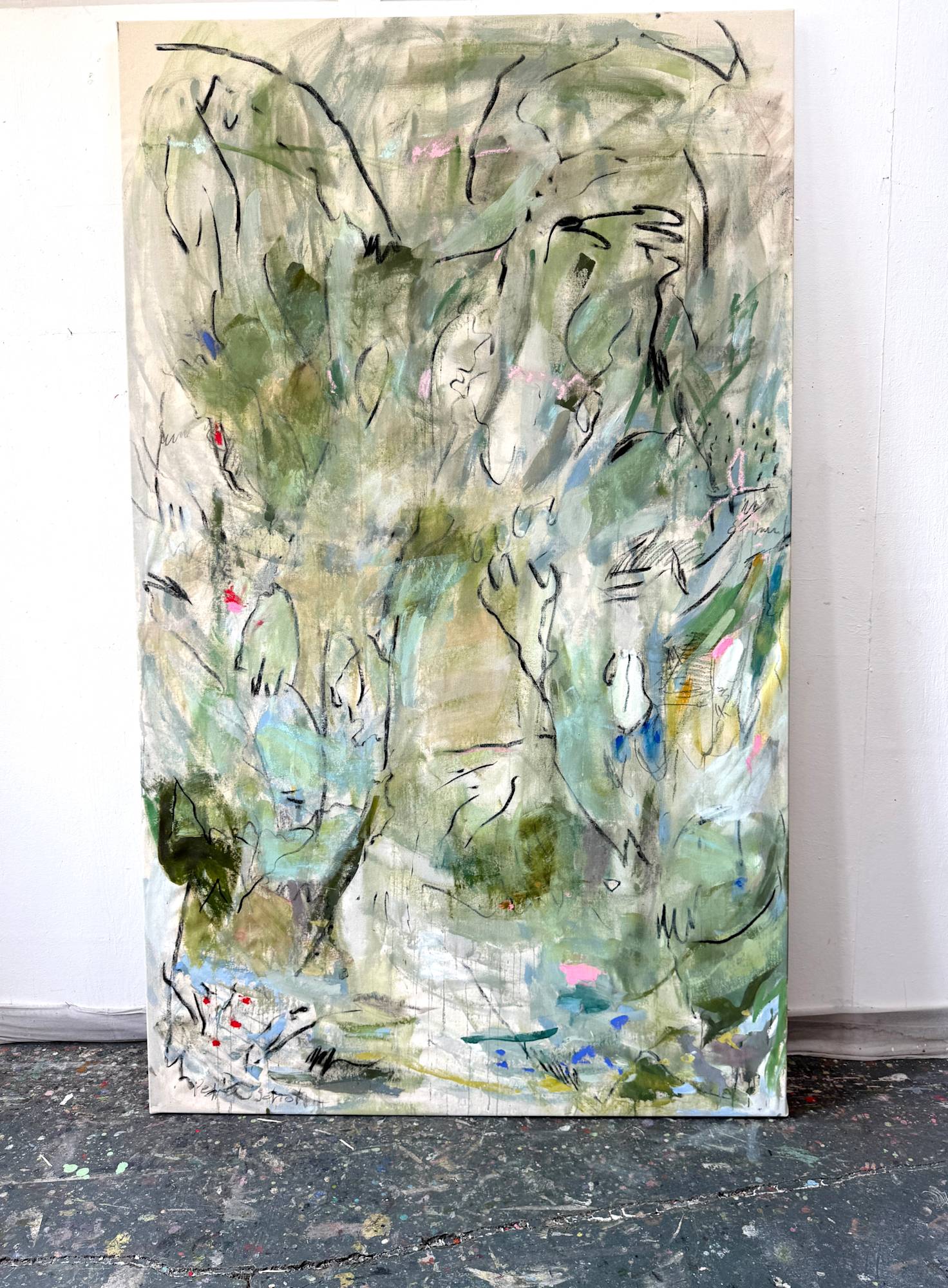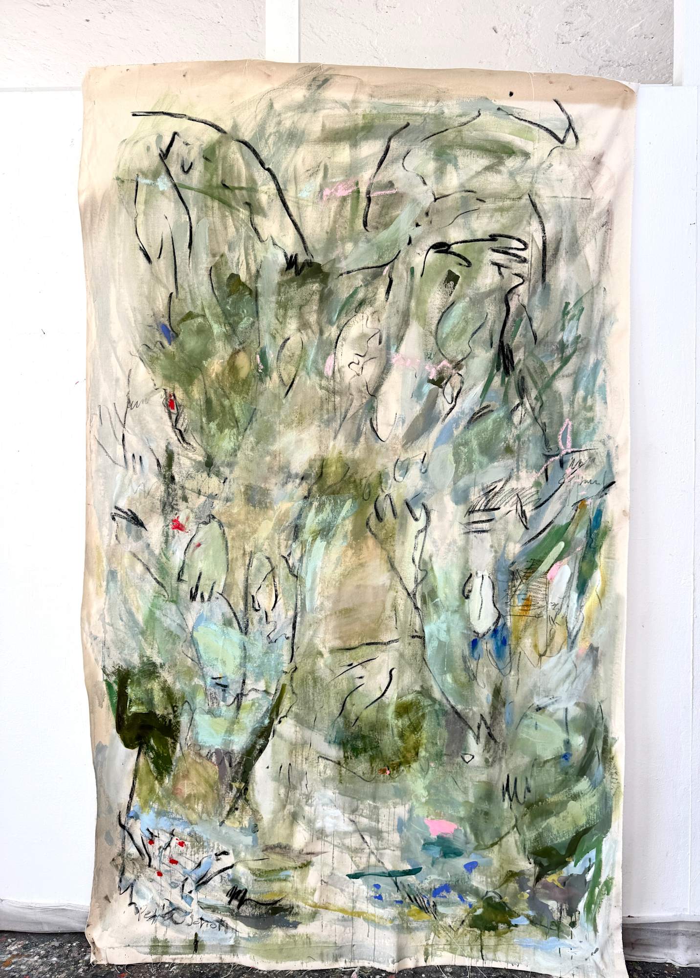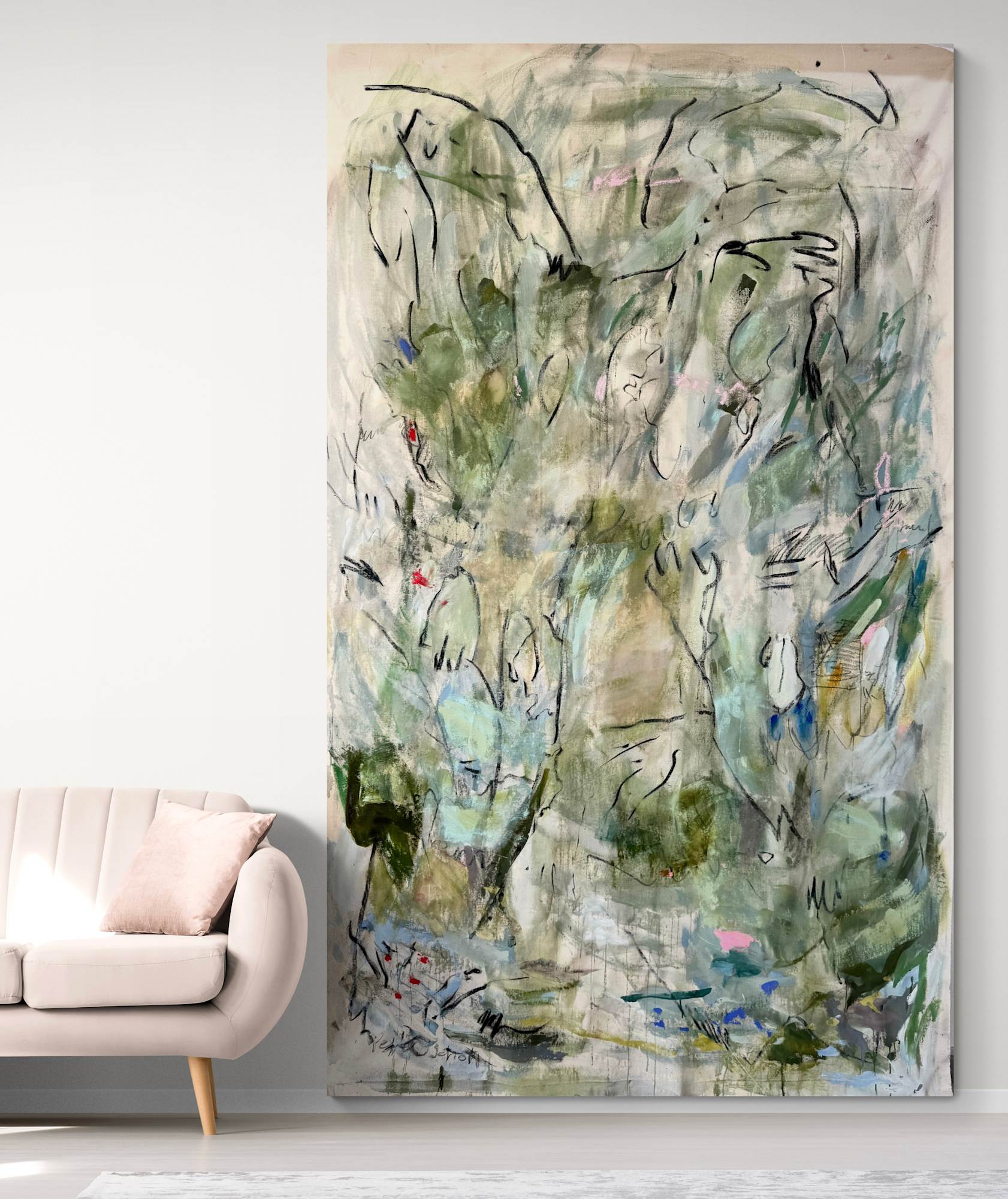 This artwork (Water Spirits by Petra Schott) displays an abstract composition filled with dynamic movement and natural hues. The piece is dominated by a symphony of greens, blues, and earthy tones, suggesting a visceral, almost untamed landscape. Delicate, swirling lines interweave with broader, gestural strokes, creating an impression of depth and texture. The faintly visible figures seem to emerge and recede into the canvas, imparting a dream-like quality. This subtle interplay between visibility and obscurity invites reflection and interpretation. The raw, unfinished edges and fluid brushwork accentuate the piece’s organic feel, evoking emotions of spontaneity and freedom. The artist skillfully balances chaos with coherence, crafting a vivid portrayal of nature’s complexity. This work stands out as an evocative exploration of form and color, compelling viewers to engage deeply with its mesmerizing intricacies.