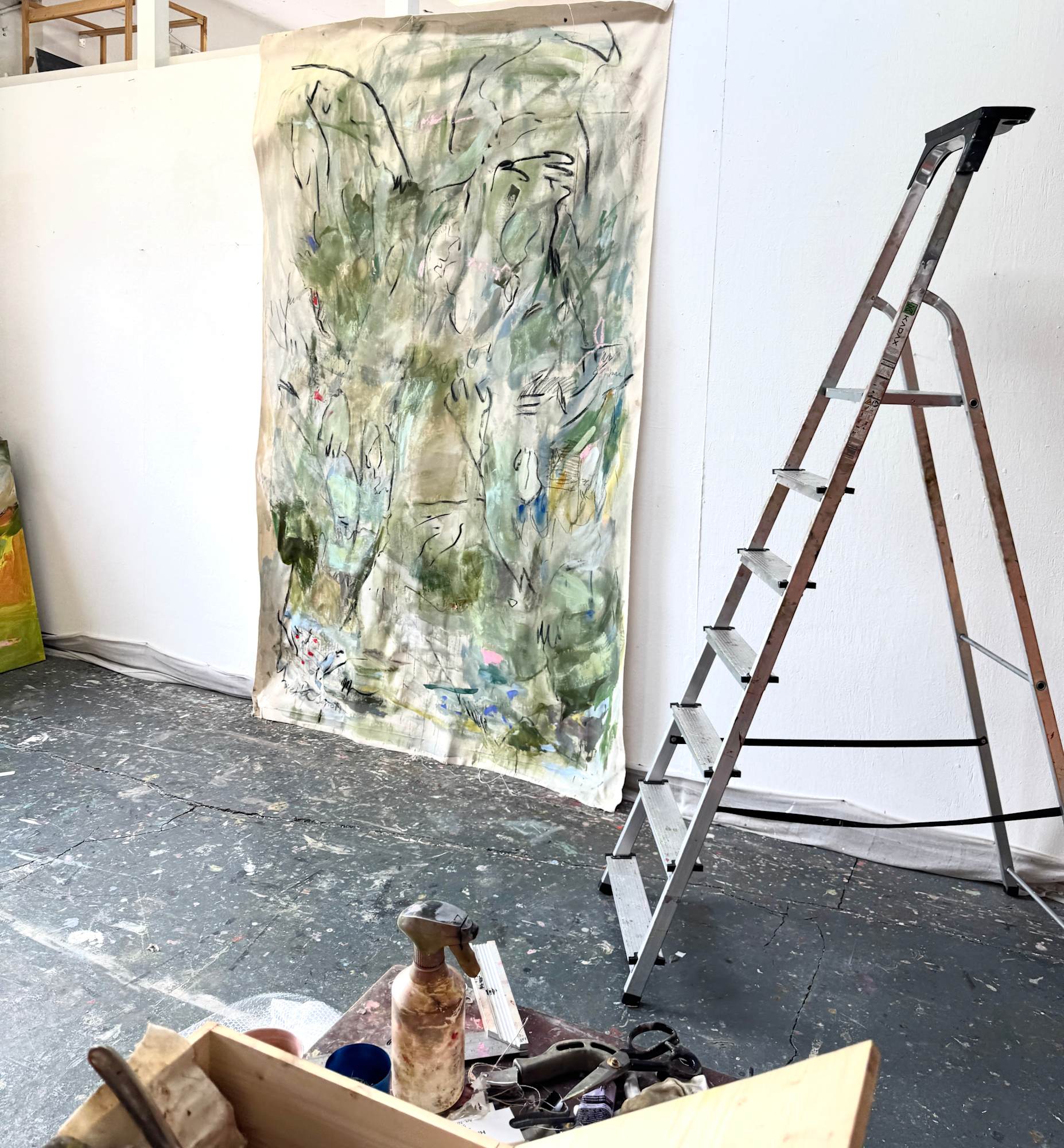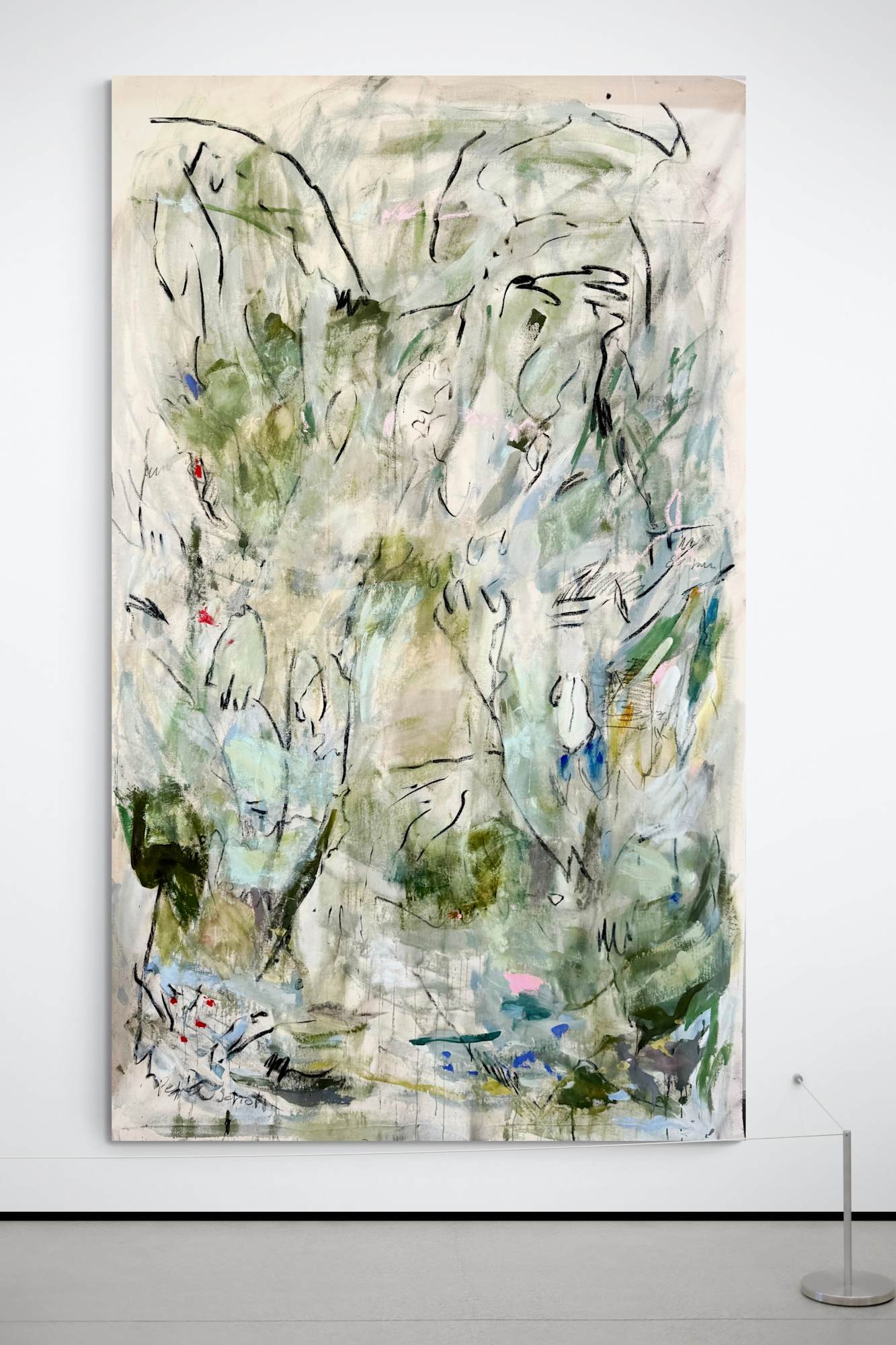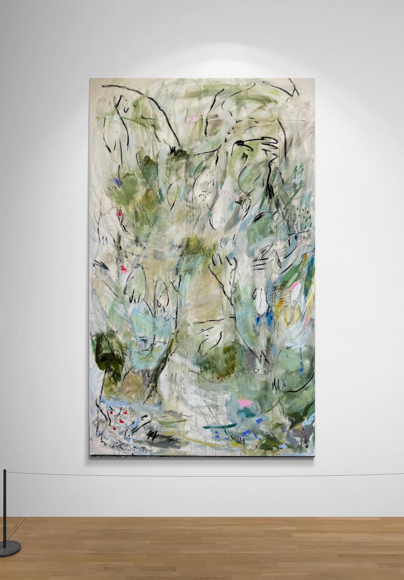 This artwork (Water Spirits by Petra Schott) displays an abstract composition filled with dynamic movement and natural hues. The piece is dominated by a symphony of greens, blues, and earthy tones, suggesting a visceral, almost untamed landscape. Delicate, swirling lines interweave with broader, gestural strokes, creating an impression of depth and texture. The faintly visible figures seem to emerge and recede into the canvas, imparting a dream-like quality. This subtle interplay between visibility and obscurity invites reflection and interpretation. The raw, unfinished edges and fluid brushwork accentuate the piece’s organic feel, evoking emotions of spontaneity and freedom. The artist skillfully balances chaos with coherence, crafting a vivid portrayal of nature’s complexity. This work stands out as an evocative exploration of form and color, compelling viewers to engage deeply with its mesmerizing intricacies.