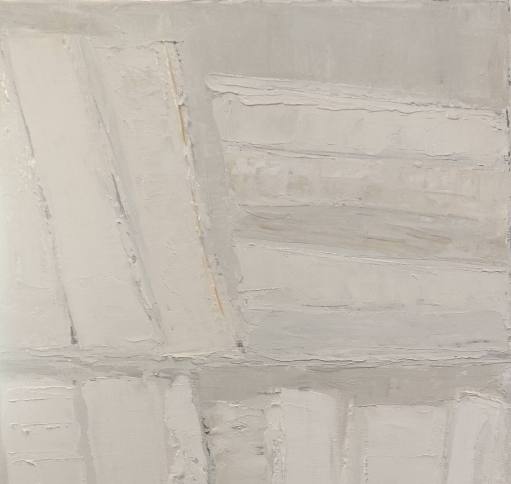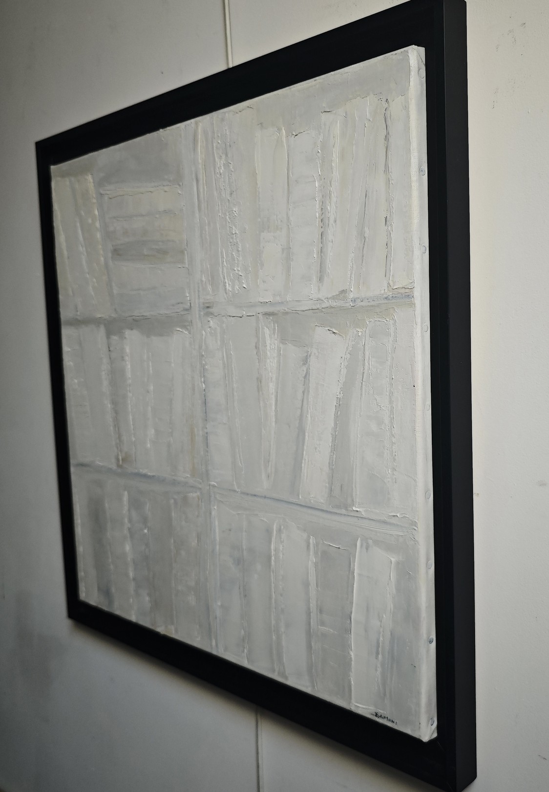 Witte bibliotheek, zeer materiaal bewerkt met olieverf en mes. De achtergrond is eerst bewerkt om de witten te laten opvallen. Dicht bij geometrische abstractie worden de boeken hier benadrukt dankzij de bijdrage van meerdere en opeenvolgende lagen. Reeks bibliotheken. Het werk is ingelijst met een Amerikaanse kist in zwart hout. De randen van het schilderij zijn geschilderd. Akoun gecertificeerde beoordeling. Reken op een goede maand drogen voor mogelijke levering, rond 20 december 2022.